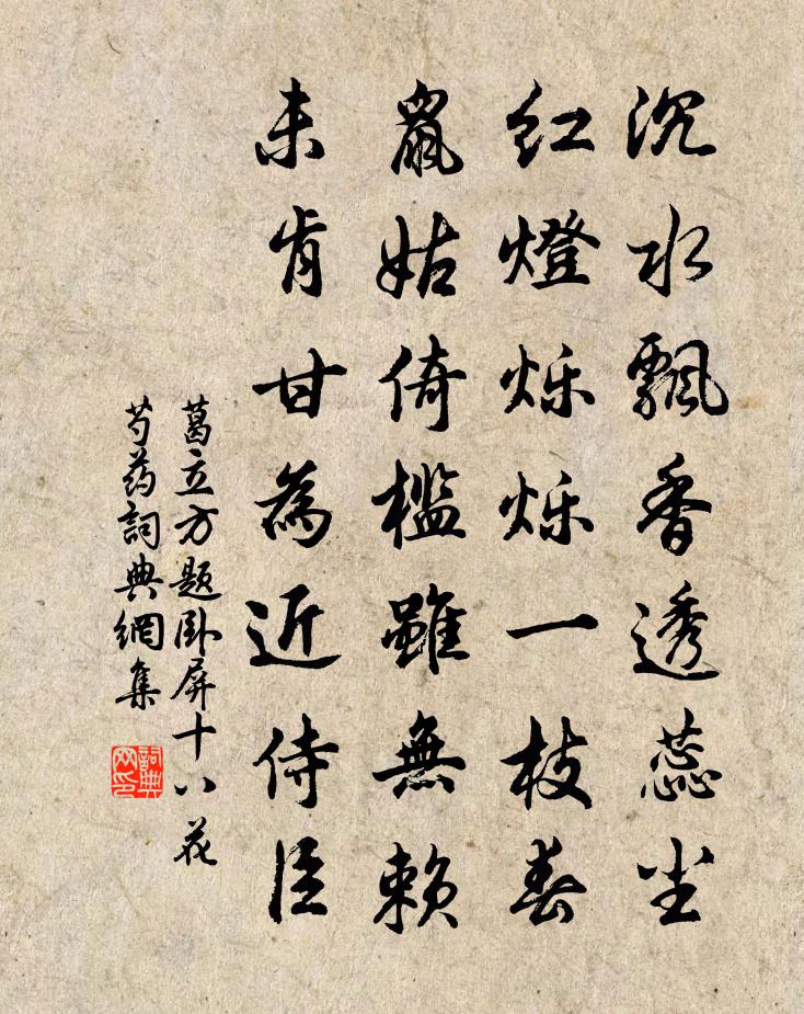 詩詞名句歷史字典書法欣賞書法字典國語詞典說文解字康熙字典古漢語字典標 題 作 者 詩 句 題臥屏十八花芍藥作者:葛立方 朝代:宋代題臥屏十八花芍藥原文沉水飄香透蕊塵,紅燈爍爍一枝春。鼠姑倚檻雖無賴,未肯甘為近侍臣。詩詞問答問:題臥屏十八花芍藥的作者是誰?答:葛立方問:題臥屏十八花芍藥寫於哪個朝代?答:宋代葛立方題臥屏十八花芍藥書法欣賞題臥屏十八花芍藥書法作品詩詞推薦送道友歸周文璞〔宋代〕浮雲起足下,是子欲歸家。藏室收芸蠹,丹房掃箭砂。時聞搗藥鳥,啼向款冬花。莫使山童去,驚飛逐亂鴉。和趙郎中捕蝗見寄次韻蘇軾〔宋代〕麥穗人許長,穀苗牛可沒。天公獨何意,忍使蝗蟲發。驅攘著令典,農事安可忽。我仆既胼胝,我馬亦款矻。飛騰贈劉仲堪王禹偁〔宋代〕劉生頗少秀,為學識根柢。丘軻有堂奧,試腳到階砌。楊墨恣荒榛,揮手欲芟薙。攜文訪謫居,趣向非權勢。對挹客中會友釋文珦〔宋代〕客塗方浩蕩,歲物正蕭條。相見江城暮,俱傷鬢髮凋。陰雲將變雪,寒水不成潮。明日還為別,離愁款易消。南津勝因院亭子陸游〔宋代〕南江平無風,如鏡新拂拭。漁舟不點破,瀲瀲千頃碧。闌乾西北角,雲散山爭出。坡陀競南走,翠入窗戶窄。江山言志文天祥〔宋代〕九垠化為魅,億醜俘為虜。既不能變姓名卒於吳,又不能髠鉗奴於魯。遠引不如四皓翁,高蹈不如仲連父。冥鴻墮永興觀胡銓〔宋代〕連雲宿麥團碧浪,綴草落花成錦窠,我來欲覓種桃者,獵獵空存庭下莎。詠馮昭儀當熊賈至〔唐代〕白羽插雕弓,霓旌動朔風。平明出金屋,扈輦上林中。逐獸長廊靜,呼鷹御苑空。王孫莫諫獵,賤妾解當熊。吏部二詞帖贊岳珂〔宋代〕薛在近世,意莊體葩。倣而肖耶,偶其好耶。筆動聖鑒,藝兼詞華。系詩崦藏,維以傳家。次韻無咎別後見寄陸游〔宋代〕平日杯行不解辭,長亭況是送君時。幾行零落僧窗字,何限流傳樂府詩。歸思恰如重醞酒,歡情略似欲殘棋。龍蛇子夜歌南朝民歌〔南北朝〕高山種芙蓉,復經黃檗塢。果得一蓮時,流離嬰辛苦。大衍易吟四十首方回〔宋代〕卦下觀一彖,卦中求六爻。今人僅知此,著眼未為高。宴餞逢寺丞口號喻良能〔宋代〕一扇清風自楚台,公堂蔥鬱玳筵開。旌幢映座千峰日,鼓吹喧天萬壑雷。秋水幾行揮玉箸,春蔥千指送金杯。甘棠送姚評事入蜀各賦一物得卜肆張九齡〔唐代〕蜀嚴化已久,沉冥空所思。嘗聞賣卜處,猶憶下簾時。驅傳應經此,懷賢倘問之。歸來說往事,歷歷偶心期。過應浩然先生墓戴表元〔宋代〕人間萬卷龐眉老,眼見堂堂入草萊。行客須當下馬過,故交誰復裹雞來。山花不語如聽講,溪水無情自薦哀。猶勝次韻宣州西園范成大〔宋代〕星芒垂耀筆床寒,河漢波流硯滴乾。棐幾松跗入三昧,一篇詩就一杯殘。漢陰驛與宇文十相遇,旋歸西川,因以贈別竇鞏〔唐代〕吳蜀何年別,相逢漢水頭。望鄉心共醉,握手淚先流。宿霧千山曉,春霖一夜愁。離情方浩蕩,莫說去刀州。登孤嶼楊蟠〔宋代〕把麾何所往,海上有名山。潮落魚堪拾,雲低雁可攀。一城仙島外,雙塔畫圖間。當路誰知己,天應賜我閒。華清宮三首崔櫓〔唐代〕草遮回磴絕鳴鑾,雲樹深深碧殿寒。明月自來還自去,更無人倚玉欄乾。障掩金雞蓄禍機,翠華西拂蜀雲飛。珠簾王師渡漢水經襄陽李百藥〔唐代〕導漾疏源遠,歸海會流長。延波接荊夢,通望邇沮漳。高岸沉碑影,曲漵麗珠光。雲昏翠島沒,水廣素濤揚。閱川名句推薦此曲有意無人傳,願隨春風寄燕然,憶君迢迢隔青天。李白《長相思三首·其二》 果仁者,人多畏,言不諱,色不媚。李毓秀《弟子規·親仁》 春風試手先梅蕊,頩姿冷艷明沙水。趙令畤《菩薩蠻·春風試手先梅蕊》 食之以時,用之以禮。孟子《孟子·盡心章句上·第二十三節》 世事茫茫難自料,春愁黯黯獨成眠。韋應物《寄李儋元錫》 獨立寒秋,湘江北去,橘子洲頭。 * 《沁園春·長沙》 過雨西風,數葉井梧愁舞。吳文英《荔枝香近·七夕》 春潮帶雨晚來急,野渡無人舟自橫。韋應物《滁州西澗》 箭徑酸風射眼,膩水染花腥。吳文英《八聲甘州·靈岩陪庾幕諸公游》 功名祗向馬上取,真是英雄一丈夫岑參《送李副使赴磧西官軍》