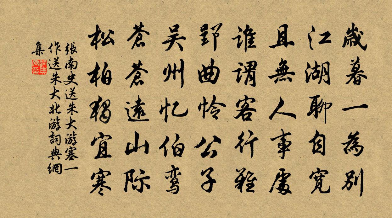 詩詞名句歷史字典書法欣賞書法字典國語詞典說文解字康熙字典古漢語字典標 題 作 者 詩 句 送朱大游塞(一作送朱大北游)作者:張南史 朝代:唐代原文歲暮一為別,江湖聊自寬。且無人事處,誰謂客行難。郢曲憐公子,吳州憶伯鸞。蒼蒼遠山際,松柏獨宜寒。詩詞問答問:《送朱大游塞(一作送朱大北游)》的作者是誰?答:張南史問:該詩寫於哪個朝代?答:唐代書法欣賞送朱大游塞(一作送朱大北游)書法作品注釋全唐詩:卷296_4詩詞推薦新蟬寇準〔宋代〕寂寂宮槐雨乍晴,高枝微帶夕陽明。臨風忽起悲秋思,獨聽新蟬第一聲。七言滑語聯句顏真卿〔唐代〕雨里下山蹋榆皮,——塗次偶作唐求〔唐代〕歲月客中銷,崎嶇力自招。問人尋野寺,牽馬渡危橋。為雨疑天晚,因山覺路遙。前程何處是,一望又迢迢。醉中信筆作四絕句既成懼觀者不知野人本心也陸游〔宋代〕過得一日過一日,人間萬事不須謀。鄰家幸可賒芳醞,紅蕊何曾笑白頭。春曉山行馬上口占武衍〔宋代〕路轉前山復後山,宿煙收盡薄生寒。吟鞭忽指松梢月,絕勝城中樓上看。齊天樂(湖上即席分韻得羽字)史達祖〔宋代〕鴛鴦花拂破苹花影,花低低趁涼飛去。畫裡移舟,詩邊就夢,葉葉碧雲分雨。芳游自許。過柳影閒波,水花平渚。齊天樂 寺內,時值端陽韓奕〔元代〕白頭尚舉齊眉案,相敬未忘賓禮。細數流年,平頭六十,恰好一周甲子。吾生貧賤,汝不厭糟糠,不嫌襤縷。□喜漁人趙希邁〔宋代〕問利問名總不知,生涯付與一輪絲。四時風月俱還我,萬頃煙波說向誰。霽後短蓑和笠曬,醉來長笛倚篷吹。此懷永嘉試院謝曾使君送酒樓鑰〔宋代〕一簾疎雨洗塵埃,滿架酴醿自在開。正恨烹茶殺風景,忽驚門外白衣來。紫騮馬徐陵〔南北朝〕玉鐙繡纏鬃。金鞍錦覆幪。風驚塵未起。草淺埒猶空。角弓連兩兔。珠彈落雙鴻。日斜馳逐罷。連翩還上東。和顏長官百詠漁父朱繼芳〔宋代〕推起篷窗抱月眠,三三兩兩柳邊船。不須聽說文王事,孤負漁竿八十年。再贈尋賢相士二首姚勉〔宋代〕逢人說相不求錢,春色湖邊一醉顛。眼法自高人幾看,不尋富貴只尋賢。景福東廂詩夜意司馬光〔宋代〕清夜四無嘩,深嚴上帝家。星翻珠綱白,斗掛玉樓斜。風靜虛成韻,霜輕未作花。還疑漢津客,浩蕩寄流槎。秋晚書懹陸游〔宋代〕頹然兀兀復騰騰,萬事惟除死未曾。無奈喜歡閒弄水,不勝頑健遠尋僧。喚船野岸橫斜渡,問路雲山曲折登。卻笑賦新繁周表權如詔亭閻灝〔宋代〕承家愛以義,能誨仕之忠。故里推全德,先生有古風。中郎銀組白,刺史錦衣紅。浩矣無窮樂,春熙醉笑中。餞平洲僧徐集孫〔宋代〕天地一身閒,袈裟裹亂山。聽經離竺寺,結制去雲間。包重懸詩稿。藤枯帶蘚斑。西風落梧葉,應又向西還。有感劉克莊〔宋代〕向來涉筆賦長楊,辱賜天家七寶床。黃吻少年評宿士,白頭宮女說先皇。走章台馬曾遊冶,攀鼎湖龍竟渺茫。縱使郊廟歌辭。享節愍太子廟樂章。武舞作佚名〔唐代〕武德諒雍雍,由來掃寇戎。劍光揮作電,旗影列成虹。霧廓三邊靜,波澄四海同。睿圖今已盛,相共舞皇風。賀師垣賜御書一德格天之閣牌並鍍金器皿青羅張嵲〔宋代〕恩詔新頒導從儀,夾塗無復走烏衣,競紆紫霧更袍色,仍有黃金上帶圍。翠幰翩翻風易暖,雕槃璀璨日爭輝。沙堤晚渡伊水韋述〔唐代〕悠悠涉伊水,伊水清見石。是時春向深,兩岸草如積。迢遞望洲嶼,逶迤亘津陌。新樹落疏紅,遙原上深碧。回瞻名句推薦一雙舞燕,萬點飛花,滿地斜陽。陳子龍《訴衷情·春遊》 攜手藕花湖上路。一霎黃梅細雨。朱淑真《清平樂·夏日游湖》 兒女此情同。往事朦朧。湘娥竹上淚痕濃。辛棄疾《浪淘沙·賦虞美人草》 亭亭畫舸系春潭,直到行人酒半酣。鄭文寶《柳枝詞》 夫愛人者,人必從而愛之;利人者,人必從而利之;惡人者,人必從而惡之;害人者,人必從而害之。墨子《墨子·15章 兼愛(中)》 一人興善,萬人可激宋濂、王褘《元史·列傳·卷五十六》 水流花謝兩無情,送盡東風過楚城。崔塗《春夕》 閣中帝子今何在?檻外長江空自流。王勃《滕王閣序》 博觀而約取,厚積而薄發蘇軾《稼說送張琥》 胡未滅,鬢先秋。淚空流。陸游《訴衷情·當年萬里覓封侯》