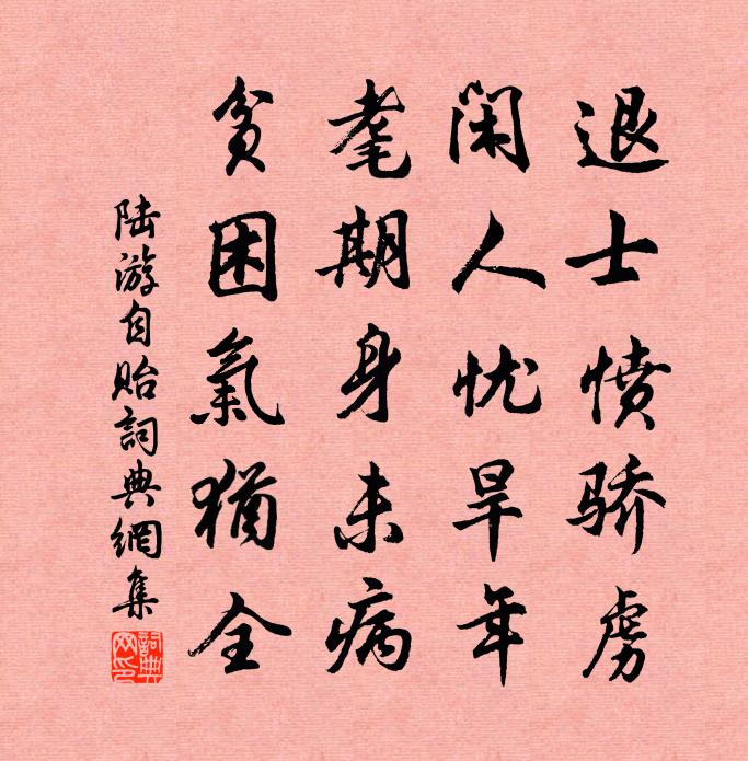 詩詞名句歷史字典書法欣賞書法字典國語詞典說文解字康熙字典古漢語字典標 題 作 者 詩 句 自貽作者:陸游 朝代:宋代自貽原文退士憤驕虜,閒人憂旱年。耄期身未病,貧困氣猶全。詩詞問答問:自貽的作者是誰?答:陸游問:自貽寫於哪個朝代?答:宋代問:陸游的名句有哪些?答:陸游名句大全陸游自貽書法欣賞自貽書法作品詩詞推薦讀素問十六首方回〔宋代〕三品別貴賤,四制寄奇偶。主病則用之,上藥或弗取。得士寒畯可,量才世胄否。豕苓雞壅言,吾亦聞莊叟。和王圜中道上初見梅花二首王之道〔宋代〕馬頭驚見一枝新,夾道歡呼擁吏民。咫尺招提雞黍約,不妨同醉萬家春。返山居王鎡〔宋代〕草廬夢醒舊南陽,萬事灰心笑一場。齒漱石泉消酒渴,手挼草藥染衣香。菊花夜白因添月,柿葉秋紅不是霜。大鴉贈徐中書望終南山歌王維〔唐代〕晚下兮紫微。悵塵事兮多違。駐馬兮雙樹。望青山兮不歸。題史髯詞卷二首陳造〔宋代〕方朔歲星仍客星,竊桃他日太狂生。幾時又泛靈槎去,平掇天孫翠纖成。舟中讀書宋琬〔清代〕久拋青簡束行幐,白鳥蒼蠅甚可憎。身是蠹魚酬夙債,黃河浪里讀書燈。耕甫歸書約信二字為別二首杜范〔宋代〕水失其防,一決莫止。人心惟危,殆亦若此。曾子之守,傳羽在是。以約失之,蓋亦鮮矣。古意六首·其二艾性夫〔宋代〕採蓮莫採花,採花損空房。留房結青子,種作明年香。大海洞天留題龍友〔宋代〕每見杭人說洞霄,恨無雙翼興飄飄。恍觀石勢如蟠獸,靜聽泉聲若春韶。既想洞天多窈妙,更知仙境絕塵囂。官游沁園春(次韻四友吳會卿次子西上)馮取洽〔宋代〕我愛□君,結屋並山,友松竹梅。有倦遊孤劍,暫懸素壁,醉吟行履,時印蒼苔。得失不驚,知恬交養,浩浩胸中奉和御製九天司命降臨夏竦〔宋代〕緝熙綿宇肅邊疆,蕃祉紛綸顯阜昌。真馭告期通夢寐,嚴宸精意潔壇場。青煙漏上盈中禁,碧輦宵分下彼蒼。照地登光明頂胡與高〔清代〕登臨不用挽藤蘿,絕頂光明霽色多。雲過匡廬飛紫蓋,嵐拖天目掃青娥。忽分二海成孤嶼,細數千峰亂放荷。下界暮春道中聞蟬張嵲〔宋代〕西山日落東山明,長風吹花客心驚。房州氣候不可解,嫩葉暗中蟬亂鳴。羌村三首杜甫〔唐代〕崢嶸赤雲西,日腳下平地。柴門鳥雀噪,歸客千里至。妻孥怪我在,驚定還拭淚。世亂遭飄蕩,生還偶然遂。鄰人五月二十八日塘頭小集呈同游劉元煇楊復之方回〔宋代〕山中五日寒,霖雨久不止。稍稍雲意開,駸駸日色美。駕言出東城,道傍玩流水。胸次積滯悶,一見似可洗。問訊老棕舒岳祥〔宋代〕馬鬃頻剪新心吐,鳳翅初開勁葉森。更有木魚三百尾,山僧鍋里煮黃金。王通徐鈞〔宋代〕太平十二策空陳,得似河汾講道真。縷指隋唐名將相,多君交友與門人。送絳州郭參軍盧綸〔唐代〕炎天故絳路,千里麥花香。董澤雷聲發,汾橋水氣涼。府趨隨宓賤,野宴接王祥。送客今何幸,經宵醉玉堂。與蔡吏部林直院別江樓方岳〔宋代〕又拋蓑笠出山來,那得江鷗不見猜。一醉真成吞溟涬,三人曾共住蓬萊,翰林詞伯玉為骨,直指繡衣霜作台。莫笑題武夷戚繼光〔明代〕一劍橫空星斗寒,甫隨平北復征蠻。他年覓得封侯印,願學幽人住此山。名句推薦上有青冥之長天,下有淥水之波瀾李白《長相思·其一》 何時詔此金錢會,暫醉佳人錦瑟旁。杜甫《曲江對雨》 千呼萬喚始出來,猶抱琵琶半遮面。白居易《琵琶行 / 琵琶引》 愛敬盡於事親,而德教加於百姓,刑於四海孔子及其弟子《孝經·天子》 如今但暮雨,蜂愁蝶恨,小窗閒對芭蕉展。呂渭老《薄倖·青樓春晚》 昔年多病厭芳尊,今日芳尊惟恐淺。錢惟演《木蘭花·城上風光鶯語亂》 報答春光知有處,應須美酒送生涯。杜甫《江畔獨步尋花七絕句》 綠淨春深好染衣。際柴扉。賀鑄《釣船歸·綠淨春深好染衣》 蠶無夏織桑充寨,田廢春耕犢勞軍。杜荀鶴《題所居村舍》 共說春來春去事,多時。一點愁心入翠眉。晏幾道《南鄉子·花落未須悲》