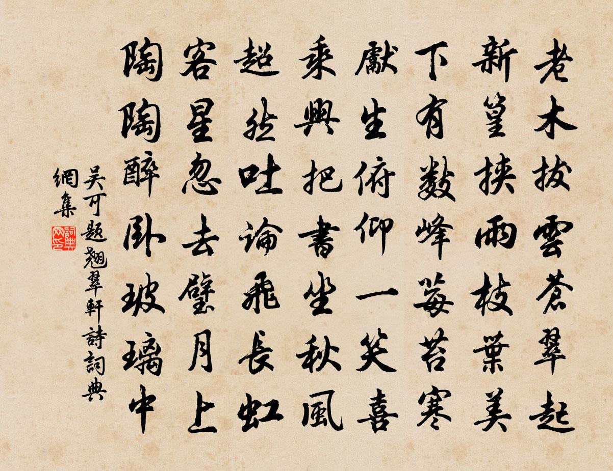 詩詞名句歷史字典書法欣賞書法字典國語詞典說文解字康熙字典古漢語字典標 題 作 者 詩 句 題翹翠軒詩作者:吳可 朝代:宋代題翹翠軒詩原文老木拔雲蒼翠起,新篁挾雨枝葉美。下有數峰莓苔寒,先生俯仰一笑喜。乘興把書坐秋風,超然吐論飛長虹。客星忽去璧月上,陶陶醉臥玻璃中。詩詞問答問:題翹翠軒詩的作者是誰?答:吳可問:題翹翠軒詩寫於哪個朝代?答:宋代吳可題翹翠軒詩書法欣賞題翹翠軒詩書法作品詩詞推薦晉門惠帝周曇〔唐代〕蛙鳴堪笑問官私,更勸飢人食肉糜。蒙昧萬機猶婦女,寇戎安得不紛披。贈徐月道士張簡〔宋代〕病骨癯然鶴一般,相陪夜坐萬松間。乾坤清氣皆歸月,湖海高人半在山。吟苦心從天漢轉,琴清身與嶺雲閒。杯茶次韻清虛喜子瞻得常州黃庭堅〔宋代〕喜色侵淫動搢紳,俞音下報謫仙人。驚回汝水間關夢,乞與江天自在春。罨畫初游冰欲泮,浣花何處月還新。涼州行香子王吉昌〔元代〕震內藏金,金乙成姻。假沖和、雷電交陳。龍吟虎嘯,幽谷澄神。向杳冥中,風雲里,傲全身。煙雨ㄨㄨ,芝草芽文宣王及其弟子贊宋高宗〔宋代〕在昔石邑,能知所尊。懋依有德,克述無言。鼓篋槐市,揚名里門。此道久視,彼美長存。斗南竹林祠歌孫應時〔宋代〕君不漆見唐河諸漆將兵馬回漆,河朔百城門不開。邊烽夜舉天子怒,六龍曉發鳴春雷。金陵玉壘中道惑,澶淵一擲東坡八首蘇軾〔宋代〕良農惜地力,幸此十年荒。桑柘未及成,一麥庶可望。投種未逾月,覆塊已蒼蒼。農父告我言,勿使苗葉昌。君欲和張功父聞子規楊萬里〔宋代〕久雨今朝忽作晴,老人懷抱不勝清。仲宣久作登樓賦,望帝更吟當殿聲。春去春來渾是夢,花開花落若為情。歸心舊作感懷宗澤〔宋代〕關中黃壤黑壤,大是邦家利源。古者畝收十一,誰興歲取十千。不用府無虛月,藏之斯民裕然。沁園春 佳人楊弘道〔元代〕揩汗殘妝,咀梅顰黛,楚腰如束。為蔗漿頻飲,全疏綠蟻,繡床慵傍,閒倚青奴。解慍風來,忘憂花發,庭樹扶疏句王繁〔宋代〕萬山飛不出,守令最相親。偈頌七十六首釋師範〔宋代〕徑山結夏,不論功過。飯來展缽孟,困則伸腳臥。縱有千人萬人,只消一個半個。豈不見流支要打胡達磨。句袁仲素〔宋代〕一松五鳳雛。雜曲歌辭。苦熱行王維〔唐代〕赤日滿天地,火雲成山嶽。草木盡焦卷,川澤皆竭涸。輕紈覺衣重,密樹苦陰薄。莞簟不可近,絺綌再三濯。思出和費君樂游山之什周敦頤〔宋代〕雲樹岩泉景盡奇,登臨深恨訪尋遲。長樓未得於何記,猶有君能雅和詩。冬日放言二十一首張耒〔宋代〕我初謫官時,帝問司酒神。曰此好酒徒,聊給酒養真。去國一千里,齊安酒最醇。失火而遇雨,仰戴天公仁。送洪右史赴召三首喻良能〔宋代〕長公前日辭揆塗,少公今日被鋒車。路人共指拜內相,天子久欲登鴻儒。黃麻端擬似經訓,金蓮不獨榮傳呼。如聞和劉右司見寄六絕一律吳潛〔宋代〕小兒亦解挽公留,知有人閒第一流。老我相思無盡藏,臨風一日幾搔頭。乾藏釋普濟〔宋代〕惡語重重放出門,只圖一個不知恩。二千年事難遮覆,動便隨人腳後跟。中秋日簡同盟諸公廖行之〔宋代〕風囊嘯谷獵塵衫,雨鬣行天駕玉驂。一洗蠻煙渾逐北,全提商令似征南。佳時不負中秋約,雙桂能同一夜談。我亦名句推薦馬嘶經戰地,雕認打圍山。王鎡《塞上曲》 白水明田外,碧峰出山後。王維《新晴野望》 昔日芙蓉花,今成斷根草。李白《妾薄命》 為善則流芳百世,為惡則遺臭萬年。程登吉《幼學瓊林·卷三·人事》 池台竹樹三畝餘,至今人道江家宅。劉禹錫《金陵五題·並序》 時霎清明,載花不過西園路。吳文英《點絳唇·時霎清明》 天命之謂性;率性之謂道子思《中庸·第一章》 失天下也,失其民也;失其民者,失其心也。孟子《孟子·離婁章句上·第九節》 尊賢使能,俊傑在位,則天下之士皆悅而願立於其朝矣。孟子《孟子·公孫丑章句上·第五節》 細草微風岸,危檣獨夜舟。杜甫《旅夜書懷》