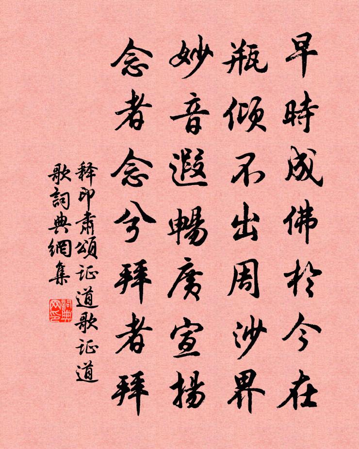 詩詞名句歷史字典書法欣賞書法字典國語詞典說文解字康熙字典古漢語字典標 題 作 者 詩 句 頌證道歌證道歌作者:釋印肅 朝代:宋代頌證道歌證道歌原文早時成佛於今在,瓶傾不出周沙界。妙音遐暢廣宣揚。念者念兮拜者拜。詩詞問答問:頌證道歌證道歌的作者是誰?答:釋印肅問:頌證道歌證道歌寫於哪個朝代?答:宋代釋印肅頌證道歌證道歌書法欣賞頌證道歌證道歌書法作品詩詞推薦金陵道陸龜蒙〔唐代〕北雁行行直,東流澹澹春。當時六朝客,還道帝鄉人。西遊鹹陽中詩陰鏗〔南北朝〕上林春色滿。鹹陽遊俠多。城斗疑連漢。橋星象跨河。影里看飛轂。塵前聽遠珂。還家何意晚。無處不經過。水龍吟(和韻)李曾伯〔宋代〕歸來袖手江湖,不妨左右持螯白。涼宵幸對,一輪端正,娟娟秋色。萬宇冰清,千林霜縞,更無雲隔。對金莖露冷縱步湘西林之奇〔宋代〕今朝不易得天晴,閒過江西取意行。忽然林外見山色,又向橋邊聞水聲。綠竹長松間桃李,天然翠幕圍羅綺。日暮題點易窗道人蘇門遺嘯陳杰〔宋代〕書來草木吾臭味,詩有膽氣非黃冠。清溪研露一雙鶴,蘇門嘯空千仞鸞。愁連青燐引觸醉,憤入白虹提劍看。誰識行香子 贈蓬萊李一翁王處一〔元代〕說修行,蒙見許。端的回心,戀甚妻兒女。好漢不教人數賦。苦海奔波,覓個前程路。脫塵寰,出幽府。七祖先亡翠羽吟蔣捷〔宋代〕泛言仙,似乎寡味,越調之曲與梅花宜,羅浮梅花,真仙事也。演而成章,名翠羽吟。紺露濃。映素空。樓觀峭玲水調歌頭姬翼〔元代〕漂泊異鄉客,踏碎軟紅塵。歸來處處庭戶,簾幕卷黃昏。南北東西行色,費盡芒鞋多少,何處覓天根。光曜問何有林大年殿直金輪院讀書有寄強至〔宋代〕仕到監州興漸多,人生四十未蹉跎。自嫌朱紱生門調,直要青雲取世科。新喜雁名傳日下,暫題試筆寄岩阿。山翁題宣州開元寺張喬〔唐代〕誰家煙徑長莓苔,金碧虛欄竹上開。流水遠分山色斷,清猿時帶角聲來。六朝明月唯詩在,三楚空山有雁回。達理瑞鷓鴣(席上)郭世模〔宋代〕傾城一笑得人留。舞罷嬌娥斂黛愁。明月寶鞲金絡臂,翠瓊花珥碧搔頭。晴雲片雪腰支裊,晚吹微波眼色秋。清露奉和郎中遊仙山四瀑泉兼寄李吏部包秘監趙婺州齊處州戴公懷〔唐代〕今日永嘉守,復追山水游。因尋莽蒼野,遂得軒轅丘。訪古事難究,覽新情屢周。溪垂綠筱暗,岩度白雲幽。過石和仲固胡寅〔宋代〕多謝春風吹雨晴,出遨今日計初程。去隨碧澗褵褷上,歸與閒雲澹沱行。順理以觀皆有趣,會心之樂最難名。山間皇雅十首《耆武》三章尹洙〔宋代〕帝嗟汙邦,久罹於兵。或暴下以征,或敷虐以刑。予命中典,協於圖經。民服德音,室家以寧。贈吳圓(抒情詩)李曜〔唐代〕經年理郡少歡娛,為習干戈間飲徒。今日臨行盡交割,分明收取媚川珠。楚江夜懷寇準〔宋代〕西風生遠水,蕭颯度吟台。明日夜還滿,故人秋未來。寒蛩啼暗壁,敗葉下蒼苔。誰念空江外,年年首重回。挽方德潤寶學三首劉克莊〔宋代〕晚賜延和對,言公去國深。遂良垂白髮,臣甫抱丹心。馳驛無銀信,移麾有玉音。遙知遺奏上,未免動宸襟。西江月曹勛〔宋代〕霞綺濃披翡翠,晨光巧上珊蝴。丹林偏許下清都。香占深岩煙雨。秋到九華宮殿,赭袍紅借繁珠。廣寒桂與世花殊留題融州老君岩劉誼〔宋代〕鑿成岩穴鬼工難,中有神仙自往還。不見桃花開落處,祇隨流水到人間。謝人送白山茶花二首張鎡〔宋代〕韻勝初聞不記年,偶逢俄在軟紅邊。山礬不遇南昌老,爭得嘉名亞水仙。名句推薦還卿一缽無情淚,恨不相逢未剃時。蘇曼殊《本事詩十首·選二》 聰明了一世,憎懂在一時。馮夢龍《警世通言·卷三》 記得別伊時,桃花柳萬絲。納蘭性德《菩薩蠻·新寒中酒敲窗雨》 湘女歸魂,佩環玉冷無聲,凝情誰訴。吳文英《過秦樓·黃鐘商芙蓉》 舉頭望明月,低頭思故鄉。李白《靜夜思》 低頭弄蓮子,蓮子清如水佚名《雜曲歌辭·西洲曲》 明君用人,如大匠用材,隨其巨細長短,以施規矩繩墨。宋濂、王褘《元史·列傳·卷四十四》 射人先射馬,擒賊先擒王。杜甫《前出塞九首·其六》 鳳簫聲斷月明中,舉手謝、時人慾去。蘇軾《鵲橋仙·七夕送陳令舉》 白日光天兮無不曜,江左 一隅獨未照。魏收《魏書·列傳·卷四十四》