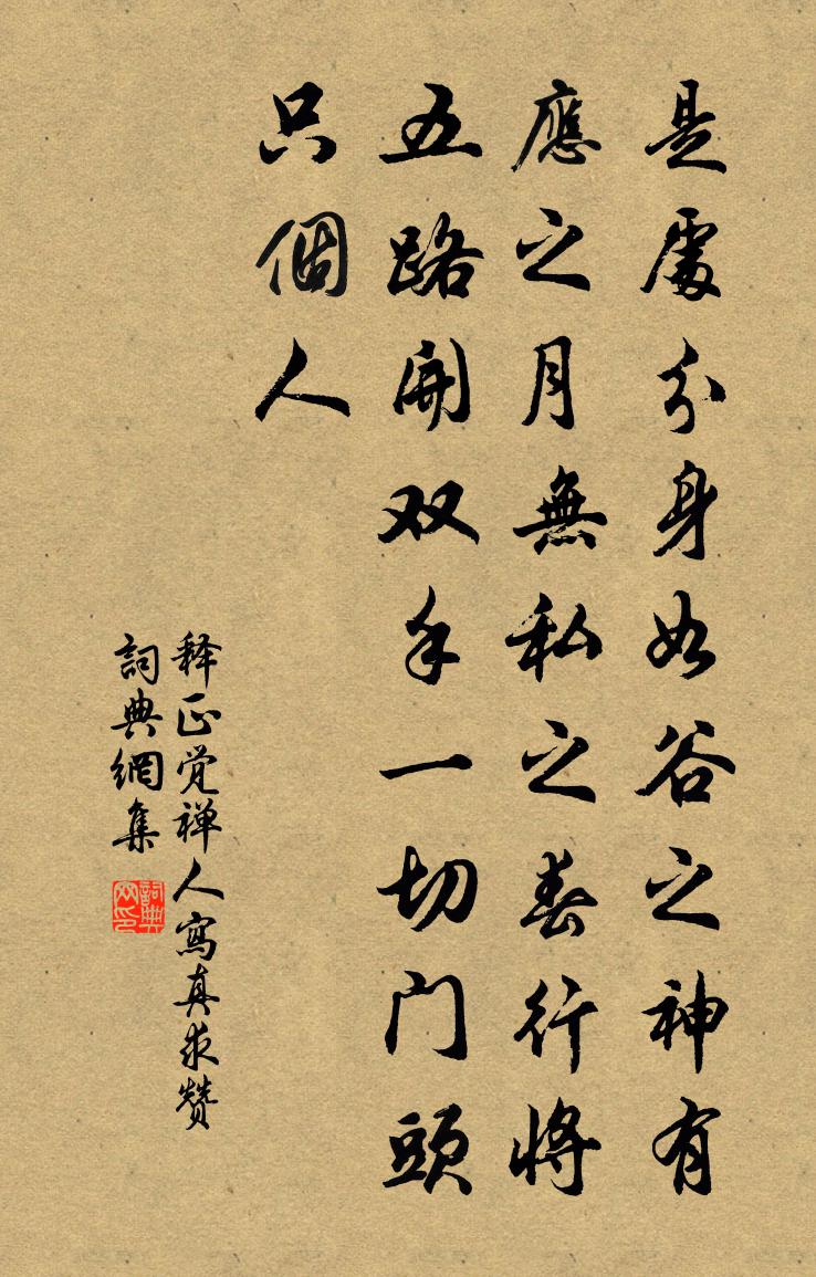 詩詞名句歷史字典書法欣賞書法字典國語詞典說文解字康熙字典古漢語字典標 題 作 者 詩 句 禪人寫真求贊作者:釋正覺 朝代:宋代禪人寫真求贊原文是處分身,如谷之神。有應之月,無私之春。行將五路開雙手,一切門頭只個人。詩詞問答問:禪人寫真求贊的作者是誰?答:釋正覺問:禪人寫真求贊寫於哪個朝代?答:宋代釋正覺禪人寫真求贊書法欣賞禪人寫真求贊書法作品詩詞推薦次韻陶節推問疾項安世〔宋代〕酒病詩狂失已多,之人未棄肯來過。悔將蟲篆疲鎪刻,旋講熊經學按摩。容我力湔盧駱體,與君同赴閔顏科。瑤琴踏莎行柴元彪〔宋代〕淺柳平蕪,亂煙疏雨。雁聲叫徹蘆花渚。亭前落葉又西風,斷送離懷無著處。切切歸期,盈盈尺素。斷魂正在西興春詠陸機〔魏晉〕節運同可悲。莫若春氣甚。和風未及燠。遺涼清且凜。春日偶成二首陳著〔宋代〕烏兔催更日夜番,獨於衰朽尚相存。世情富貴鮑魚市,老眼風流麻鳥村。牢立詩肩撐雨屋,施營酒料續春樽。芒鞋彭城三詠之三歌風台詞賀鑄〔宋代〕漢祖高風百尺台,千年客土生蒿萊。何窮人事水東去,如故地形山四來。江淮猶沸鯨鯢血,八十一車枉歸轍。白叟詠史上伏生陳普〔宋代〕鄧氏銅錢張武金,至公終淺愛終深。東西兩子皆稱蹕,未饜憐兒老嫗心。鹿鳴席上送諸先輩詩晁說之〔宋代〕周室賓興綺席陳,漢家勸駕禮還申。鶯遷同谷煙霞喜,鯉化瓊林雨露新。日御駸駸須六轡,奎文燁燁自三秦。先應別江上一二友生譚用之〔唐代〕國風千載務重華,須逐浮雲背若耶。無地可歸堪種玉,有天教上且乘槎。白綸巾卸蘇門月,紅錦衣裁御苑花。他日同王萬里山行程公許〔宋代〕邂逅非宿期,意得得奇眺。三生湖山緣,青眼不改舊。飛榜瀾湖光,躡屐梯雲嶠。玉立緱嶺仙,灑落我同調。沖懷賀新郎葉夢得〔宋代〕睡起啼鶯語。掩青苔、房櫳向晚,亂紅無數。吹盡殘花無人見,惟有垂楊自舞。漸暖靄、初回輕暑。寶扇重尋明月丁端叔送海錯以詩來用韻酬之陳傅良〔宋代〕澤魚山豕各忘年,味可勝窮總所便。堪笑荊吳相俎豆,遂令蠻觸自矛鋋。食無誤蟹車同軌,貢不徵蚶澤漏泉。我在久雨閒悶對酒偶吟白居易〔唐代〕淒悽苦雨暗銅駝,裊裊涼風起漕河。自夏及秋晴日少,從朝至暮悶時多。鷺臨池立窺魚笱,隼傍林飛拂雀羅。賴有姜秘監輓詞樓鑰〔宋代〕久聞政績最淮淝,鄮嶺循良親見之。梓里尚遺前日愛,棠陰還長舊年枝。釣璜方兆非熊卜,曳杖俄興梁木悲。千里孝宗明堂前朝獻景靈宮八首真宗〔宋代〕歲逢有年,月旅無射。我將我鄉,如幾如式。肅爾臣工,諧爾金石。本原休功,垂裕罔極。洛中偶作(自此後在東都作)白居易〔唐代〕五年職翰林,四年蒞潯陽。一年巴郡守,半年南宮郎。二年直綸閣,三年刺史堂。凡此十五載,有詩千餘章。境興欒城范成大〔宋代〕頹垣破屋古城邊,客傳蕭寒爨不煙。明府牙緋危受杖,欒城風物一悽然!露天曉角辛棄疾〔宋代〕吳頭楚尾,一棹人千里。休說舊愁新恨,長亭樹、今如此!宦遊吾倦矣,玉人留我醉。明日萬花寒食,得且住、為和經略直閣寺丞贈劉升之蟄龍巖二首唐弼〔宋代〕倚天寒碧鎖嵌空,咫尺丹霄有路通。莫向明時縮頭角,風雲只在笑談中。釣台章岷〔宋代〕乘興訪遺基,扁舟宿煙渚。水淨寫天形,山空答人語。風篁自成韻,霜葉紛如雨。寒亭暮響清,飢猿夜啼苦。疑將送陝府王大夫白居易〔唐代〕金馬門前回劍珮,鐵牛城下擁旌旗。他時萬一為交代,留取甘棠三兩枝。名句推薦照花前後鏡,花面交相映。溫庭筠《菩薩蠻·小山重疊金明滅》 榮非己莫恃,禍惟他勿縱。來俊臣《羅織經·瓜蔓卷第十二》 今人不見古時月,今月曾經照古人。李白《把酒問月·故人賈淳令予問之》 天行有常,不為堯存,不為桀亡。應之以治則吉,應之以亂則凶。荀子《荀子·天論》 不期修古,不法常可。韓非及後人《韓非子·五蠹》 更深人去寂靜,但照壁孤燈相映。周邦彥《關河令·秋陰時晴漸向暝》 弟子入則孝,出則弟,謹而信,泛愛眾,而親仁,行有餘力,則以學文。孔子弟子《論語·學而篇》 只應守寂寞,還掩故園扉。孟浩然《留別王侍御維 / 留別王維》 眼覷著災傷教我沒是處,只落得雪滿頭顱。張養浩《一枝花·詠喜雨》 芙蓉如面柳如眉,對此如何不淚垂。白居易《長恨歌》