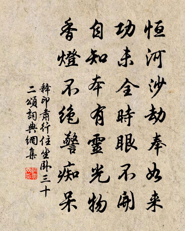 詩詞名句歷史字典書法欣賞書法字典國語詞典說文解字康熙字典古漢語字典標 題 作 者 詩 句 行住坐臥三十二頌作者:釋印肅 朝代:宋代行住坐臥三十二頌原文恆河沙劫奉如來,功未全時眼不開。自知本有靈光物,香燈不絕警痴呆。詩詞問答問:行住坐臥三十二頌的作者是誰?答:釋印肅問:行住坐臥三十二頌寫於哪個朝代?答:宋代釋印肅行住坐臥三十二頌書法欣賞行住坐臥三十二頌書法作品詩詞推薦懷安王宰索得助詩奉題一首高翥〔宋代〕亭在唐賢好句中,闌乾六曲盡春風。不知腳下是官府,但見面前如渚宮。江水逢潮音激切,山雲因雨思溟濛。主人山丹花二首佚名〔宋代〕煙紅露緣曉風香,燕舞鶯啼春日長。誰道使君貧且老,繡屏錦帳咽笙簧。剛顯廟鄭昂〔宋代〕公昔隱居烏石岡,老觀禪師同道場。法主懶安共徜徉,李薛咨參互擊揚。擺脫利慾心清涼,是以能全此至剛。黃巢小桃源張師夔〔宋代〕策杖西行路曲斜,一溪春水野人家。武陵勝處今何在,不問桃源問落花。和文明主簿叔見寄之韻二首楊萬里〔宋代〕黃九陳三外,諸人總解詩。甘心休作許,苦語竟何為。所向公同我,何緣樣入時。從來大小院,一笑更誰知。青山汪若楫〔宋代〕萬木驚秋各自殘。蛩聲扶砌訴新寒。西風不是吹黃落,要放青山與客看。戲倣韓致光體張鎡〔宋代〕意懶風前側帽檐,落梅紅在麥修纖。歸家說盡單行處,可奈溫香翡翠奩。王承檢掘得墓銘佚名〔唐代〕車道之北,邽山之陽。深深葬玉,鬱郁埋香。刻斯貞石,煥乎遺芳。地變陵谷,嶮列城隍。乾德丙年,壞者合郎。寄岑迪林逋〔宋代〕久辜才術向吾朝,公罪應該洗雪條。佐邑舊曾居府寺,轉官新合入京僚。門庭冷落閒中住,僮僕生疏賤價招。別後臨江仙佚名〔宋代〕要問南枝訊息早,一陽恰喜方回。望前二日驗雲台。祥光呈五色,瑞彩上三台。生機一脈何嘗息,正看用世真才。夏雨陸游〔宋代〕清風起湖濱,急雨來天末。蚊蠅遽退聽,松竹例蘇活。奇聲集空庭,爽氣生細葛。素秋雖尚遙,聊喜寬肺渴。資水橋張方〔宋代〕二里橋頭車馬行,靈龜背後玉龍橫。漲瀧往日驚河伯,砥柱千年要石兄。資水右旋江會合,天台西直卦文明。吾心江舟撁夫有唱湖州歌者殊動家山之想賦吳歌行袁說友〔宋代〕我家苕霅邊,更更聞夜船。夜船聲欸乃,腸斷愁不眠。一聲三四咽,掩抑含淒切。宛轉斷復連,儘是傷離別。兩月憶秦娥汪元量〔宋代〕雪霏霏。薊門冷落人行稀。人行稀。秦娥漸老,著破宮衣。強將纖指按金徽。未成曲調心先悲。心先悲。更無言語裒集詩藁釋文珦〔宋代〕吾學本經論,上之契無為。書生習未忘,有時或吟詩。興到即有言,長簡訊所施。盡忘工與拙,往往不修辭。唯覺胡原仲正字特改官除宮觀館中置酒餞別會者七周必大〔宋代〕西伯王業興,海濱歸二老。漢家念羽翼,坐致商山皓。恭惟陛下聖,尊德繼雍鎬。先生學孔孟,不但遺編抱。致身次韻謝處州鄉人二首項安世〔宋代〕聽說江湖萬里身,十年流轉狎波神。鄉心只羨秋鷹爭,世味如何臘蟻醇。耳識吳音疑故舊,眼看南士寬尖新。袖中深居雜興六首林逋〔宋代〕薄夫何苦事奸奸,一室琴書自解顏。峰後月明秋嘯去,水邊林影晚樵還。文章敢道長於古,光景渾疑剩卻閒。多少喜雨歌為宋太守賦王冕〔元代〕南州六月旱土赤,炎官火傘行虛空。田疇圻裂河海涸,萬物如在紅爐中。桔槔不用計已梏,農民踏踏愁歲凶。蓬萊玩丹砂 自詠馬鈺〔元代〕昔日施為狡猾心。聞人活路向前侵。暗生荊棘鬧如林。不顧傷神並損氣,欲求積玉更堆金。行屍走骨作知音。名句推薦自勝之謂強。韓非及後人《韓非子·喻老》 念碎劈芳心,縈思千縷,贈將幽素,偷翦重雲。吳文英《風流子·黃鐘商芍藥》 寵錫從仙禁,光華出漢京。張九齡《奉和聖制送尚書燕國公赴朔方》 冥冥寒食雨,客意向誰親?劉一止《冥冥寒食雨》 昨夜斗回北,今朝歲起東。孟浩然《田家元日》 故仁莫大於愛人,智莫大於知人。文子《文子·卷七·微明》 舍心腹而順手足羅貫中《三國演義·第二十三回》 江南可採蓮,蓮葉何田田。佚名《江南》 江山故宅空文藻,雲雨荒台豈夢思。杜甫《詠懷古蹟五首·其二》 人善被人欺,馬善被人騎。佚名《增廣賢文·上集》