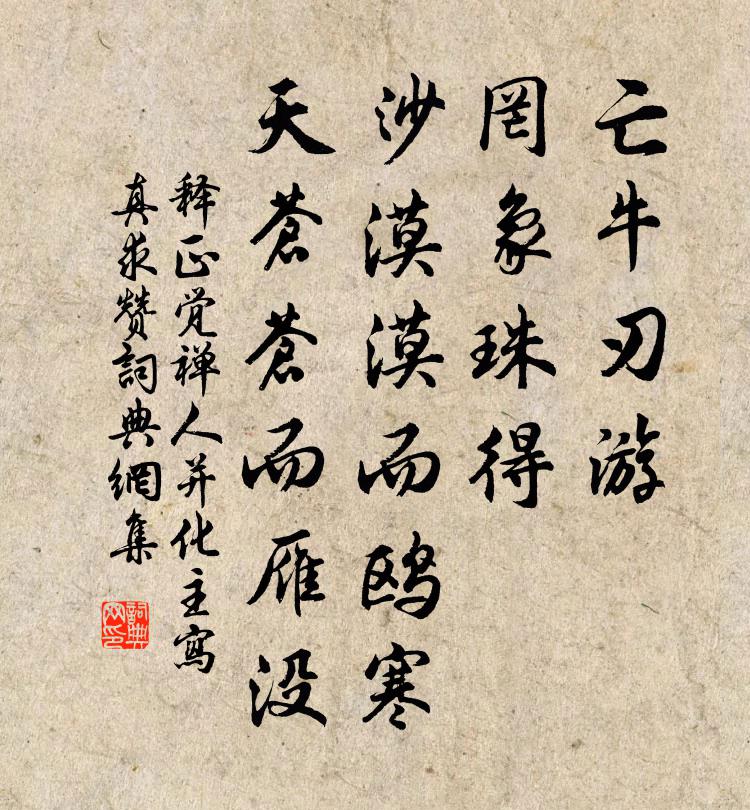 詩詞名句歷史字典書法欣賞書法字典國語詞典說文解字康熙字典古漢語字典標 題 作 者 詩 句 禪人並化主寫真求贊作者:釋正覺 朝代:宋代禪人並化主寫真求贊原文亡牛刃游,罔象珠得。沙漠漠而鷗寒,天蒼蒼而雁沒。詩詞問答問:禪人並化主寫真求贊的作者是誰?答:釋正覺問:禪人並化主寫真求贊寫於哪個朝代?答:宋代釋正覺禪人並化主寫真求贊書法欣賞禪人並化主寫真求贊書法作品詩詞推薦次韻劉後村所贈延慶主僧圭復翁詩三首陳著〔宋代〕清到復翁方是清,不求名處莫逃名。南湖一片平鋪水,中有拍天波浪聲。謝書李商隱〔唐代〕微意何曾有一毫,空攜筆硯奉龍韜。自蒙半夜傳衣後,不羨王祥得佩刀。偈頌一百零九首釋可湘〔宋代〕凌霄隊里,昔曾合火分贓。小朵峰前,善賈不停死貨。橫身那畔,鶻眼迷蹤。歸根深得旨,落葉舞西內。湘潭道中詠芳草范成大〔宋代〕積雨條然晴,秀野若新沐。芳草徑寸姿,中有不勝綠。萋萋路傍情,頗亦念幽獨。驅馬去不顧,斷腸招隱曲。贈莊賢良招隱樓三首項安世〔宋代〕主人湖海士,有策欲平戎。入朝見天子,可以揖三公。客來忽相驚,見此招隱號。語客且勿驚,洗耳非我好。女豈書懷黃滔〔唐代〕退耕逢歉歲,逐貢愧行朝。道在愁雖淺,吟勞鬢欲凋。破村虹入井,孤館客投魈。誰怕秋風起,聽蟬度渭橋。過淮陰縣題韓信廟,前用唐律,後用進退格楊萬里〔宋代〕鴻溝秪道萬夫雄,雲夢何銷武士功。九死不分天下鼎,一生還負室前鍾。古來犬斃愁無蓋,此後禽空悔作弓。兵火熙寧以後祀高禖六首佚名〔宋代〕昔帝高辛,先禖筆祀。爰揆仲陽,式祈嘉祉。陳之科牲,授以弓矢。敷祐皇宗,施於孫子。擬行路難鮑照〔南北朝〕君不見河邊草。冬時枯死春滿道。君不見城上日。今暝沒盡去。明朝復更出。今我何時當然得。一去永滅入黃泉。同子瞻賦游惠山三首秦觀〔宋代〕輟棹縱幽討,籃輿入青蒼。圓頂相邀迓,旃檀燎深堂。層巒淡如洗,傑閣森欲翔。林芳含雨滋,岫日隔林光。涓涓晚秋王同祖〔宋代〕世變無窮客恨長,欄乾遍倚怕斜陽。滿籬 * 無心看,付與游蜂自在忙。水龍吟蘇軾〔宋代〕露寒煙冷蒹葭老,天外征鴻寥唳。銀河秋晚,長門燈悄,一聲初至。應念瀟湘,岸遙人靜,水多菰米。□望極平田如夢令(次韻子文邢文)向滈〔宋代〕夢斷綠窗鶯語。消遣客愁無處。小檻俯青郊,恨滿楚江南路。歸去。歸去。花落一川煙雨。青玉案·年年社日停針黃公紹〔宋代〕年年社日停針線。怎忍見、雙飛燕。今日江城春已半。一身猶在,亂山深處,寂寞溪橋畔。春衫著破誰針線。點點憶舊遊(越調)周邦彥〔宋代〕記愁橫淺黛,淚洗紅鉛,門掩秋宵。墜葉驚離思,聽寒螿夜泣,亂雨蕭蕭。鳳釵半脫雲鬢,窗影燭花搖。漸暗竹敲蘇州十詠其六靈岩寺范仲淹〔宋代〕古來興廢一愁人,白髮僧歸掩寺門。越相煙波空去雁,吳王宮闕半啼猿。春風似舊花猶笑,往事多遺石不言。唯有江上晁公溯〔宋代〕岸冷霜排草,川明月上梅。清游誠可愛,深夜孰能來。不作尋山去,難成訪剡回。此生慚野老,過往只田萊。唐虞門唐堯周曇〔唐代〕祅氛不起瑞煙輕,端拱垂衣日月明。傳事四方無外役,茅茨深處土階平。詠史上李斯三首陳普〔宋代〕太華終南只磨青,渭流一日肯為涇。豺狼不食茅焦肉,水火安能熄六經。次韻知縣兄秋懷三首蘇泂〔宋代〕靈均心事少陵詩,青竹林邊白竹籬。自把寒花看新雁,今年強似去年衰。名句推薦或飲食,或坐走。長者先,幼者後。李毓秀《弟子規·出則弟》 光陰可惜,譬諸逝水。顏之推《顏氏家訓·勉學篇》 物舍其所長,之其所短,堯亦有所不及矣劉向《戰國策·齊三·孟嘗君有舍人而弗悅》 前山急雨過溪來,盡洗卻、人間暑氣吳潛《鵲橋仙·扁舟昨泊》 春花秋月何時了?往事知多少。李煜《虞美人·春花秋月何時了》 聞道故林相識多,罷官昨日今如何李頎《送陳章甫》 星漢燦爛,若出其里。曹操《觀滄海 / 碣石篇》 狎興生疏,酒徒蕭索,不似少年時。柳永《少年游·長安古道馬遲遲》 飄飄何所似,天地一沙鷗。杜甫《旅夜書懷》 美成在久,惡成不及改莊子《莊子·內篇·人間世》