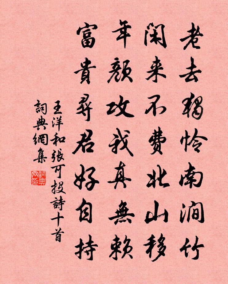 詩詞名句歷史字典書法欣賞書法字典國語詞典說文解字康熙字典古漢語字典標 題 作 者 詩 句 和張可投詩十首作者:王洋 朝代:宋代和張可投詩十首原文老去獨憐南澗竹,閒來不費北山移。年顏攻我真無賴,富貴尋君好自持。詩詞問答問:和張可投詩十首的作者是誰?答:王洋問:和張可投詩十首寫於哪個朝代?答:宋代王洋和張可投詩十首書法欣賞和張可投詩十首書法作品詩詞推薦牛屋方岳〔宋代〕苦以連茹茅,編以帶葉篠。俾予繭栗犢,安臥煙雨曉。架犁初學耕,敲扑固不少。我廩何時高,爾室勿嫌小。半山燕支行王維〔唐代〕〔時年二十一〕漢家天(一作大)將才且雄。來時(一作時來)謁帝明光宮。萬乘親推雙闕下。千官出餞五陵東。直夜二首劉筠〔宋代〕嘉木清陰接綺窗,謫仙風骨凜冰霜。堯廚萐莆分珍膳,漢廟含桃和酪漿。磴道神行通碣石,井幹雲構俯瑤光。金釭答陳公美四首蘇洵〔宋代〕仲尼魯司寇,官職亦已優。從祭肉不及,戴冕奔諸侯。當時不之知,為肉誠可羞。君子意有在,眾人但愆尤。置之次韻和張仲通見寄三絕句王安石〔宋代〕收拾乾坤付一壺,世間無物直錙銖。醉鄉舊業拋來久,更欲因君稍問塗。宿泊口陳師道〔宋代〕弱柳經寒色,懸流盡夜聲。更長疑睡少,霜落怯寒生。急急占星度,搖搖苦舫傾。風濤兼盜賊,恩重覺身輕。送張判官赴河西王維〔唐代〕腳踏車曾出塞,報國敢邀勛。見逐張征虜,今思霍冠軍。沙平連白雲,蓬捲入黃雲。慷慨倚長劍,高歌一送君。曲肱詩二十首白玉蟾〔宋代〕這回空過二十年,肉重不能飛上天。抖擻衲頭還自笑,囊中也沒一文錢。奉和御製重陽五七言詩楊億〔宋代〕民在華胥正樂康,高秋實雁指衡陽。蒹葭漸見凝清露,鶗鴂先驚歇眾芳。節值登高真勝會,年逢大有是殊祥。宸心嘉陽絕無木犀偶得一枝戲作陸游〔宋代〕久客紅塵不自憐,眼明初見廣寒仙。只饒籬菊同時出,尚占江梅一著先。重露濕香幽徑曉,斜陽烘蕊小窗妍。何人衰疾陸游〔宋代〕衰疾猶能飯一簞,蓴絲菰首亦加餐。舊叨刻印俄銷印,老媿彈冠亟掛冠。自怪嵇康如許嬾,人憐范叔不勝寒。得錢赴野渡招賞桂衛宗武〔宋代〕幾年寥落負秋光,剩喜朋簪列耐堂。枌社重開真率集,桂華新薦廣寒香。故交今日嗟無幾,我輩晨星當自強。況有偈頌一百零四首釋紹曇〔宋代〕天巧剪瑤花,六出繽紛落。二祖立腰酸,楊岐嗟項縮。爭似炎爐頭柮榾高燒,紙衾包卻暖烘烘。憨睡著,天墮凝寒南樓令(送黃一峰游靈隱)張炎〔宋代〕重整舊漁蓑。江湖風雨多。好襟懷、近日消磨。流水桃花隨處有,終不似、隱煙蘿。南浦又漁歌。桃雲泛遠波。想絕句二首陳師道〔宋代〕里中饋杏得嘗新,馬上逢花始見春。勤苦著書如作吏,世間枉是最閒人。補樂府十篇有商氏之樂歌曹勛〔宋代〕帝命是膺,聖政日新。佑我烈祖,以克相爾後人。蜂趙時韶〔宋代〕蜜成只解供樽俎,蠟就徒能照綺羅。堪嘆汝生無受用,銑銑刺刺欲如何。挽知府陳大著陳宓〔宋代〕艾軒今有幾門人,盛德如公復喪淪。蚤歲文名喧米廩,莫年祿秩竟朱輪。閭閻方頌循良政,台閣猶傳剴切陳。擬俟偈頌八十七首釋慧開〔宋代〕石跟常有千年潤,海眼曾地一日乾。天下蒼生待霖雨,不知龍向此間蟠。霹靂一聲頭角露,傾湫倒岳鼓波瀾。里胥曾國藩〔清代〕牛羊忽竄突,村社雜喧虺。昨聞府牒下,今見里胥來。召募赴戎行,羽檄馳如雷。“後期不汝有,行矣胡遲回!”名句推薦得成比目何辭死,願作鴛鴦不羨仙。盧照鄰《長安古意》 願隨孤月影,流照伏波營。沈如筠《閨怨二首·其一》 池花春映日,窗竹夜鳴秋。李白《謝公亭·蓋謝朓范雲之所游》 天相漢,民懷國。史達祖《滿江紅·九月二十一日出京懷古》 歲暮陰陽催短景,天涯霜雪霽寒宵。杜甫《閣夜》 灼灼野花香,依依金柳黃。佚名《菩薩蠻·霏霏點點回塘雨》 驚風飄白日,忽然歸西山曹植《贈徐幹詩》 舉目山河異,偏傷周顗情。李白《金陵新亭》 祿不患其不來,患祿來,而不能無愧其祿。王永彬《圍爐夜話·第四四則》 木謂之華,草謂之榮。佚名《爾雅·釋草》