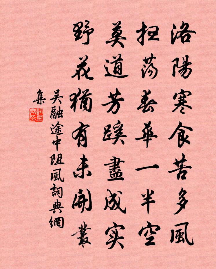 詩詞名句歷史字典書法欣賞書法字典國語詞典說文解字康熙字典古漢語字典標 題 作 者 詩 句 途中阻風作者:吳融 朝代:唐代途中阻風原文洛陽寒食苦多風,掃蕩春華一半空。莫道芳蹊盡成實,野花猶有未開叢。詩詞問答問:途中阻風的作者是誰?答:吳融問:途中阻風寫於哪個朝代?答:唐代吳融途中阻風書法欣賞途中阻風書法作品注釋全唐詩:卷685-52詩詞推薦蘭徐渭〔明代〕莫訝春光不屬儂,一香已足壓千紅。總令摘向韓娘袖,不作人間腦麝風。贈祠部令狐郎中馬戴〔唐代〕官初執憲稱雄才,省轉為郎雅望催。待制松陰移玉殿,分宵露氣靜天台。算棋默向孤雲坐,隨鶴閒窮片雲回。忽憶檐卜花潘鄭台〔宋代〕未說司花刻玉工,已知名與佛相同。可憐結了薰風子,依舊身歸 * 中。書事趙蕃〔宋代〕貧非事烹煎,病止治藥物。烏薪鬻之市,束縛論寸尺。煙浮多稚松,質重非老櫟。熾焰忽復然,寒灰已成積。司空相公輓歌王禹偁〔宋代〕全德群儒服,清名信史書。何人不調鼎,唯我得懸車。蕭相文無害,於公慶有餘。三川歸葬地,松檟自扶疏。和樞密侍郎因看海棠憶禁苑此花最盛郭稹〔宋代〕朱欄明媚照橫塘,芳樹交加枕短牆。傳得東君深意態,梁成西蜀好風光。破紅枝上仍施粉,繁翠陰上旋撲香。應為寄西嶽白石僧馬戴〔唐代〕掛錫中峰上,經行踏石梯。雲房出定後,岳月在池西。峭壁殘霞照,欹松積雪齊。年年著山屐,曾得到招提。依韻和公儀龍圖招諸公觀舞及畫三首梅堯臣〔宋代〕初約看花花已盡,重新邀客客應歡。真花既不能長艷,畫在霜紈更好看。江城口號二首董嗣杲〔宋代〕定江軍門擁雲氣,廬山面目長相朝。閫臣所持止一恕,牆壁何恨粘歌謠。赴翠峰請別靈隱禪師釋重顯〔宋代〕臨行情緒懶開言,提唱宗乘亦是閒。珍重導師並海眾,不勝依戀向靈山。齊天樂(壽榮王夫人)吳文英〔宋代〕玉皇重賜瑤池宴,瓊筵第二十四。萬象澄秋,群裾曳玉,清澈冰壺人世。鰲峰對起。許分得鈞天,鳳絲龍吹。翠羽同州南亭陪劉侍郎送劉先輩趙嘏〔唐代〕處處雲隨晚望開,洞庭秋入管弦來。謝公待醉消離恨,莫惜臨川酒一杯。次韻子瞻過海蘇轍〔宋代〕我遷海康郡,猶在寰海中。送君渡海南,風帆若張弓。笑揖彼岸人,回首平生空。平生定何有,此去未可窮。惜無阮郎歸張掄〔宋代〕動時思靜暑思寒。塵勞擾擾間。翻雲復雨百千般。幾時心地閒。□□□,□□難。將□□□然。自然寒暑不相□。頌古三十八首釋從瑾〔宋代〕我手何似佛手,合掌面南看北斗。兔推明月上千峰,引得寒山開笑口。送黃叔向謁楊伯子趙師秀〔宋代〕嘗聞事將壇,何得復儒冠。口誦新詩句,身呈舊箭瘢。賞因貧未受,愁擬醉相寬。當伏湖州牧,應憐志士寒。和孫廷平坦嵩山十首春溪水韓維〔宋代〕陽生溪谷溫,坼坼冰面破。淥隨波色還,白放雲光墮。野鷗豈知此,終日忘形坐。至性靈迂僻學術空虛幸逢好古之君獲在藏書之李至〔宋代〕蓬閣多餘暇,群編得縱觀。書精新篆籀,畫古舊衣冠。故事南朝遠,胡風北史寒。不披三兩卷,永日度應難。和陳傳道秋日十詠之八秋興賀鑄〔宋代〕擬從康樂公,雙躡登山屐,晴夜宿天台,披雲看初日。對酒醉題屈突明府廳李白〔唐代〕陶令八十日,長歌歸去來。故人建昌宰,借問幾時回。風落吳江雪,紛紛入酒杯。山翁今已醉,舞袖為君開。名句推薦老農家貧在山住,耕種山田三四畝。張籍《野老歌 / 山農詞》 吹燈窗更明,月照一天雪。袁枚《十二月十五夜》 水滿池塘花滿枝。亂香深里語黃鸝。趙令疇《浣溪沙·水滿池塘花滿枝》 斑騅只系垂楊岸,何處西南任好風。李商隱《無題·鳳尾香羅薄幾重》 群雞正亂叫,客至雞鬥爭。杜甫《羌村三首·其三》 今朝有酒今朝醉,明日愁來明日憂。佚名《增廣賢文·上集》 喚起一天明月,照我滿懷冰雪,浩蕩百川流。辛棄疾《水調歌頭·和馬叔度游月波樓》 江寒水不流,魚嚼梅花影。釋敬安《題寒江釣雪圖》 秋風夜渡河,吹卻雁門桑。王昌齡《塞下曲·秋風夜渡河》 非鬼亦非仙,一曲桃花水辛棄疾《生查子·獨游雨岩》