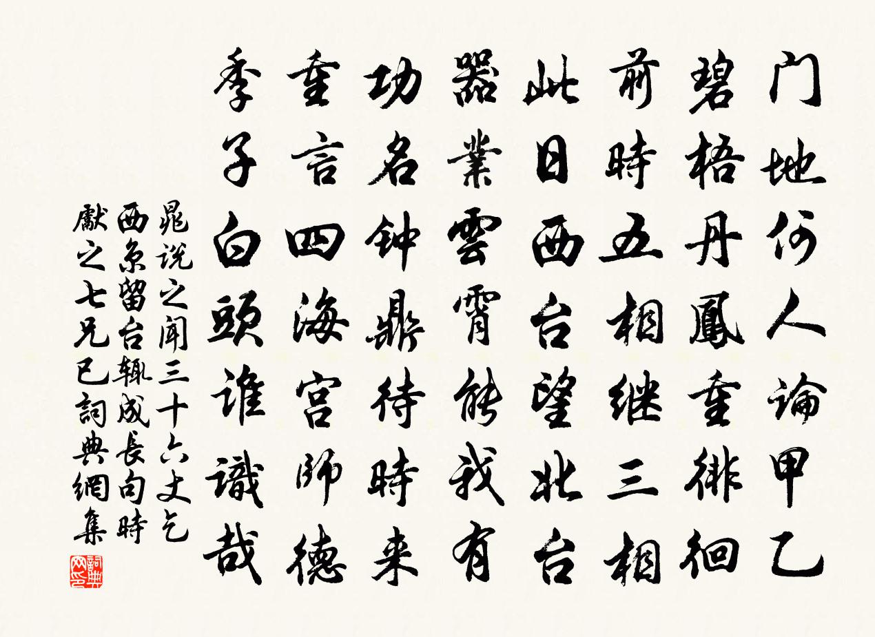 詩詞名句歷史字典書法欣賞書法字典國語詞典說文解字康熙字典古漢語字典標 題 作 者 詩 句 聞三十六丈乞西京留台輒成長句時先之七兄已作者:晁說之 朝代:宋代原文門地何人論甲乙,碧梧丹鳳重徘徊。前時五相繼三相,此日西台望北台。器業雲霄能我有,功名鐘鼎待時來。重言四海宮師德,季子白頭誰識哉。詩詞問答問:《聞三十六丈乞西京留台輒成長句時先之七兄已》的作者是誰?答:晁說之問:該詩寫於哪個朝代?答:宋代書法欣賞聞三十六丈乞西京留台輒成長句時先之七兄已書法作品詩文賞析【原題】:聞三十六丈乞西京留台輒成長句時先之七兄已拜北京留台詩詞推薦送翁誠之徐照〔宋代〕又作巴陵倒,南州舊有聲。未憑湘水綠,能似長官清。笛冷君山月,帆輕夏浦晴。五言多好句,顏杜減詩名。訪益上人蘭若嚴羽〔宋代〕獨尋青蓮宇,行過白沙灘。一逕入松雪,數峰生暮寒。山僧喜客至,林閣供人看。吟罷拂衣去,鐘聲雲外殘。玉樓春晏幾道〔宋代〕芳年正是香英嫩。天與嬌波長入鬢。蕊珠宮裡舊承恩,夜拂銀屏朝把鏡。雲情去住終難信。花意有無休更問。醉中山居雜詩九十首曹勛〔宋代〕飯了縱閒適,杖屨涉晴晝。時物破百感,環山獻明秀。承宇茂芳桂,追涼風細逗。摘果靡憚勞,聊用引稚幼。和張周玉峨眉山行吳泳〔宋代〕搘筇更上最高峰,浮出修眉翠掃空。雪汗半消岩路口,苔衣倒掛樹林中。異禽語已非人世,香草名應系國風。晚色伏聞知府秘書欲取小杜桐廬詩語,以見花名堂范成大〔宋代〕使君來暖東堂席,又見堂前花信息。小白猶封竹外枝,微黃已點眉間色。山城十月如春台,聞有細書天上來。說與寄郢州崔守八首陳造〔宋代〕將軍競病舊能詩,黃絹於今玩色絲。何日酒兵鏖筆陣,未應羽檄諗交綏。黃岩令鄭仁叔索委羽洞詩樓鑰〔宋代〕君不見王君羽化脫秦厄,故山至今名落翮。又不見烏程野鶴投氅毛,佞臣稱瑞民斯勞。何如奉林控鶴登清霄,傷然頌古三十八首釋慧方〔宋代〕文殊彈指,罔明出定。今日重新,打翻舊令。子肅以古風見還詩軸頗述歸田之樂次韻答之趙蕃〔宋代〕春風書忽滿目,書感嘆離群書居。郊行書竟何之,野蔓徒侵裾。仰看嶺頭雲,片段隨卷舒。悠然若有得,似我心地大晟府擬撰釋奠十四首佚名〔宋代〕道之由興,於皇宣聖。惟公之傅,人知越正。興鄉在堂,情文實稱。萬年承休,假哉天命。頌古十一首釋智鑒〔宋代〕即心是佛外忘求,心佛圓明不假修。雲淨遠山千點翠,水和明月一天秋。石上種劍蒲其脊成矣非陶隱居所謂溪蓀者耶舒岳祥〔宋代〕崑山片玉天生潤,雁盪移來手自栽。禪客久親清少病,山童勤拂淨無埃。葉端灑灑通心露,根畔疏疏引水苔。必有山齋書事林表民〔宋代〕掩卷聽蟬韻,憑欄樓雁行。井風梧葉雨,籬月菊花霜。又見秋將老,那堪夜更長。愁吟無語共,殘灺落書床。歸朝歡(壽蕭禹平知縣)嚴仁〔宋代〕雲表金莖珠璀璨。當日投懷驚玉燕。文章議論壓西廱,風流姓字翔東觀。紫皇嗟見晚。祥麟五色留金殿。大江西,次韻知常德袁尊固監丞送別四詩魏了翁〔宋代〕夕陽舂處是吾家,水繞山環路轉賒。蹙蹙四方渾未定,茫茫大化渺無涯。歸來已恨十年晚,老去空嗟兩鬢華。各原憶舊隱付柔上人釋永頤〔宋代〕遙憶荒階蘚生好,木蘭露重滴歸情。秋山松桂畢森爽,夜館星河幾晦明。溪色乍涼雙鷺下,雨聲纏絕一蟬鳴。經房某獲造司空府得至便座見文禽五六夷猶曲池上毛滂〔宋代〕幾年不解向滄洲,矰繳曾傷質轉幽。端倚主人憐采色,要隨鵷鷺濯清流。過沙頭三首楊萬里〔宋代〕昨來飛櫓下危瀧,不敢窺窗只閉窗。莫嘆江平船不進,只將行役當游江。為黃仲宣賦山中四章章四句方回〔宋代〕子疏於蹻,朋來其學。彼惡知茲,山中之樂。名句推薦有桃花紅,李花白,菜花黃。秦觀《行香子·樹繞村莊》 罔游於逸,罔淫于樂。佚名《尚書·虞書·大禹謨》 何事東君,解將芳思,巧綴一斛春冰。朱晞顏《一萼紅·盆梅》 天生我材必有用,千金散盡還復來。李白《將進酒》 林暗草驚風,將軍夜引弓。盧綸《和張僕射塞下曲·其二》 翠華想像空山里,玉殿虛無野寺中。杜甫《詠懷古蹟五首·其四》 梅子黃時日日晴,小溪泛盡卻山行曾幾《三衢道中》 時靸雙鴛響,廊葉秋聲。吳文英《八聲甘州·靈岩陪庾幕諸公游》 半畝方塘一鑒開,天光雲影共徘徊。朱熹《活水亭觀書有感二首·其一》 善有善報,惡有惡報。不是不報,時候未到。佚名《增廣賢文·上集》