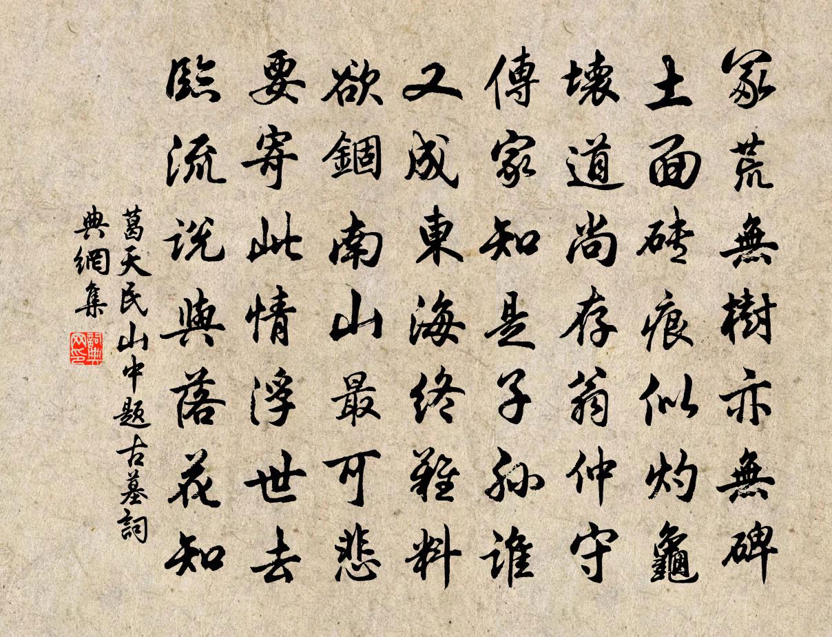詩詞名句歷史字典書法欣賞書法字典國語詞典說文解字康熙字典古漢語字典標 題 作 者 詩 句 山中題古墓作者:葛天民 朝代:宋代山中題古墓原文冢荒無樹亦無碑,土面磚痕似灼龜。壞道尚存翁仲守,傳家知是子孫誰。又成東海終難料,欲錮南山最可悲。要寄此情浮世去,臨流說與落花知。詩詞問答問:山中題古墓的作者是誰?答:葛天民問:山中題古墓寫於哪個朝代?答:宋代葛天民山中題古墓書法欣賞山中題古墓書法作品詩詞推薦卜運算元劉克莊〔宋代〕東甽寧馨兒,南國循良守。先把爐熏祝帝堯,次祝君侯壽。廣致米商船,多釀兵廚酒。客有鬚眉似蓋延,許至華堂復自姑蘇過宛陵,至鄧步出陸范成大〔宋代〕漿家饋食槿為藩,酒市停驂竹廡門。紅樹亭亭棲晚照,黃茅杳杳被高原。飲溪有跡於菟過,掠草如飛朴渥翻。車軌生查子洪适〔宋代〕子月到盤洲,日影長添線。水退露溪痕,風急寒蘆戰。終日倚枯藤,細看浮雲變。洲畔有圓沙,招盡雲邊雁。辛丑年韋莊〔唐代〕九衢漂杵已成川,塞上黃雲戰馬閒。但有羸兵填渭水,更無奇士出商山。田園已沒紅塵里,弟妹相逢 * 間。西望春貼子詞太皇太后閣六首司馬光〔宋代〕冰澌半爭波先綠,柳葉未生條已黃。四海澄清天子孝,朝回日奉萬年觴。自題墨竹劉延世〔宋代〕酷愛此君心,常將墨點真。毫端雖在手,難寫淡精神。寒食雨中,同舍約游天竺,得十六絕句呈陸務楊萬里〔宋代〕雨里匆匆怨出郊,晴時不出卻誰教。西湖北畔名園裡,無數桃花只見梢。送李舉之武博學宏詞蘇籀〔宋代〕稷下機梭纂奏篇,犀通木癭炳彪然。盛朝耆望門庭懿,咨匠宗師典據全。掉鞅春闈賈余男,賞音盟主詫稱妍。峻登閒居雜題五首野態真陸龜蒙〔唐代〕君如有意耽田裡,予亦無機向藝能。心跡所便唯是直,人間聞道最先憎。送薛秀才皇甫冉〔唐代〕雖是尋山客,還同慢世人。讀書惟務靜,無褐不憂貧。野色春冬樹,雞聲遠近鄰。郄公即吾友,合與爾相親。三月二首曹勛〔宋代〕遊子從來悲故鄉,發來襟袖芷蘭芳。夢魂飛去雲濤遠,杖策閒行秋水光。可是夢中曾到此,安知身後卻余香。紫陽東兵長句十韻杜牧〔唐代〕上黨帶爭為天下帶脊,邯鄲帶四十萬秦帶坑。狂童何者欲專地,聖主無私豈玩兵。玄象森羅搖北落,詩人章句詠東為劉定伯索油蕨文天祥〔宋代〕我欲登山去採薇,江南秋雨正霏霏。仙家解有逡巡手,一籌西風落翠微。暮春陸游〔宋代〕掠面微風吹宿醒,送春空有不勝情。風煙老盡王孫草,時聽桑間小婦聲。句釋延壽〔宋代〕春雨閉花徑,晚雲生石樓。龍門岩張伯玉〔宋代〕未到子陵台,先見龍門石。萬物鎮群峰,闖然聳雙壁。清泉界中道,亢若高門闢。樵童走深徑,魚戶掩沈碧。白道嚴君平卜肆岑參〔唐代〕君平曾賣卜,卜肆蕪已久。至今杖頭錢,時時地上有。不知支機石,還在人間否。句宋祁〔宋代〕歸從鶴翹六六間。詠史詩褒城胡曾〔唐代〕恃寵嬌多得自由,驪山舉火戲諸侯。只知一笑傾人國,不覺胡塵滿玉樓。謝楊善才道友惠數珠釋曇華〔宋代〕南詢初不失程途,收得金剛腦後珠。兩手持來親獻我,光明炯炯破昏衢。名句推薦我是人間惆悵客,知君何事淚縱橫,斷腸聲里憶平生。納蘭性德《浣溪沙·殘雪凝輝冷畫屏》 茶有九難:一曰造,二曰別,三曰器,四曰火,五曰水,六曰炙,七曰末,八曰煮,九曰飲。陸羽《茶經·六之飲》 雲中亂拍祿山舞,風過重巒下笑聲。杜牧《過華清宮絕句三首》 正江令恨別,庾信愁賦劉辰翁《蘭陵王·丙子送春》 一顧傾人城,再顧傾人國。李延年《李延年歌》 池上憑闌愁無侶。奈此個、單棲情緒。柳永《甘草子·秋暮》 長江如虹貫,蟠繞其下。宋濂《閱江樓記》 今日漢宮人,明朝胡地妾。李白《王昭君二首》 撩亂舞晴空,發人無限思。劉禹錫《柳花詞三首》 騷屑西風弄晚寒,翠袖倚闌乾。納蘭性德《眼兒媚·詠紅姑娘》
