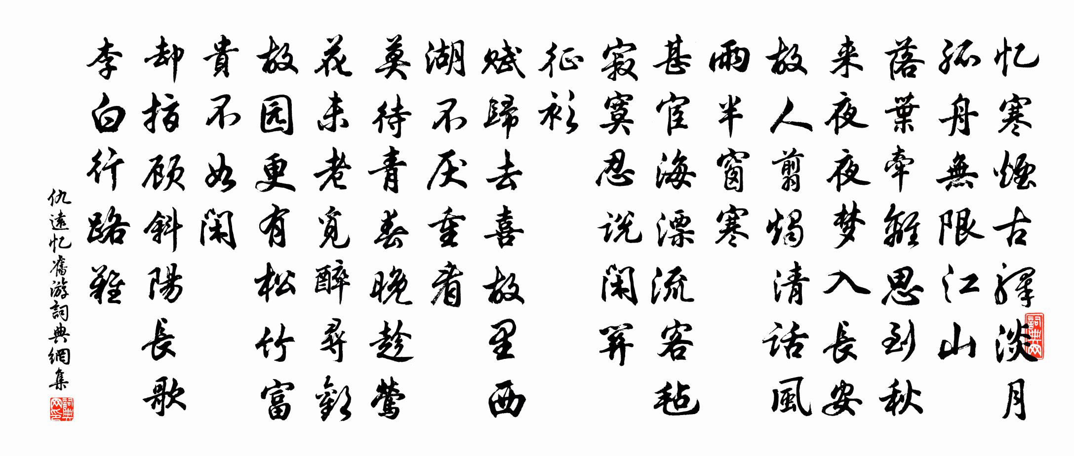 詩詞名句歷史字典書法欣賞書法字典國語詞典說文解字康熙字典古漢語字典標 題 作 者 詩 句 憶舊遊作者:仇遠 朝代:宋代憶舊遊原文憶寒煙古驛,淡月孤舟,無限江山。落葉牽離思,到秋來,夜夜夢入長安。故人翦燭清話,風雨半窗寒。甚宦海漂流,客氈寂寞,忍說閒關。征衫。賦歸去,喜故里西湖,不厭重看。莫待青春晚,趁鶯花未老,覓醉尋歡。故園更有松竹,富貴不如閒。卻指顧斜陽,長歌李白行路難。詩詞問答問:憶舊遊的作者是誰?答:仇遠問:憶舊遊寫於哪個朝代?答:宋代問:憶舊遊是什麼體裁?答:詞仇遠憶舊遊書法欣賞憶舊遊書法作品詩詞推薦登嶽麓法華台岳兵火後寺已兩創惟台為舊物當鄭剛中〔宋代〕湘西嶽麓法華台,四十年中又再來。惟石與松如雅故,問僧並寺已塵埃。區區獨恨恩難報,負歲無言志已頹。退宿悼周晉仙釋永頤〔宋代〕詩救元和失,先生學最精。律嚴方苦硬,才大始縱橫。貞曜何須謚,魏閒相繼生。他年詩集著,風雅被家聲。錢塘旅舍陳允平〔宋代〕雲山千萬疊,身事恨悠悠。客鬢秋風急,鄉心夜雨愁。蛩鳴鄰寺壁,雁過隔湖樓。目送千帆遠,長江空自流。偈頌一百零一首釋慧性〔宋代〕一即一切,一切即一。拈青玉峽,向焦螟眼中。撮大地來,如粟米粒。會則事同一家,不會則知我受屈。儒家子劉宗慶發披戴願贈二絕句俾藉之以謁樂曾豐〔宋代〕未得黃冠換白襴,不妨持缽乞壇間。要還少室山人願,須破多金長者慳。范以善雲林清遠館張雨〔元代〕華陽范監居幽眇,不到元窗未易逢。山氣半為湖外雨,松聲遙答嶺頭鍾。常聞神女騎龍過,亦有仙人控鶴從。安用陪制帥寶學侍郎飲別金陵諸勝地蘇泂〔宋代〕制閫三年名,亭台一日違。江山雲外款,鼓吹月中歸。夜氣輕杯力,霜棱迫妓圍。明當趁朝謁,回首此依依。關雎佚名〔先秦〕關關雎鳩,在河之洲。窈窕淑女,君子好逑。參差荇菜,左右流之。窈窕淑女,寤寐求之。求之不得,寤寐思服。淮南看雪歌陳杰〔宋代〕出門看雪一萬里,閉門讀書一萬年。讀書唯讀三皇后,看雪還太始前。洪蒙漢還初紀異,鍊石補天灰滲地,人蟲森憶平泉雜詠憶春耕李德裕〔唐代〕郊外杏花坼,林間布穀鳴。原田春雨後,谿水夕流平。野老荷蓑至,和風吹草輕。無因共沮溺,相與事岩耕。端午即事文天祥〔宋代〕五月五日午,贈我一枝艾。故人不可見,新知萬里外。丹心照夙昔,鬢髮日已改。我欲從靈均,三湘隔遼海。宮詞王仲修〔宋代〕九月飛霜天地清,未央前殿燕簪纓。欲知重谷為先務,八彩眉間喜順成。讀書歐陽修〔宋代〕吾生本寒儒,老尚把書卷。眼力雖已疲,心意殊未倦。正經首唐虞,偽說起秦漢。篇章異句讀,解詁及箋傳。是非曉過丹陽縣五首楊萬里〔宋代〕朱檐碧瓦照青瀾,潔館佳亭使往還。船上高橋三十尺,市人倚折石欄乾。答劉仲美王令〔宋代〕莽莽晴川水,寥寥病客舟。來隨風浩蕩,去逐雨淹留。生計梁邊燕,歸心海上鷗。多慚故人句,欹臥一長謳。如夢令 贈縣令王哲〔元代〕日日此中開宴。食肉諸公總善。唯有害風王,莫怪頻來見面。知縣。知縣。正好與人方便。斗山子王深父作石屏記為老夫書其文甚佳采記戴復古〔宋代〕細讀石屏記,尋幽到水涯。老人相問答,屬意在岩花。江海浮天闊,山林去國賒。草茅最深處,認作野人家。次單君范袖來汪西皋所譔詠秋十章以示因和之陳著〔宋代〕昏眵望杳水雲村,好句從來風月人。瓦缶不量追大呂,冰壺何惜受纖塵。棋宋伯仁〔宋代〕亂鴉飛鷺勢縱橫,對面機心豈易萌。一著錯時都是錯,寧無冷眼看輸贏。漁家·賣得鮮魚二百錢鄭燮〔清代〕賣得鮮魚二百錢,米糧炊飯放歸船。 拔來濕葦燒難著,曬在垂楊古岸邊。名句推薦晚日寒鴉一片愁。柳塘新綠卻溫柔。辛棄疾《鷓鴣天·晚日寒鴉一片愁》 東邊日出西邊雨,道是無晴卻有晴。劉禹錫《竹枝詞二首·其一》 澹泊之守,須從穠艷場中試來;鎮定之操,還向紛紜境上勘過。陳繼儒《小窗幽記·集醒篇》 劇辛樂毅感恩分,輸肝剖膽效英才。李白《行路難三首》 樂殊貴賤,禮別尊卑。周興嗣《千字文·全文》 田園寥落干戈後,骨肉流離道路中。白居易《望月有感》 曾苦傷春不忍聽,鳳城何處有花枝李商隱《流鶯》 秋逼暗蟲通夕響,征衣未寄莫飛霜。張仲素《秋夜曲》 不要人夸好顏色,只留清氣滿乾坤。王冕《墨梅》 名無固實,約之以命實,約定俗成,謂之實名。荀子《荀子·正名》
