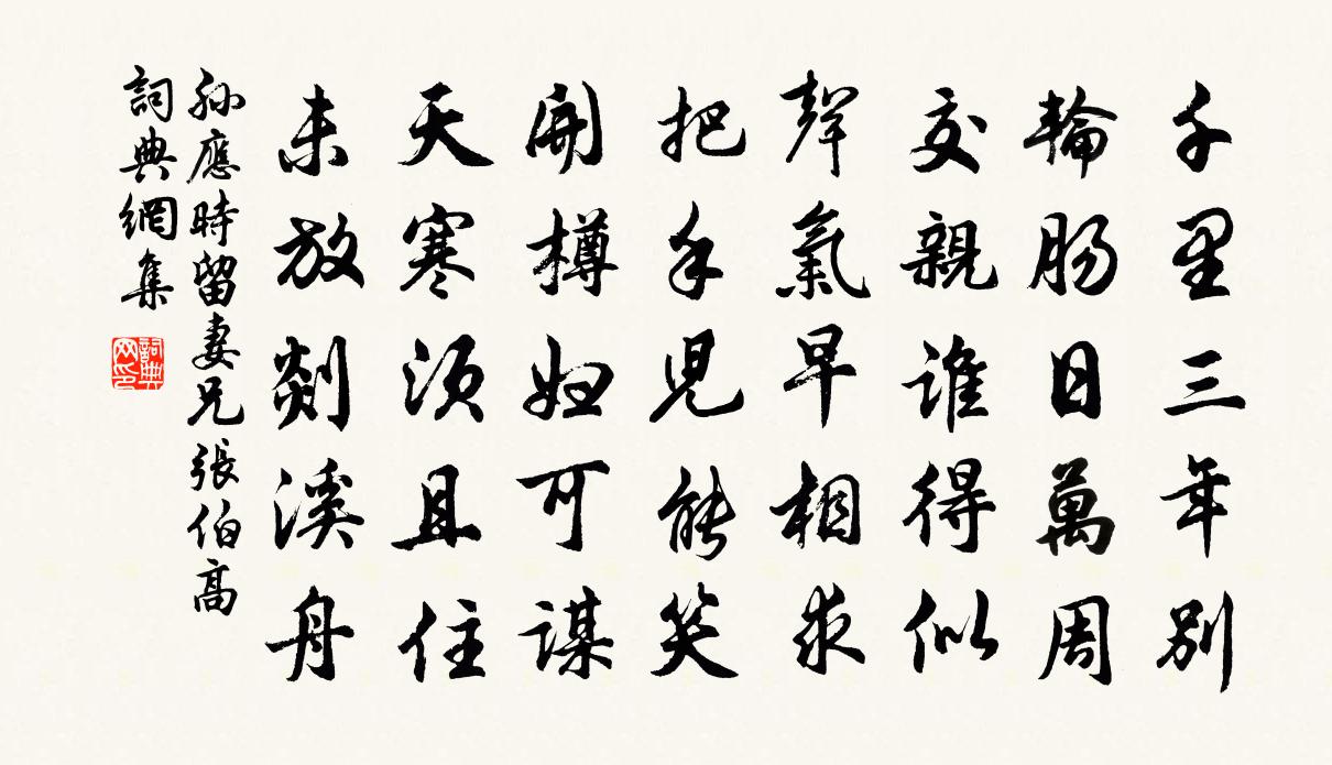 詩詞名句歷史字典書法欣賞書法字典國語詞典說文解字康熙字典古漢語字典標 題 作 者 詩 句 留妻兄張伯高作者:孫應時 朝代:宋代留妻兄張伯高原文千里三年別,輪腸日萬周。交親誰得似,聲氣早相求。把手兒能笑,開樽婦可謀。天寒須且住,未放剡溪舟。詩詞問答問:留妻兄張伯高的作者是誰?答:孫應時問:留妻兄張伯高寫於哪個朝代?答:宋代孫應時留妻兄張伯高書法欣賞留妻兄張伯高書法作品詩詞推薦訾家洲樂雷發〔宋代〕竹塢松灣遍屨痕,斷碑無首野苔昏。江山應識前賢事,裴柳今存幾世孫。島霧海霞留古意,春猿秋鶴冷騷魂。何人漁父四時歌周必大〔宋代〕三湘七澤雲連水,短棹意行無遠邇。江花時傍綠蓑飛,水鳥忽從清唱起。醉後懽呼踏浪兒,鮪可鱠兮粳可炊。芳草有所嗟吳龍翰〔宋代〕乘鸞人去玉簫寒,雲斂巫山曉夢殘。柳線不堪擊離別,自和煙雨搭闌乾。清平樂許有壬〔元代〕天寒日暮。百繞梅花樹。萬斛清香藏不住。都在一花開處。可憐月墮霜飛。不知疏影來時。誰報雲川老子,翠禽先九張機南宋無名〔宋代〕八張機,回文知是阿誰詩?織成一片淒涼意,行行讀,厭厭無語,不忍更尋思。追餞正輔表兄至博羅賦詩為別蘇軾〔宋代〕孤臣南遊墮黃菅,君亦何事來牧蠻。艤舟蜑戶龍岡窟,置酒椰葉桄榔間。高談已笑衰語陋,傑句尤覺清詩孱。博羅鳳棲梧·霜樹重重青嶂趙可〔宋代〕霜樹重重青嶂小,高棟飛雲,正在霜林杪。九日黃花才過了,一尊聊慰秋容老。翠色有無眉淡掃。身在西山,卻愛題章伯深臞怪圖仲並〔宋代〕杖策山隈亦水濱,閒中未害飽經綸。何曾寂寞嵌岩裹,慣著風流廓廟人。過九成宮吳融〔唐代〕鳳輦東歸二百年,九成宮殿半荒阡。魏公碑字封蒼蘚,文帝泉聲落野田。碧草斷沾仙掌露,綠楊猶憶御爐煙。昇平曹魏二首陳造〔宋代〕睢盱漢鼎漫心勞,夢覺俄驚馬食槽。馬漸天飛龍在井,當途能得幾時高。移居西郭重樓洪咨夔〔宋代〕欲歸未辦買山資,東寄西存漫一枝。樓上起樓渠自巧,客中作客我何痴。崎嶇溪步通虛市,郁屈出蹊護短籬。不用柬惠安同安葉陳二明府並煩安溪林明府寄似劉克莊〔宋代〕吾友二三子,聯翩有國都。平平雖縣譜,急急奈州符。亦既吹虀矣,還能吸醋無。高年頗更事,莫哂瞽言迂。早起二首張耒〔宋代〕滄江 * 雨翻盆,將曉風聲戰亂雲。籬下寒雞鳴曉苦,老人先起自開門。自桃川至辰州絕句四十有二趙蕃〔宋代〕曉雨濛濛山欲空,少晴還覺練搖風。扁舟十日夫何事,只有看山不負公。真除後謾記所見魏了翁〔宋代〕記注愆期已隔年,濡螭夾案謾云然。惟餘一事光千古,後殿前朝聽直前。次韻劉貢父省上喜雨蘇軾〔宋代〕密雲今日破郊西,疏雨瀟瀟未作泥。要及清閒同笑語,行看衰病費扶攜。花前白酒傾雲液,戶外青驄響月題。不用郴江百詠並序龜峰鋪阮閱〔宋代〕山似龜形古戍西,路人到此欲稽疑。刳腸鑽灼猶難信,頑石何緣解有如。留別許廷惠折彥質〔宋代〕架空作屋才容膝,中有道人能湛然。門外紅塵雖擾擾,枕邊清夢自翩翩。君如海燕時須到,我似江鷗日又遷。回首煉丹砂 示眾李道純〔元代〕至道本無傳。只要心堅。始終立志莫教偏。九載三年常一定,便是神仙。真息自綿綿。靈地平平。飢來吃飯困來眠枕上晁說之〔宋代〕人間百感未能休,欲語無情謾九州。樓上角聲山上月,共人割據一端愁。名句推薦平岸小橋千嶂抱。柔藍一水縈花草。王安石《漁家傲·平岸小橋千嶂抱》 天明登前途,獨與老翁別。杜甫《石壕吏》 北客翩然,壯心偏感,年華將暮。朱敦儒《水龍吟·放船千里凌波去》 不鳴則已,一鳴驚人。司馬遷《滑稽列傳》 東風動百物,草木盡欲言。李白《長歌行》 江南自是離愁苦,況游驄古道,歸雁平沙。王沂孫《高陽台·和周草窗寄越中諸友韻》 客心已百念,孤游重千里。何遜《相送》 斗萬花樣巧,深染蜂黃。吳文英《惜黃花慢·菊》 誰料同心結不成,翻就相思結。夏完淳《卜運算元·秋色到空閨》 屏山遮斷相思路,子規啼到無聲處。高鶚《青玉案·絲絲香篆濃於霧》