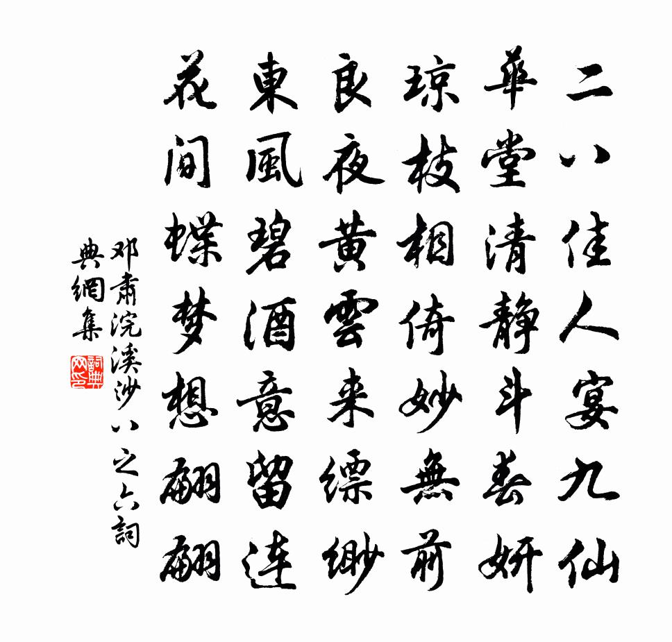 詩詞名句歷史字典書法欣賞書法字典國語詞典說文解字康熙字典古漢語字典標 題 作 者 詩 句 浣溪沙(八之六)作者:鄧肅 朝代:宋代浣溪沙(八之六)原文二八佳人宴九仙。華堂清靜斗春妍。瓊枝相倚妙無前。良夜黃雲來縹緲,東風碧酒意留連。花間蝶夢想翩翩。詩詞問答問:浣溪沙(八之六)的作者是誰?答:鄧肅問:浣溪沙(八之六)寫於哪個朝代?答:宋代問:浣溪沙(八之六)是什麼體裁?答:詞鄧肅浣溪沙(八之六)書法欣賞浣溪沙(八之六)書法作品詩詞推薦入講論語二首徐元傑〔宋代〕溫溫中旨肅傳宣,魯語書陳誦說專。聖意聿宗伊洛訓,愚臣謹繹考亭編。寸心普物根源地,百拜承顏咫尺天。堯舜送曾元恕太祝赴漢陽監征強至〔宋代〕漢江山色秀蒼煙,山擁江光入馬鞭。行思欲飄飛鳥外,別顏空慘落花前。勉旃關賦那終歲,好在家聲幸壯年。鸚鵡日高韓偓〔唐代〕朦朧猶記管弦聲,噤痄余寒酒半醒。春暮日高簾半卷,落花和雨滿中庭。別嚴和之陸游〔宋代〕千里風煙行路難,旅舟應過子陵灘。人間富貴知何物,莫負君家舊釣竿。郊居言事趙湘〔唐代〕斷徑危橋積蘚痕,閉關終與俗塵分。深秋鶴影臨池見,靜夜棋聲隔水聞。山榻病來誰寄藥,石床僧去獨看雲。閒吟偈答百丈僧釋道常〔宋代〕不要三乘要祖宗,三乘不要與君同。君今欲會通宗會,後夜猿啼在亂峰。贈識古法師棲白〔唐代〕重城深寺講初休,卻憶家山訪舊遊。對月與君相送夜,聞蛩教我獨驚秋。雲心杳杳難為別,鶴性蕭蕭不可留。遙想楊寺丞掌務西洛訪別宋庠〔宋代〕長安僦羈宦,門巷絕卿輿。朝綬徒雲忝,賓綦日已疏。何為趨玉趾,乃肯眷蓬廬。九棘歷華選,四環承慶餘。頻叨更漏子·三十六宮秋夜水歐陽炯〔五代〕三十六宮秋夜水,露華點滴高梧。丁丁玉漏咽銅壺,明月上金鋪。紅線毯,博山爐,香風暗觸流蘇。羊車一去長青十報恩馬鈺〔元代〕山侗十願報師恩。劈碎金枷玉*情。久視門中修久視,長生路上得長生。昏昏默默澄澄湛,杳昔冥冥淨淨清。鄉亮探春令佚名〔宋代〕綠楊枝上曉鶯啼,報融和天氣。被數聲、吹入紗窗里。又驚起嬌娥睡。綠雲斜嚲金釵墮。惹芳心如醉。為少年濕了病中作文天祥〔宋代〕歲月侵尋見二毛,劍花冷落鸊鵜膏。睡餘吸海龍身瘦,渴里奔雲馬骨高。百忌不容親酒具,千愁那解減詩豪。起來讀放翁先生劍南詩草戴復古〔宋代〕茶山衣缽放翁詩,南渡百年無此奇。入妙文章本平澹,等閒言語變瑰琦。三春花柳天裁剪,歷代興衰世轉移。李杜一春屢有陽明之約雨輒尼之將旋幙侍外舅來游劉學箕〔宋代〕裂石未嘗關,毋將俗眼觀。虛中原有愛,造蘊亦何難。羽客能談道,雲房識候丹。只應仙有分,風響步虛壇。偶成梅詠三首張嵲〔宋代〕故園微路繞江乾,常記開時偪歲寒。萬晨臨風驚老眼,卻疑還是霧中看。扇子詩李石〔宋代〕雞蟲日得日失,鵬鷃風高風低。天道先看陰隲,人心何忍自欺。送趙二尚書彥昭北伐張說〔唐代〕虜地河冰合,邊城備此時。兵連紫塞路,將舉白雲司。提劍榮中貴,銜珠盛出師。日華光組練,風色焰旌旗。投筆野寺李時可〔宋代〕野寺不逢僧,修廊且緩行。竹藏雙鶴睡,風助一蟬鳴。坐石侵衣冷,臨風漱玉清。詠歸無限意,新月帶星橫。和金吾裴將軍使往河北宣慰…兼寄趙侍郎趙卿拜陵未回盧綸〔唐代〕飛軒不駐輪,感激漢儒臣。氣懾千夫勇,恩傳萬里春。古原收野燎,寒笛怨空鄰。書此達良友,五陵風雨頻。用強甫蒙仲韻十首劉克莊〔宋代〕先生擬把衣冠掛,穉子能操杖履從。叔夜只堪伴魚鳥,子云何至況蛇龍。豹皮尚欲留名死,雞肋安知與怒逢。老去名句推薦谷鳥吟晴日,江猿嘯晚風。李白《江夏別宋之悌》 人之敵,非奸亦奸;人之友,其奸亦忠。來俊臣《羅織經·察奸卷第八》 竹徑通幽處,禪房花木深。常建《題破山寺後禪院》 小男供餌婦搓絲,溢榼香醪倒接罹。李郢《南池》 明妃一朝西入胡,胡中美女多羞死。李白《于闐採花》 男兒不展風雲志,空負天生八尺軀。馮夢龍《警世通言·卷四十》 東風動百物,草木盡欲言。李白《長歌行》 水天清話,院靜人銷夏。項鴻祚《清平樂·池上納涼》 當年紫禁菸花,相逢恨不知音早。王惲《水龍吟·送焦和之赴西夏行省》 又到斷腸回首處,淚偷零。納蘭性德《山花子·風絮飄殘已化萍》