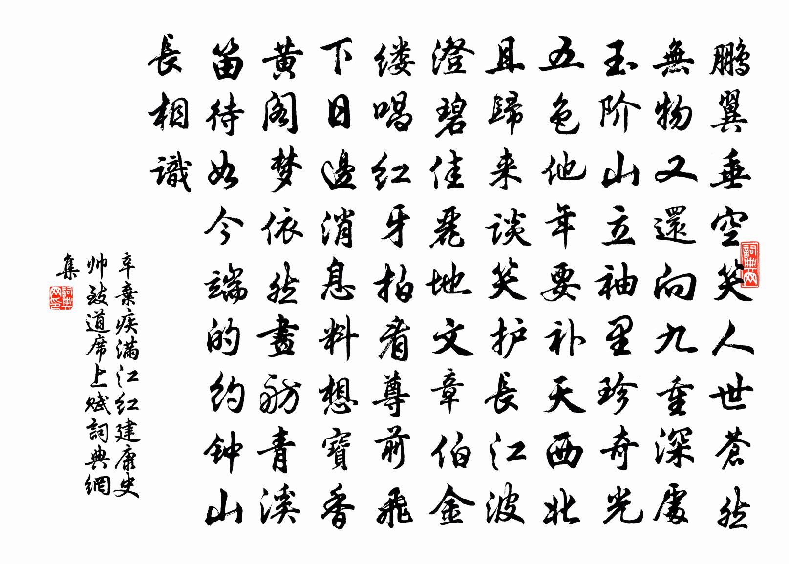《滿江紅·建康史帥致道席上賦》是一首作於史致道宴席、並表示歌頌史致道之意的贈人詞,但卻不與一股的應酬讚美、缺乏主旨的詞相同。詞人以飽酣的筆墨,充沛的熱情,向當時駐守建康的軍事行政氏官史正志表達詞人的讚頌之情,並通過這一情感的表達,展露詞人力主抗金復土的政治懷抱。詞寫得豪邁而深沉,在主旨廣、基調上、筆法亡和結構上,都與《水調歌頭·千里涯窪種》相近似,但又能顯示獨特的神采,體現出”復”中的“不復”。