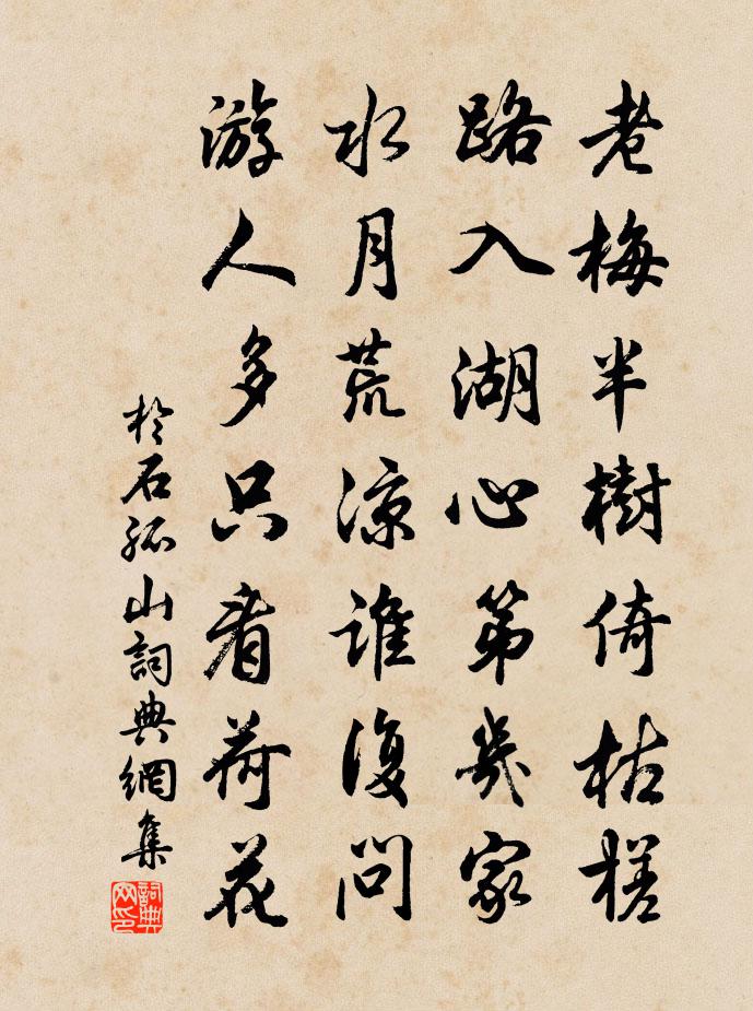 詩詞名句歷史字典書法欣賞書法字典國語詞典說文解字康熙字典古漢語字典標 題 作 者 詩 句 孤山作者:於石 朝代:宋代孤山原文老梅半樹倚枯槎,路入湖心第幾家。水月荒涼誰復問,遊人多隻看荷花。詩詞問答問:孤山的作者是誰?答:於石問:孤山寫於哪個朝代?答:宋代於石孤山書法欣賞孤山書法作品詩詞推薦送從律師西遊釋行肇〔宋代〕蟄鱗伺新春,望極融融歸。驚禽別舊巢,念遠遲遲飛。吁君腹至業,歲故志獨違。心弦世寡聽,意鑑古亦稀。出關除夜會飲南湖懷王鞏蘇轍〔宋代〕歲晚城東故相家,夜聽簾外落瓊花。醉眠東閣銀釭暗,起視中庭內竹斜。魯酒近來無奈薄,秦箏別後苦聞夸。思君憶東林因送二生歸齊己〔唐代〕好向東林度此生,半天山腳寺門平。紅霞嶂底潺潺色,清夜房前瑟瑟聲。偶別十年成瞬息,欲來千里阻刀兵。可憐立春內中帖子詞皇帝閣王珪〔唐代〕麗日凝丹闕,光風拂紫闈。欲知春色早,先上赭黃衣。白氏夫人生日二首仲並〔宋代〕相門苗裔正詵詵,長慶風流幾百春。吉夢忽隨秋日曉,祥光常對月華新。翰林大筆高前古,玉樹諸郎靄後塵。何假夏日田園雜興范成大〔宋代〕五月江吳麥秀寒,移秧披絮尚衣單。稻根科斗行如塊,田水今年一尺寬。王昭君曹勛〔宋代〕好惡由來各在人,況憑圖像覓天真。君王視聽能無壅,延壽何知敢妄陳。題廣福岩曹鄴〔唐代〕未有天地先融結,方廣高深無丈尺。書言不盡畫難成,留與人間作奇特。小重山許棐〔宋代〕正是拈芳采艷時。連朝風雨里,掩朱扉。強排春恨剪新詞。詞未就,鶯唱縷金衣。雲薄弄晴暉。試穿花逕去,揀雙綠陰亭自唐時有之到今五百年盧肇二三公題詩戴復古〔宋代〕慘慘秋風吹客襟,唐人遺蹟宋人吟。浮雲世事多遷變,不獨此亭無綠陰。好離鄉 景金本注云,二首本名南鄉子 述懷丘處機〔元代〕獨坐向南溪。一事無能百不知。所愛冥冥煙雨後,東西。雲綻峨峨列翠微。蒼骨太虛齊。冉冉寒光映日飛。何事中題韓乾馬岑津〔宋代〕左輔周垣隱白沙,龍媒絕種進天家。驕嘶玉勒憐豐草,渴飲冰泉帶落花。西狩還經千里棧,東巡會駕五雲車。權奇寄廣教主僧二首陳造〔宋代〕麥綰銀絲稻薦珠,春窗曾是飯伊蒲。明朝再蠟登山屐,更肯開單共飽無。南嶽魏監廟曩自請奉祠恬於聲利十餘年來益閉牟巘五〔宋代〕阿囝離鸞嗟囑耳,誰陪老婦祭瓶盆。二雛幸足寬懷抱,共說河汾有外孫。墨梅方蒙仲〔宋代〕補之敕謚村,簡齋致公輔。未必畫慚詩,只為遇不遇。和立齋蠟梅韻王柏〔宋代〕蠟花檀暈香如梅,攛號入譜名京垓。立齋形容訊息大,濃芳不受霜雪埋。疎影橫枝雖未足,淡淡中色攙先開。薰然九日殷堯藩〔唐代〕萬里飄零十二秋,不堪今倚夕陽樓。壯懷空擲班超筆,久客誰憐季子裘。瘴雨蠻煙朝暮景,平蕪野草古今愁。酣歌郭郎兒慢王哲〔元代〕自在逍遙,清靜恣閒行走。拄靈杖、慢垂寬袖。任彩霞、繚繞緊相隨,更遠遠香風,翠霧同來誘。忽昂頭,驀觀瑩龍興題額宋庠〔宋代〕八法神毫煥寶題,至今鸞鵲欲驚飛。臨空莫遣流塵晦,幸有仙人拂石衣。孔明衛宗武〔宋代〕龍臥而長吟,胸次抱奇偉。立心不北向,特為三顧起。曹瞞下荊州,氣可吞權備。奮袂為一出,遂成鼎足勢。忠誠名句推薦行人刁鬥風沙暗,公主琵琶幽怨多。李頎《古從軍行》 從極迷處識迷,則到處醒;將難放懷一放,則萬境寬。陳繼儒《小窗幽記·集醒篇》 閉門覓句陳無己,對客揮毫秦少游。黃庭堅《病起荊江亭即事》 不將辛苦意,難近世間財。馮夢龍《醒世恆言·卷十四》 千里搭長棚,沒有個不散的筵席曹雪芹《紅樓夢·第二十六回》 滯雨通宵又徹明,百憂如草雨中生。薛逢《長安夜雨》 一種青山秋草里,路人唯拜漢文陵許渾《途經秦始皇墓》 事諸父,如事父。事諸兄,如事兄。李毓秀《弟子規·出則弟》 崖崩路絕猿鳥去,惟有喬木攙天長。蘇軾《李思訓畫長江絕島圖》 歸雁橫秋,倦客思家。張可久《折桂令·九日》