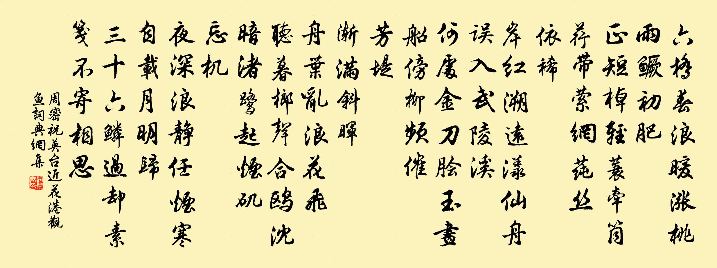 六橋春浪暖,漲桃雨、鱖初肥。正短棹輕蓑,牽筒荇帶,縈網蓴絲。
