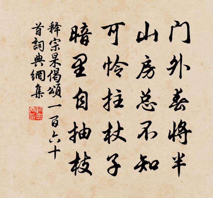詩詞名句歷史字典書法欣賞書法字典國語詞典說文解字康熙字典古漢語字典標 題 作 者 詩 句 偈頌一百六十首作者:釋宗杲 朝代:宋代偈頌一百六十首原文門外春將半,山房總不知。可憐拄杖子,暗裡自抽枝。詩詞問答問:偈頌一百六十首的作者是誰?答:釋宗杲問:偈頌一百六十首寫於哪個朝代?答:宋代釋宗杲偈頌一百六十首書法欣賞偈頌一百六十首書法作品詩詞推薦次韻劉著作過茆山今平甫往游因寄王安石〔宋代〕華陽仙伯有茆卿,官府今傳在赤城。三鶴不歸猶地勝,二君能到亦心清。詩中慷慨悲陳跡,篇末殷懃獎後生。遙想送李道士歸山崔峒〔唐代〕秋城臨古路,城上望君還。曠野入寒草,獨行隨遠山。授人鴻寶內,將犬白雲間。早晚燒丹罷,遙知冰雪寒。初到郡齋寄錢湖州李蘇州(聊取二郡一哂故有落句之戲)白居易〔唐代〕俱來滄海郡,半作白頭翁。謾道風煙接,何曾笑語同。吏稀秋稅畢,客散晚庭空。霽後當樓月,潮來滿座風。霅溪韋壽博書齋(一作溫庭筠詩)薛逢〔唐代〕玄晏先生已白頭,不隨鵷鷺狎群鷗。元卿謝免開三徑,平仲朝歸臥一裘。醉後獨知殷甲子,病來猶作晉春秋。塵纓神宗皇帝輓詞三首張耒〔宋代〕三百年成玉鼎丹,縞帷驚變紫宸班。遺弓有淚哀何及,嘶馬無蹤去不還。霜露無情金闕暗,山川常在石麟閒。青衫送紹興葉帥改當塗徐元傑〔宋代〕八年於外與民宜,遍歷穹台閫又麾。襟度乾坤無忤物,鬢髯霜雪卻緣誰。寬平到底人懷去,廉靖如初帝簡知。受善同曹清父西郊紀事五首方回〔宋代〕掛粟枯桑杪,籬門晝掩關。晴霜開曠野,寒日曬荒山。指點村煙外,經行冢樹間。群豪故貪愎,竊發亦愚奸。夏日三首·其一張耒〔宋代〕長夏村墟風日清,檐牙燕雀已生成。蝶衣曬粉花枝舞,蛛網添絲屋角晴。落落疏簾邀月影,嘈嘈虛枕納溪聲。久斑復睹三鄉題處留贈賈馳〔唐代〕壁古字未滅,聲長響不絕。蕙質本如雲,松心應耐雪。耿耿離幽谷,悠悠望甌越。杞婦哭夫時,城崩無此說。同陳郎中游南塘金君卿〔宋代〕廣輪三萬里聲明,四海謳歌號太平。恭已愛慈同漢景,息民寬厚似周成。九郊上帝天和應,載饗明堂孝意精。惟有道士張鑄〔宋代〕乘龍控魯真吾偶,化石燒金即我曹。塵世混來名異跡,蓬山思去夢魂勞。吟依古柏天風斷。嘯近倦壇海月高。九轉浣溪沙歐陽修〔宋代〕燈盡垂花月似霜。薄簾映月兩交光。酒醺紅粉自生香。雙手舞餘拖翠袖,一聲歌已釂金觴。休回嬌眼斷人腸。高龍學輓詩魏了翁〔宋代〕蜀自開禧後,西垂畏廩秋。更經兩單閼,盡棄五邊州。新沔依同谷,中梁恃武休。匆匆移米領,往往阻金牛。嶓冢和士特栽果十首椑柿劉子翬〔宋代〕秋林黃葉晚霜嚴,熟蒂甘香味獨兼。火傘頳虬浪褒拂,風標那似邑中黔。曉霜仇遠〔宋代〕重衾驚驟冷,萬瓦見濃霜。夾岸蒹葭白,空庭橘柚黃。宦情真淡泊,歲晚轉荒涼。野寺鐘聲早,何人仆馬忙。山行紀事洪咨夔〔宋代〕扉開日華早,路轉霜花鮮。游鴻得嘉客,健鶴隨老仙。舴艋野渡淺,略彴孤村連。紆餘盤龍外,杳靄烏猿邊。麥畦郭氏山林十六詠玉佩陸游〔宋代〕羣仙停鶴馭,玉佩搖空山。金丹定分子,往綴通明班。梧董天吉〔宋代〕一樹梧桐爛熳開,紫沉黃玉是花材。誰教著在朝陽地,勾引丹山老鳳來。鶴沖天馮延巳〔唐代〕曉月墜,宿雲披,銀燭錦屏幃。建章鍾動玉繩低,宮漏出花遲。春態淺,來雙燕,紅日初長一線。嚴妝欲罷囀黃鸝過白沙竹枝歌六首楊萬里〔宋代〕昨日下灘風打頭,羨他上水似輕鷗。朝來上水帆都卸,真箇輕鷗也自愁。名句推薦寥落古行宮,宮花寂寞紅。元稹《行宮》 荷笠帶斜陽,青山獨歸遠。劉長卿《送靈澈上人》 不義不富,不義不貴,不義不親,不義不近。墨子《墨子·08章 尚賢(上)》 稻根科斗行如塊,田水今年一尺寬。范成大《夏日田園雜興》 讀書不作儒生酸,躍馬西入金城關。謝逸《送董元達》 明日復明日,明日何其多。錢福《明日歌》 不肯畫堂朱戶,春風自在楊花。王安國《清平樂·春晚》 新園鎖卻愁陰,露黃漫委,寒香半畝。吳文英《瑞龍吟·送梅津》 村喜禾花實,峰看嶺岫重。趙汝愚《雨後送李將軍還祠偕同寅飲一杯亭》 朝雲亂人目,帝女湘川宿。吳均《登二妃廟》
