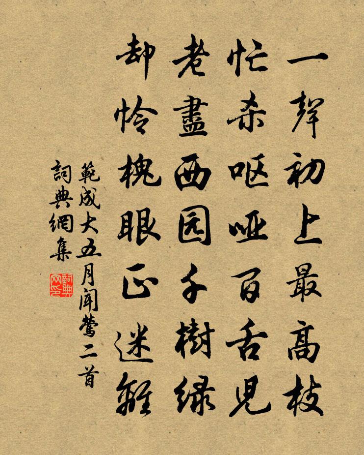 詩詞名句歷史字典書法欣賞書法字典國語詞典說文解字康熙字典古漢語字典標 題 作 者 詩 句 五月聞鶯二首作者:范成大 朝代:宋代五月聞鶯二首原文一聲初上最高枝,忙殺嘔啞百舌兒。老盡西園千樹綠,卻憐槐眼正迷離。詩詞問答問:五月聞鶯二首的作者是誰?答:范成大問:五月聞鶯二首寫於哪個朝代?答:宋代問:范成大的名句有哪些?答:范成大名句大全范成大五月聞鶯二首書法欣賞五月聞鶯二首書法作品詩詞推薦雜曲歌辭。妾薄命李百藥〔唐代〕團扇秋風起,長門夜月明。羞聞拊背入,恨說舞腰輕。太常應已醉,劉君恆帶酲。橫陳每虛設,吉夢竟何成。醉翁操辛棄疾〔宋代〕長松。之風。如公。肯余從。山中。人心與吾兮誰問。湛湛千里之江。上有楓。噫,送子東。望君之門兮九重。女春登南昌城翁卷〔宋代〕獨立高城四望低,望中無物不堪題。欲知春事幾深淺,芳草青青猶未齊。頌古五十七首釋道昌〔宋代〕得因失有,是在非邊。根源未斷,枝派相連。不言言,口何在,轉得身來人下載。一帆風過洞庭湖,對面須已違背和襲美虎丘寺西小溪閒泛三絕陸龜蒙〔唐代〕樹號相思枝拂地,鳥語提壺聲滿溪。雲涯一里千萬曲,直是漁翁行也迷。荒柳臥波渾似困,宿雲遮塢未全痴。雲情直院中書莫公殂往哀痛不成文輒留小詩靈幾並葉適〔宋代〕閣老今無地上身,黃麻紫誥兩沉淪。虛懸東嶺來時月,難挽西山去後春。試割冰鱸猶脆薄,重餐野橘尚甘辛。最憐會張仲實宅得天字方回〔宋代〕兵甲更多難,桑榆迫暮年。孰能容此老,猶得並諸賢。空闊瞻喬木,推移嘆逝川。醉鄉春有路,暫覺異寒天。初冬快晴陪宣卿叔夏遊石頭庵過三生藏窮深極胡寅〔宋代〕祝融朝日麗東天,裊裊西風紫雁前。千玉散青攢疊巘,萬雲流白漲晴川。挽李中甫使君孫應時〔宋代〕赫赫中興佐,英風想大門。得交人物懿,喜見典刑存。拱立嚴諸父,躬行表後昆。世家今萬石,一代合推尊。萬年春馬鈺〔元代〕*人人學道總勞勞。個個心高志不高。煙火靡除生怨惡,塵情不斷起貪饕。欲搜玄妙消三業,猛向根芽下一刀。常又次韻二首周必大〔宋代〕川流元滾滾,客至喜津津。卜築新形勢,逢迎舊主人。酒杯容我醉,詩句味君醇。大隱聊城市,岩耕笑子真。滿江紅(赴玉山之謫,與諸父泛舟大澤,分題為別)晁補之〔宋代〕莫話南征,船頭轉、三千餘里。未嘆此、浮生飄蕩,但傷佳會。滿眼青山芳草外,半篙碧水斜陽里。問此中、何處前漢門劉聖公周曇〔唐代〕不納良謀劉縯言,胡為銜璧向崇宣。傷哉亂帝途窮處,何必當時譖福先。論詩俞桂〔宋代〕大道本無體,何在文字間。昴從先天畫,詩自聖人刪。流風傳益遠,後作莫可攀。推敲誰氏子,一字不可閒。扈從郊廟因呈兩省諸公韓翃〔唐代〕丹墀列士主恩同,廄馬翩翩出漢宮。奉引乘輿金仗里,親嘗賜食玉盤中。晝趨行殿旌門北,夜宿齋房刻漏東。明日句釋曉瑩〔宋代〕一言知具眼。書維揚張君梅卷方岳〔宋代〕月明臨得霜橋影,只恁橫斜自一奇。喚起江南歸夢遠,竹村煙水有茅茨。滿庭芳(代鄉老眾賓勸鄉大夫)史浩〔宋代〕復擁旌麾,重歌襦衤夸,滿城長自春容。搢紳耆舊,歡溢笑談中。盡道邦君愷悌,逍遙遂、湖海遐蹤。今朝會,公踏莎行(寄姊妹)蘇氏〔宋代〕孤館深沈,曉寒天氣。解鞍獨自闌乾倚。暗香浮動月黃昏,落梅風送沾衣袂。待寫紅箋,憑誰與寄。先教覓取嬉遊菩薩蠻晁端禮〔宋代〕薄衾小枕重門閉。孤燈照著人無寐。風雨夜來多。春寒可奈何。深閨香暖處。還解憐人否。只道不來歸。那知心似名句推薦宿醉離愁慢髻鬟,六銖衣薄惹輕寒,慵紅悶翠掩青鸞韓偓《浣溪沙·宿醉離愁慢髻鬟》 不義而富且貴,於我如浮雲。孔子弟子《論語·述而篇》 風送梅花過小橋,飄飄。趙顯宏《晝夜樂·冬》 天長地久。天地所以能長且久者,以其不自生,故能長生。是以聖人後其身而身先,外其身而身存。非以其無私邪老子《老子·道經·第七章》 雨里雞鳴一兩家,竹溪村路板橋斜。王建《雨過山村》 常恐秋節至,焜黃華葉衰。佚名《長歌行》 造化鍾神秀,陰陽割昏曉。杜甫《望岳》 久廢山行疲犖确,尚能村醉舞淋浪。蘇軾《捕蝗至浮雲嶺山行疲苶有懷子由弟二首·其二》 低花樹映小妝樓,春入眉心兩點愁。白居易《春詞》 落花水香茅舍晚,斷橋頭賣魚人散。馬致遠《壽陽曲·遠浦帆歸》