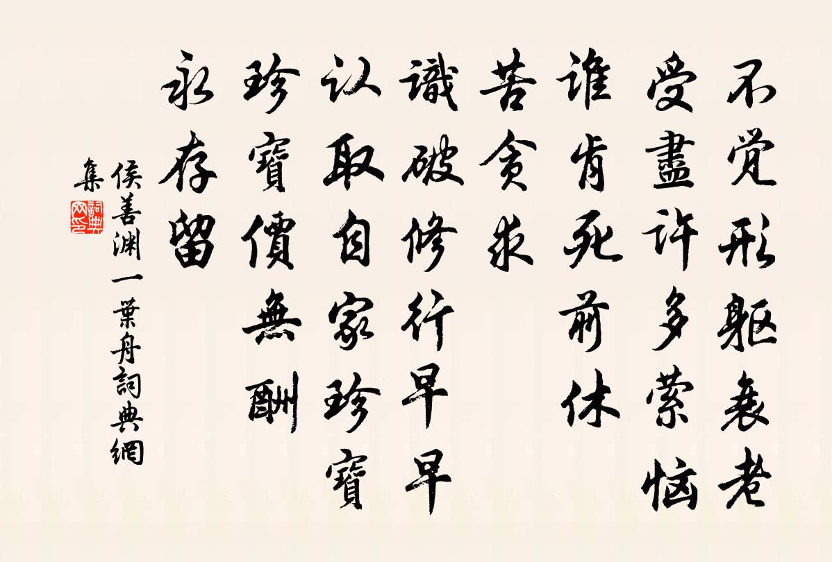 詩詞名句歷史字典書法欣賞書法字典國語詞典說文解字康熙字典古漢語字典標 題 作 者 詩 句 一葉舟作者:侯善淵 朝代:元代一葉舟原文不覺形軀衰老。受盡許多縈惱。誰肯死前休。苦貪求。識破修行早早。認取自家珍寶。珍寶價無酬。永存留。詩詞問答問:一葉舟的作者是誰?答:侯善淵問:一葉舟寫於哪個朝代?答:元代問:一葉舟是什麼體裁?答:詞侯善淵一葉舟書法欣賞一葉舟書法作品詩詞推薦登祝融寺蘭若盧肇〔唐代〕祝融絕頂萬餘層,策杖攀蘿步步登。行到月宮霞外寺,白雲相伴兩三僧。水調歌頭朱熹〔宋代〕不見嚴夫子,寂寞富春山。空餘千太危石,高插暮雲端。想像羊裘披了,一笑兩忘身世,來把釣魚竿。不似林間翮長歌行陸游〔宋代〕不羨騎鶴上青天,不羨峨冠明主前,但願少賒死,得見平胡年。一朝胡運衰,送死桑乾川,胡星澹無光,龍庭為飛寄張趙二相三首胡寅〔宋代〕賢哲不同才,論心則皆仁。去就不同趨,惟義乃可親。仁非比周用,推己以逮人。義非楚越疏,雇不私其身。伊誰西江月謝逸〔宋代〕木末誰攀新萼,雪消自種前庭。莫嫌開過尚盈盈。似待詩人醉詠。霜後最添妍麗,風中更覺娉婷。影搖溪水一灣清宿茅山寄舍弟徐鉉〔唐代〕茅許稟靈氣,一家同上賓。仙山空有廟,舉世更無人。獨往誠違俗,浮名亦累真。當年各自勉,雲洞鎮長春。自贊善相王邁〔宋代〕三分相士七分非,又似枯臞又似肥。好待功成名遂後,煩君只畫著蓑衣。柳葉詞徐照〔宋代〕嫩葉吹風不自持,淺黃微綠映清池。玉人未識分離恨,折向堂前學畫眉。送傅宏著作歸覲待觀城闕蘇轍〔宋代〕膠西前輩鄭康成,千載遺風及後生。舊學詩書儒術富,兼通法律吏能精。還家彩服頻為壽,得邑河壖喜有兵。民事句熊蕃〔宋代〕僻疑昏有虎,靜怪曉無雞。送人廷對卓田〔宋代〕古來幾段奇功名,不付尋常齷齪人。將軍本是度外事,登壇四顧今人驚。夾道鶯花三月暮,濁酒離亭送君去。臨岐吟樂天自問愴然有作劉禹錫〔唐代〕親友關心皆不見,風光滿眼倍傷神。洛陽城裡多池館,幾處花開有主人。寒夜文宴潤卿有期不至皮日休〔唐代〕草堂虛灑待高真,不意清齋避世塵。料得焚香無別事,存心應降月夫人。夜聞秋聲仇遠〔宋代〕西南振響使人驚,未必秋聲作此聲。萬騎賓士鼙鼓動,千夫翻踏桔槹鳴。初疑潮汐還疑雨,只在山林不在城。人道張令鹿門圖虞集〔元代〕張侯襄陽人,深知襄陽樂。十年宦學懷襄陽,故托豪縑寫山郭。老我不樂思蜀都,人言嵩陽好隱居。三十六峰常對送鄭惠叔司封江西提舉樓鑰〔宋代〕君名切斗魁,步武上霄極。蓬萊群玉府,圖書照奎壁。郎官應列宿,寖覺象緯逼。胡為作吏星,炯炯向江國。仰奉水龍吟(游釣台作)葛立方〔宋代〕九州雄傑溪山,遂安自古稱佳處。雲迷半嶺,風號淺瀨,輕舟斜渡。朱閣橫飛,漁磯無恙,鳥啼林塢。吊高人陳跡題劉武翼息齋曾豐〔宋代〕天地一從開闢始,左旋右圍長不已。詰所以然氣使之,君獨不為氣所使。平生由氣今自由,三平二滿過即休。千里和四弟夏雨孔武仲〔宋代〕蠶月雨冥冥,愁雲滿太清。庭階猶積潤,溝港更繁聲。嫩綠應浮野,余涼稍及城。隋河今不淺,放艇欲南征。次弟觀似單君范陳著〔宋代〕可人忽相訪,恰恰應鐙花。古話達時樣,霜毛感歲華。雨中書枕榻,山下菜羹家。一笑君聽取,歸期待白鴉。名句推薦世治不輕,世亂不沮;同弗與,異弗非也。戴聖《禮記·儒行》 鳳凋碧柳愁眉淡,露染黃花笑靨深。晏幾道《鷓鴣天·九日悲秋不到心》 暮從碧山下,山月隨人歸。李白《下終南山過斛斯山人宿置酒》 雙槳來時,有人似、舊曲桃根桃葉。姜夔《琵琶仙·雙槳來時》 誰言寸草心,報得三春暉。孟郊《遊子吟 / 迎母漂上作》 舉觴酹先酒,為我驅憂煩。柳宗元《飲酒》 遠岫出山催薄暮,細風吹雨弄輕陰。梨花欲謝恐難禁。李清照《浣溪沙·小院閒窗春色深》 自笑堂堂漢使,得似洋洋河水,依舊只流東陳亮《水調歌頭·送章德茂大卿使虜》 青山一道同雲雨,明月何曾是兩鄉。王昌齡《送柴侍御》 鞭撲之子,不從父之教劉向《說苑·雜言》