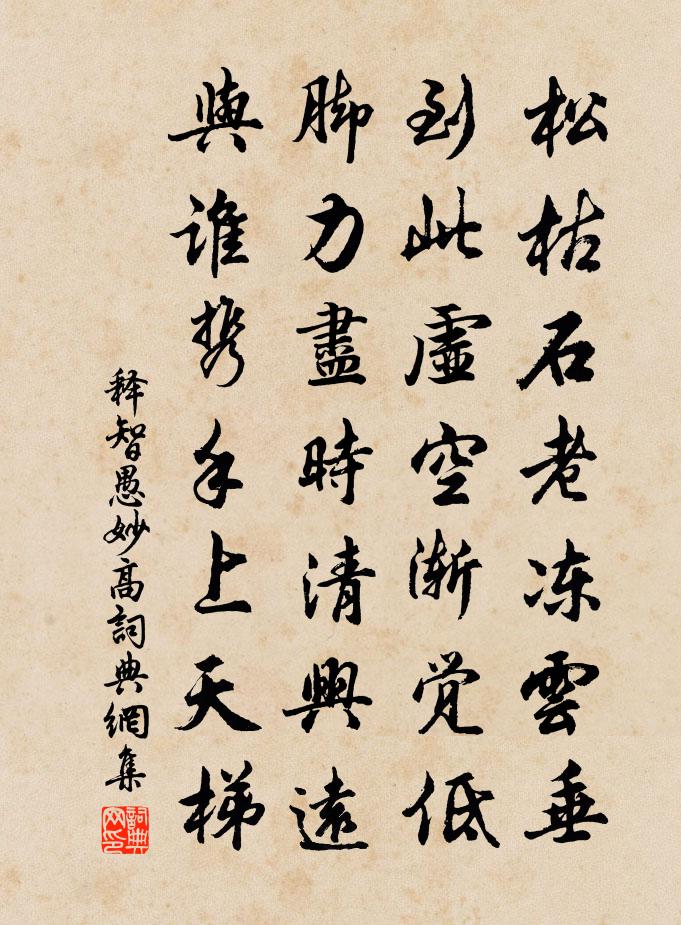 詩詞名句歷史字典書法欣賞書法字典國語詞典說文解字康熙字典古漢語字典標 題 作 者 詩 句 妙高作者:釋智愚 朝代:宋代妙高原文松枯石老凍雲垂,到此虛空漸覺低。腳力盡時清興遠,與誰攜手上天梯。詩詞問答問:妙高的作者是誰?答:釋智愚問:妙高寫於哪個朝代?答:宋代釋智愚妙高書法欣賞妙高書法作品詩詞推薦詩上堯夫先生兼寄伯游正叔張載〔宋代〕病肺支離恰十春,病深樽俎久埃塵。人憐舊病新年減,不道新添別病深。怨王孫(春情)姚寬〔宋代〕毿毿楊柳綠初低。澹澹梨花開未齊。樓上情人聽馬嘶。憶郎歸。細雨春風濕酒旗。李侯新齋植松竹聊為雜言張舜民〔宋代〕嘗聞君子居,一日顧必葺。李侯作新齋,制度皆自給。軒楹如肺腑,豁達可出入。取竹渭水湄,移松隴山隰。歲寒句樊晃〔唐代〕巧裁蟬鬢畏風吹,盡作蛾眉恐人妒。翁通判通輓詞徐璣〔宋代〕處已先能儉,為官易得清。長卿詩最好,叔度德難名。歸旐郴江遠,新墳秀嶺平。松楸本相望,惆悵不堪情。贈人佚名〔唐代〕平生才不足,立身信有餘。自嘆無大故,君子莫相疏。擬阮步兵夜中不能寐賀鑄〔宋代〕夜久不成夢,張燈開故書。清霜屏雲物,有月來庭除。良時悵難再,不與佳人俱。掩卷長太息,望子城之隅。越王台吳浚〔宋代〕越王歌舞地,南國古繁雄。水闊山光迥,天低海氣通。千舠民蛋雨,一塔賈胡風。欲問興亡事,松聲自半空。小兒詩路德延〔唐代〕情態任天然,桃紅兩頰鮮。乍行人共看,初語客多憐。臂膊肥如瓠,肌膚軟勝綿。長頭才覆額,分角漸垂肩。散誕閒遊陸游〔宋代〕溪橋偶與僧游話,草市來尋逆旅炊。自笑一生為客慣,捉驢小豎訴朝飢。一春宋白〔宋代〕一春情調淡悠悠,閒倚書窗背小樓。暖日只添中酒睡,晚風頻動惜花愁。鶯沖舞蝶侵人過,絮逐天絲觸處游。已為念奴嬌·鳳凰山下張紅橋〔明代〕鳳凰山下,恨聲聲玉漏、今宵易歇。三疊陽關歌未競,啞啞棲鳥催別。含怨吞聲,兩行清淚,漬透千重鐵。重來休送紫霄女道士四明謝君陸游〔宋代〕一別南充十四年,時時清夢到金泉。山 * 上秋風早,卻見神仙小自然。王都尉示及呂丞相柳溪圖詩見邀同作走筆奉呈蘇頌〔宋代〕愛君圖寫柳溪游,想像濠梁問子休。漁釣每懷班嗣壑,煙波疑在志和舟。清時未易忘軒冕,大隱何妨傲葛裘。應笑句楊炎正〔宋代〕漁人四五家。秋思陸游〔宋代〕出門東行復西行,處處人家打稻聲。小瓮秫醅雖未熟,後園楮蕈已堪烹。九日觀萬堂小酌懷正仲及梅所鍊師舒岳祥〔宋代〕極目冥鴻顥氣初,人生快意食鱸魚。剪來萸菊觸新酒,麾去蚊蠅府舊書。騷雅劉郎今健否,清修周老近何如。篆畦句楊徽之〔唐代〕戍樓煙乍直,戰地雨長腥。初夏遊謝公岩徐璣〔宋代〕又取紗衣換,天晴起細風。清陰花落後,長日鳥啼中。水國乘舟樂,岩扉有路通。州民多到此,獨自憶髯公。偈頌一百六十首釋宗杲〔宋代〕百雜碎,沒縫罅。明眼衲僧,盲聾瘖啞,金剛水際藏知,非非想天走馬。名句推薦去年今日關山路,細雨梅花正斷魂。蘇軾《正月二十日往岐亭郡人潘古郭三人送余於女王城東禪莊院》 不知何處火,來就客心然。沈佺期《寒食》 童子解吟長恨曲,胡兒能唱琵琶篇。李忱《吊白居易》 聞道皇華使,方隨皂蓋臣。王維《送李判官赴東江》 朕以天下為憂,豈直一 方耶?脫脫《宋史·本紀·卷六》 獨王之國,勞而多禍管仲《管子·形勢》 秋來相顧尚飄蓬,未就丹砂愧葛洪。杜甫《贈李白》 男兒不展風雲志,空負天生八尺軀。馮夢龍《警世通言·卷四十》 公生明,偏生暗荀子《荀子·不苟》 布衣菜飯,可樂終身,不必作遠遊計也。沈復《浮生六記·閨房記樂》