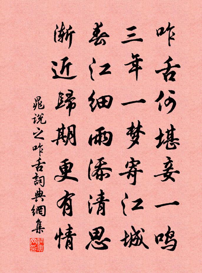 詩詞名句歷史字典書法欣賞書法字典國語詞典說文解字康熙字典古漢語字典標 題 作 者 詩 句 咋舌作者:晁說之 朝代:宋代咋舌原文咋舌何堪妾一鳴,三年一夢寄江城。春江細雨添清思,漸近歸期更有情。詩詞問答問:咋舌的作者是誰?答:晁說之問:咋舌寫於哪個朝代?答:宋代晁說之咋舌書法欣賞咋舌書法作品詩詞推薦奉餞高尊師如貴道士傳道籙畢歸北海李白〔唐代〕道隱不可見,靈書藏洞天。吾師四萬劫,歷世遞相傳。別杖留青竹,行歌躡紫煙。離心無遠近,長在玉京懸。山中別李處士王績〔唐代〕為向東溪道,人來路漸賒。山中春酒熟,何處得停家。東魯門泛舟二首李白〔唐代〕日落沙明天倒開,波搖石動水縈迴。 輕舟泛月尋溪轉,疑是山陰雪後來。 水作青龍盤石堤,桃花夾岸魯門西。寄霅川刁殿丞十二韻趙湘〔唐代〕柳渾曾吟郡,中間遇牧之。留連皆往日,寂寞偶多時。物象應無改,軒車自有期。憶山辭闕早,採藥上官遲。澤國頌古十九首釋法全〔宋代〕亂撒明珠顆顆晶,走盤應不貴金聲。誰家女子能針紅,一串穿來不剩星。送客回,晚興白居易〔唐代〕城上雲霧開,沙頭風浪定。參差亂山出,澹濘平江淨。行客舟已遠,居人酒初醒。裊裊秋竹梢,巴蟬聲似磬。和匏齋菊花丘葵〔宋代〕東籬曾手種,賴以制頹年。白髮經秋別,黃花入夢圓。一場蜂蝶後,老圃雪霜前。不是耽幽隱,淵明地自偏。禱晴福善方岳〔宋代〕稻壓田塍米似珠,老農為說幾年無。一晴不費君王力,莫等香菸上化爐。偈頌一百二十三首釋祖欽〔宋代〕兩岸夭桃花欲燃,一絲風動釣魚船。莫言世上無仙客,須信壺中別有天。詠梅分韻得蕊字陳傅良〔宋代〕惜樹須惜枝,看花須看蕊。枯瘦發纖穠,況此具眾美。千林墮黃埃,數點昭青泚。誰知霜雪深,天意欲玉女。派派泉陳岩〔宋代〕水源同出萬山頭,上半支分各自流。曲折繞從山下去,短莎隨地弄輕柔。偈頌九十三首釋梵琮〔宋代〕也大奇,也大奇,住個庵兒最好嬉。兩個兒童忽相打,中間一攧少人知。卻愁騎馬滑,故作泛舟歸。贈劉琨詩二十首 十五盧諶〔魏晉〕綿綿女蘿。施於松標。稟澤洪乾。晞陽豐條。根淺難固。莖弱易雕。操彼纖質。承此沖飆。四明山詩過雲陸龜蒙〔唐代〕相訪一程雲,雲深路僅分。嘯台隨日辨,樵斧帶風聞。曉著衣全濕,寒沖酒不醺。幾回歸思靜,仿佛見蘇君。贈盧次夔葉適〔宋代〕家住東郊深,能詩人共尋。冰梭間道錦,玉軫斷文琴。城漏宵添滴,窗花晝減陰。新涼白頭句,清甚費悲吟。贊崇禧丈室二仙圖張榘〔宋代〕鹿皮槲葉,容顏枯槁。於巾白袍,飄然氣貌。不同者形,所同者道。金丹一丸,天地同老。六和謝其見訪劉克莊〔宋代〕薄有雞豚趁墟市,寂無鳥雀下階除。疾馳輕騎銜枚至,興盡扁舟激箭如。我老幻身聊據槁,君豪詩骨可專車。吾聞詠史孫應時〔宋代〕咄咄歸來技已窮,函書翻欲媚桓公。佳兒似此何須數,空使諸人恕乃翁。朔風詩曹植〔魏晉〕四氣代謝。懸景運周。別如俯仰。脫若三秋。昔我初遷。朱華未晞。今我旋止。素雪雲飛。句趙必范〔宋代〕歲點飛花芳徑雨,一雙新燕荻簾風。名句推薦仁者之為天下度也,辟之無以異乎孝子之為親度也。墨子《墨子·22章 節用(下)》 短夢依然江表,老淚灑西州。張炎《八聲甘州·記玉關踏雪事清游》 終日望君君不至,舉頭聞鵲喜。馮延巳《謁金門·風乍起》 泥融飛燕子,沙暖睡鴛鴦。杜甫《絕句二首》 策馬自沙漠,長驅登塞垣。高適《薊中作》 今日漢宮人,明朝胡地妾。李白《王昭君二首》 湘女歸魂,佩環玉冷無聲,凝情誰訴。吳文英《過秦樓·黃鐘商芙蓉》 低頭獨長嘆,此嘆無人喻。白居易《買花 / 牡丹》 合軍聚眾, 務在激氣孫臏《孫臏兵法·延氣》 別日南鴻才北去,今朝北雁又南飛。魚玄機《閨怨》