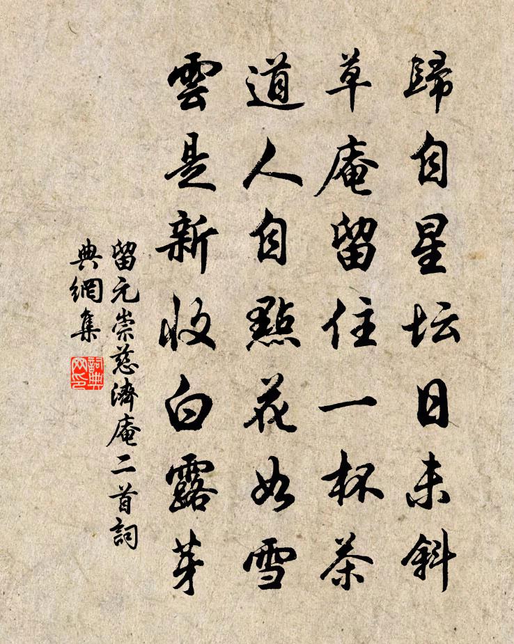 詩詞名句歷史字典書法欣賞書法字典國語詞典說文解字康熙字典古漢語字典標 題 作 者 詩 句 慈濟庵二首作者:留元崇 朝代:宋代慈濟庵二首原文歸自星壇日未斜,草庵留住一杯茶。道人自點花如雪,雲是新收白露芽。詩詞問答問:慈濟庵二首的作者是誰?答:留元崇問:慈濟庵二首寫於哪個朝代?答:宋代留元崇慈濟庵二首書法欣賞慈濟庵二首書法作品詩詞推薦和蔣御帶薦合中三偈釋師觀〔宋代〕威風凜凜實難棲,正是靈山受記時。老倒月林無別說,非心非佛總非非。慈谿龍虎軒偶成呂祖儉〔宋代〕龍蟠虎踞秣陵城,甬上蒼官亦強名。獨占高峰傲千古,夜深月照落潮聲。登樓對雪二首張嵲〔宋代〕朔風幾夜相回薄,世路只今多苦辛。擒寇可無懸瓠將,泛舟未許剡溪人。送友人游塞賈島〔唐代〕飄蓬多塞下,君見益潸然。迥磧沙銜日,長河水接天。夜泉行客火,曉戍向京煙。少結相思恨,佳期芳草前。初冬郊行仇遠〔宋代〕懶向南園拜石兄,肯尋村叟傍溪行。黃雲覆畝金穰熟,白露橫江紅葉明。彭澤歸來辭內景,康衢擊壤曲中聲。一丁顏惠詹事即孤侄舅氏謫官黔巫舟中相遇愴然有寄鄭谷〔唐代〕猶子在天末,念渠懷渭陽。巴山偶會遇,江浦共悲涼。謫宦君何遠,窮游我自強。瘴村三月暮,雨熟野梅黃。寄萬德躬故居戴叔倫〔唐代〕日暮山風吹女蘿,故人舟楫定如何。呂仙祠下寒砧急,帝子閣前秋水多。閩海風塵鳴戍鼓,江湖煙雨暗漁蓑。何時減字木蘭花(用舊韻戲吳奉議)舒亶〔宋代〕眉山斂額。往事追思空手拍。雁字頻飛。生怕人來說著伊。閒拋繡履。愁殢香衾渾不起。莫似揚州。只作尋常薄倖句朱浚〔宋代〕西風落葉長安夢,晚節寒華老圃心。滿庭霜(述懷)葛郯〔宋代〕歸去來兮,苕谿深處,上有蒼翠千峰。月橋煙墅,家在五湖東。試覓桃花流水,雞犬靜、人跡才通。沙汀晚,一天南柯子(次韻南劍趙倅)曾覿〔宋代〕粉黛娉婷艷,芝蘭笑語香。延平春色斗芬芳。不管清宵更漏、聽霓裳。燭暗人方醉,杯傳意更長。可堪羈客九迴腸太師中書令魏國公冊贈尚書令追封真定王趙挽王禹偁〔宋代〕忍聽咚咚窆鼓聲,笳簫鳴咽暮雲凝。勳勞自契約蕭相,諡法還須比魏徵。曉月暗垂丹旐露,夜風輕觸繐帷燈。三川次韻林明甫言志李彌遜〔宋代〕老竹抽萌便出林,焉知來者不如今。但看杞梓終成棟,不信潢污解作霖。久客謾撩蘇子恨,中流應動祖生心。乘桴荊溪館夜坐陸游〔宋代〕河漢無聲天正青,三三五五滿天星。草根冷露黏濕螢,幽人岸巾坐津亭。憶下瞿唐浮洞庭,陽台繫船夢娉婷。朱門秀才石君予同年子也攜書見投重之以歌詩意甚蘇頌〔宋代〕石生故人子,袖書遠相過。趨翔有父風,步闊冠峨峨。自言少也孤,奉親由江鄱。區區營甘旨,靡暇謀其他。三十題崇因院清軒王之道〔宋代〕肥松瘦竹古招提,軒檻重遊識舊題。清意不曾吟得盡,夜來明月浸寒溪。水調歌頭(擬饒州法曹掾作)毛滂〔宋代〕金馬空故事,方朔漫多端。三千牘在,玉殿何日賜清閒。難戀長安鍾漏,誰借青雲咳唾,拂袖且東還。笑殺長纓使贈徐道士游京師陳舜俞〔宋代〕有客人形善鑒觀,過門聊肯駐征鞍。知予謾失江湖約,笑我甘為簿領官。卜隱日邊龍闕近,去程霜里鶴衣寒。京師師繹題宮姊夫惠示湖莊佳句輒次韻曹彥約〔宋代〕願學言詩賜,降心識字雄。絕塵嗟莫及,雅趣喜相同。任性天憐老,貪閒鬼笑窮。可堪香火分,誤入武陵中。呈大德禪師尹輔〔宋代〕支遁行藏惠遠才,幾年嵩少避浮埃。八行丹詔雲間落,一對紫衣天上來。誦律夜窗寒月皎,閉門秋渚白蓮開。名高名句推薦我與我周旋久,寧作我。劉義慶《世說新語·品藻》 荷花開後西湖好,載酒來時。歐陽修《採桑子·荷花開後西湖好》 乃幽武置大窖中,絕不飲食。天雨雪。班固《蘇武傳(節選)》 麋鹿成群,虎豹避之;飛鳥成列,鷹鷲不擊劉向《說苑·雜言》 浩氣清英,仙材卓犖,下土難分別丘處機《無俗念·靈虛宮梨花詞》 願學秋胡婦,貞心比古松。李白《湖邊採蓮婦》 吳宮花草埋幽徑,晉代衣冠成古丘。李白《登金陵鳳凰台》 今宵絕勝無人共,臥看星河盡意明。陳與義《雨晴·天缺西南江面清》 桃花嫣然出籬笑,似開未開最有情。汪藻《春日·一春略無十日晴》 來歲花前。又是今年憶去年。呂本中《減字木蘭花·去年今夜》