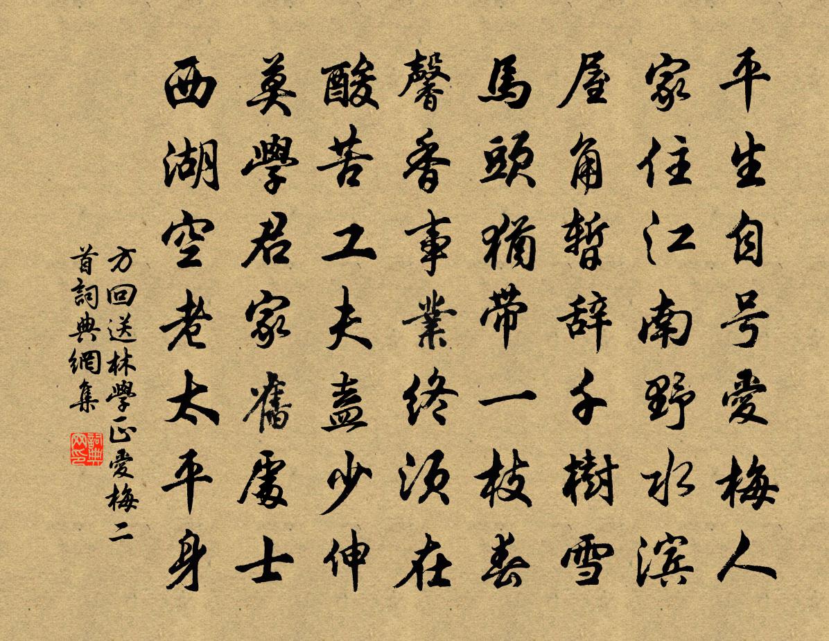 詩詞名句歷史字典書法欣賞書法字典國語詞典說文解字康熙字典古漢語字典標 題 作 者 詩 句 送林學正愛梅二首作者:方回 朝代:宋代送林學正愛梅二首原文平生自號愛梅人,家住江南野水濱。屋角暫辭千樹雪,馬頭猶帶一枝春。馨香事業終須在,酸苦工夫盍少伸。莫學君家舊處士,西湖空老太平身。詩詞問答問:送林學正愛梅二首的作者是誰?答:方回問:送林學正愛梅二首寫於哪個朝代?答:宋代方回送林學正愛梅二首書法欣賞送林學正愛梅二首書法作品詩詞推薦宿廣德寺寄從舅張籍〔唐代〕古寺客堂空,開簾四面風。移床動棲鶴,停燭聚飛蟲。閒臥逐涼處,遠愁生靜中。林西微月色,思與寧家同。奉和江沖陶居二十韻汪炎昶〔宋代〕割雲石棱銛,纏藤松骨槁。少華且未登,昌黎應絕倒。宿真元觀陳深〔宋代〕汎汎春風湖上舟,幽尋不覺到瀛洲。碧桃花落門前地,翠柳陰垂水際樓。半夜鶴鳴松院靜,一天星照石池幽。瑤林紅林檎近(雙調·第二)周邦彥〔宋代〕風雪驚初霽,水鄉增暮寒。樹杪墮飛羽,檐牙掛琅玕。才喜門堆巷積,可惜迤邐銷殘。漸看低竹翩翻。清池漲微瀾十疊劉克莊〔宋代〕才得幾朝渾拆遍,只消一霎又吹空。何曾學舞能回雪,便不為台與避風。公無渡河李鹹用〔唐代〕有叟有叟何清狂,行搔短髮提壺漿。亂流直涉神洋洋,妻止不聽追沈湘。偕老不偕死,箜篌遺淒涼。刳松輕穩琅玕次韻董伯和鐙夕有感二首陳著〔宋代〕萬鐙無復艷端門,一簇星球里域春。羌調悲酸吹笛社,村聲祥瑞賣餳人。鬼神亦要民心樂,山谷聊舒世態顰。最好游浯溪徐自明〔宋代〕□□□□□□奇,金石輝輝萬古垂。論定固知名貴正,時危更識禮從宜。溪山不老刊長在,天地重開繼者誰。多少雪楊公遠〔宋代〕怪得雲頑凍不開,漫空忽攪豆稭灰。青留一半窗前竹,白勝三分屋外格。剡曲舟應撐月去,灞橋驢想得詩回。吾儂辛未寇萊公祠張埴〔宋代〕脫去朝衣出禁天,武陵山色識瓢仙。匆匆歲月十數字,黯黯風煙二百年。自古難全吹唯晚節,至今猶洌是寒泉。幾長生樂晏殊〔宋代〕閬苑神仙平地見。碧海架蓬瀛。洞門相向,倚金鋪微明。處處天花撩亂,飄散歌聲。裝真筵壽,賜與流霞滿瑤觥。燭影搖紅孫惟信〔宋代〕一朵鞓紅,寶釵壓髻東風溜。年時也是牡丹時,相見花邊酒。初試夾紗半袖。與花枝、盈盈斗秀。對花臨景,為景頌古三十八首釋從瑾〔宋代〕南枝向暖北枝寒,何事春風作兩般。憑仗高樓莫吹笛,大家留取倚闌看。別行簡(時行簡辟盧坦劍南東川府)白居易〔唐代〕漠漠病眼花,星星愁鬢雪。筋骸已衰憊,形影仍分訣。梓州二千里,劍門五六月。豈是遠行時?火雲燒棧熱。何言隱靜道中陳造〔宋代〕晴日暝復出,煙雲尚飛浮。東風解人意,松間作颼飀。罷馬不用鞭,正愜道塗修。涼氣濯毛骨,百疾洒然瘳。縈紆惜別五首程公許〔宋代〕憂患磨人鬢易皤,近來更覺別懷難。霜筠雪柏圖堅耐,願保貞心共歲寒。秋夜與空舟弄泉於北溪之上賦是詩趙文〔宋代〕四更欲盡草露濕,萬籟不鳴山月閒。往往虎蹄留道上,時時人語出林間。暑中雜詠蘇舜欽〔宋代〕嘉果浮沉酒半醺,床頭書冊亂紛紛。北軒涼吹開疏竹,臥看青天行白雲。 山行陸游〔宋代〕南出柴門即是山,青鞋踏破白雲間。旋償酒券何時足?罷諾僧碑盡日閒。三尺古琴余爨跡,一枝禪杖帶湘斑。吾廬題義門胡氏華林書院宋琪〔宋代〕賢良肄業文方盛,孝友傳家族更豪。旌表特恩門第貴,御書新賜姓名高。謀孫有後榮非數,待士無疏眾豈勞。我想名句推薦五月五日午,贈我一枝艾。文天祥《端午即事》 一日不思量,也攢眉千度。柳永《晝夜樂·洞房記得初相遇》 魯酒不可醉,齊歌空復情。李白《沙丘城下寄杜甫》 天意憐幽草,人間重晚晴。李商隱《晚晴》 明日巴陵道,秋山又幾重。李益《喜見外弟又言別》 秋花冒綠水,密葉羅青煙。李白《古風·其五十九》 細雨斜風作曉寒。淡煙疏柳媚晴灘。蘇軾《浣溪沙·元豐七年十二月二十四日從泗州劉倩叔游南山》 家國興亡自有時,吳人何苦怨西施。羅隱《西施》 有不可及之志,必有不可及之功王永彬《圍爐夜話·第一三O則》 大禹理百川,兒啼不窺家李白《公無渡河》