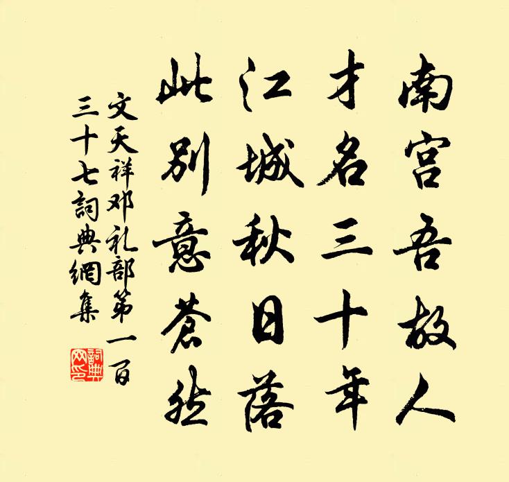 詩詞名句歷史字典書法欣賞書法字典國語詞典說文解字康熙字典古漢語字典標 題 作 者 詩 句 鄧禮部第一百三十七作者:文天祥 朝代:宋代鄧禮部第一百三十七原文南宮吾故人,才名三十年。江城秋日落,此別意蒼然。詩詞問答問:鄧禮部第一百三十七的作者是誰?答:文天祥問:鄧禮部第一百三十七寫於哪個朝代?答:宋代問:文天祥的名句有哪些?答:文天祥名句大全文天祥鄧禮部第一百三十七書法欣賞鄧禮部第一百三十七書法作品詩詞推薦寒食出郊三首李揆〔宋代〕寒食深山路,桃花雨里開。可憐傳檄出,不為踏青來。泥滑竹岡下,雞鳴田舍隈。邱園二十里,松檟有餘哀。論詩三十首·十九元好問〔金代〕萬古幽人在澗阿,百年孤憤竟如何? 無人說與天隨子,春草輸贏較幾多。 賣木犀花周端臣〔宋代〕拚卻杖頭沽酒物,湖邊博得木犀花。西風可是無拘束,一路吹香直到家。新刊予西陲奏藁成岳珂〔宋代〕昔人甫徹棄芻狗,此日已歸談木牛。報國無階空馬革,託身有地早菟裘。乘車載苡才經謗,三宿戀桑真可羞。掩卷入塞曲鄭鏦〔唐代〕留滯邊庭久,歸思歲月賒。黃雲同入塞,白首獨還家。宛馬隨秦草,胡人問漢花。還傷李都尉,獨自沒黃沙。招劉學錄陳宓〔宋代〕去年八月登高集,今歲依然共此筵。莫訝霜毛成種種,且欣露蕊已鮮鮮。小橋擬換香出版,曲岸新成范蠡船。少年鴛鴦湖棹歌 之十四朱彝尊〔清代〕堤外湖光堤內池,露荷珠綴夜涼時。阿誰月底修蕭譜,更按《東堂》舊日詞。寄婺州溫郎中(時刺睦州)厲玄〔唐代〕積雪沒蘭溪,鄰州望不迷。波中分雁宿,樹杪接猿啼。婺女家空在,星郎手未攜。故山新寺額,掩泣荷重題。次韻答潘監稅勉其小忍項安世〔宋代〕舊目潘懷縣,長憐簿官卑。清秋一搖落,綠鬢兩衰遲。今代諸孫在,遺風百世知。四聲喔激烈,九折訴嵌{嵌甘換旱後郴寇又作楊萬里〔宋代〕自憐秋蝶生不早,只與夜蛩聲共悲。眼邊未覺天地寬,身後更用文章為。去秋今夏旱相繼,淮江未淨郴江沸。餓夫對花微疾不飲呈坐中諸公杜牧〔唐代〕花前雖病亦提壺,數調持觴興有無?盡日臨風羨人醉,雪香空伴白髭鬚。送張迪功赴南京掾二首陳與義〔宋代〕士固難推挽,君其自寵珍。詩成建安子,名到斗南人。晚歲還為客,微官只為身。向來書盡熟,去不愧張巡。苦旱六首陳造〔宋代〕頻年忍流移,猶幸稊稗熟。稊亦已無,何以填飢腹。時方迫凍餒,勢恐瞢榮辱。儻無意外憂,根櫱猶可斸。贈廣陵妓張又新〔唐代〕雲雨分飛二十年,當時求夢不曾眠。今來頭白重相見,還上襄王玳瑁筵。宇文樞密輓詩魏了翁〔宋代〕人物眇然甚,天胡不憗公。北風鳴槭槭,西火亂蓬蓬。襄鄂誰專閫,江淮孰總戎。是應當饋嘆,曩日鎮江功。醉落魄(生日自戲)韓元吉〔宋代〕相看半百。勞生等是乾坤客。功成一笑驚頭白。惟有榴花,相對似顏色。蓬萊水淺何曾隔。也應待得蟠桃摘。我歌因過張郎中識孫才翁教授時徐衡仲亦在坐成四張鎡〔宋代〕邂逅如相約,新交會舊知。軒窗渾未暑,賓主總能詩。小草浮冰楮,初篁映錦葵。星郎風韻殺,我輩盍幽期。上平西劉處玄〔元代〕戀恩情,恩生害,死難逃。氣不來、身臥荒郊。改頭換面,輪迴販骨幾千遭。世華非堅如石火,火宅囚牢。任雲水春晴晁端禮〔宋代〕燕子來時,清明過了,桃花亂飄紅雨。倦客淒涼,千里雲山將暮。淚眸回望,人在玉樓深處。向此多應念遠,憑欄廨舍梅花欲開三絕王炎〔宋代〕頗怪涪翁錯下言,水仙許入弟兄間。恨無好語供題品,花定嗔人頹玉山。名句推薦何日平胡虜,良人罷遠征。李白《子夜吳歌·秋歌》 戍鼓斷人行,邊秋一雁聲。杜甫《月夜憶舍弟》 望廬思其人,入室想所歷。潘安《悼亡詩三首》 六翮飄颻私自憐,一離京洛十餘年。高適《別董大二首》 看似尋常最奇崛,成如容易卻艱辛。王安石《題張司業詩》 早歲那知世事艱,中原北望氣如山。陸游《書憤五首·其一》 自與東君作別,剗地無聊。納蘭性德《風流子·秋郊即事》 銜霜當路發,映雪擬寒開。何遜《詠早梅 / 揚州法曹梅花盛開》 我軍青坂在東門,天寒飲馬太白窟。杜甫《悲青坂》 草螢有耀終非火,荷露雖團豈是珠。白居易《放言五首·其一》