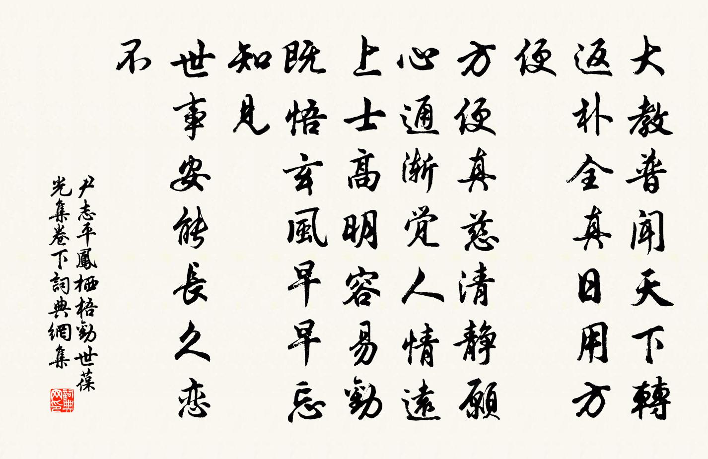 詩詞名句歷史字典書法欣賞書法字典國語詞典說文解字康熙字典古漢語字典標 題 作 者 詩 句 鳳棲梧 勸世 葆光集卷下作者:尹志平 朝代:元代鳳棲梧 勸世 葆光集卷下原文大教普聞天下轉。返樸全真,日用方便。方便真慈清靜願。心通漸覺人情遠。上士高明容易勸。既悟玄風,早早忘知見。世事安能長久戀。不詩詞問答問:鳳棲梧 勸世 葆光集卷下的作者是誰?答:尹志平問:鳳棲梧 勸世 葆光集卷下寫於哪個朝代?答:元代問:鳳棲梧 勸世 葆光集卷下是什麼體裁?答:詞尹志平鳳棲梧 勸世 葆光集卷下書法欣賞鳳棲梧 勸世 葆光集卷下書法作品詩詞推薦遊仙詞三十三首王鎡〔宋代〕扁上金書洞府名,沉沉珠樹彩雲輕。碧桃風卷簫聲去,弄玉乘鸞看月明。予嘗治郡屢平賊嘆今所見不然方回〔宋代〕昔在專城日,吾嘗破賊時。土豪勤問探,民戶感恩私。公論必旁采,下情須盡知。騎軍遠迎擊,孰識一先棋。力穡吟邵雍〔宋代〕春時耕種,夏時耘耨。秋時收治,冬時用受。雨露不愆,既軒既秀。水旱為災,尚罹其咎。題節婦憑氏傅後用南翁韻徐瑞〔宋代〕夫征婦孕判居行,夫沒兒存婦節清。不背所天終此義,信知有欲甚於生。芳名真足留千載,百偽無如仗一誠。定益黃蜀葵崔涯〔唐代〕野欄秋景晚,疏散兩三枝。嫩碧淺輕態,幽香閒澹姿。露傾金盞小,風引道冠欹。獨立悄無語,清愁人詎知。哭待制許先生員興宗〔宋代〕平生一靈台,機智得深屏。出使星移天,歸朝月生嶺。上書肺肝露,不事頰舌逞。事狀嚴歷歷,九原忽甦醒。戌兵有新婚之明日遂行者予聞而悲之為作絕句陸游〔宋代〕夜靜孤村聞笛聲,溪頭月落欲三更。不須吹徹陽關曲,中有徵人萬里情。招徐居厚陳傅良〔宋代〕老來卻憶少相過,別自何年白髮多。山葉抱蟬蟲吊夜,去看滄海壯秋波。送客至城西,望圖山,因寄浙西府中徐鉉〔唐代〕牧叟鄒生笑語同,莫嗟江上聽秋風。君看逐客思鄉處,猶在圖山更向東。品令 試茶洪希文〔元代〕旋碾龍團試。要著盞無留膩。*雲獻瑞,乳花鬥巧,松風飄沸。為致中情,多謝故人千里。泉香品異。迥休把尋常春日書事呈歷陽縣蘇仁仲八首王之道〔宋代〕情似長江流不斷,事如芳草剗還生。此身何苦浮名絆,正擬花時取次行。縣圃十絕和朱待制薛抗〔宋代〕壽親發斑斑,采服老萊戲。欲賦招隱詩,小山念松桂。日高臥白居易〔唐代〕怕寒枕放懶日高枕臥,臨老枕誰言牽率身?夾幕繞房深似洞,重裀襯枕暖於春。小青水動枕根起,嫩綠醅浮竹葉新孤山梅後顧逢〔宋代〕晴雪白漫漫,山中幾樹殘。但知開處好,誰向落時看。影不隨流水,香猶在曲闌。飛來如靖鶴,相對立前灘。和謝公定河朔漫成八首黃庭堅〔宋代〕急雨長風溢兩河,欣然河伯順風歌。行觀東海方存少,不以黃流更自多。和昌言官舍十題石蘭司馬光〔宋代〕楚人歌紫蘭,華禁無傳久。循名意茲是,誰得明真否。天憐菊性孤,秀髮秋風后。固令芳物生,聊作黃花友。答李令晁補之〔宋代〕知音慚李令,問我復何為。道義惟添睡,功名只有詩。淮南使回留別竇侍御王建〔唐代〕戀戀春恨結,綿綿淮草深。病身愁至夜,遠道畏逢陰。忽逐酒杯會,暫同風景心。從今一分散,還是曉枝禽。懷東嘉先生因誦老坡今誰主文字公合把旌旄作喻良能〔宋代〕退之在元和,昌言主文字。揚鑣踵芳塵,公乎得無意。將軍行司馬光〔宋代〕示光滿面唇激朱,虬須虎顙三十餘。腰垂金印結紫綬,諸將不敢過庭除。羽林精卒二十萬,注聽鐘鼓觀麾旟。肥牛名句推薦香到酴醾送晚涼,荇風輕約薄羅裳。曲闌憑遍思偏長。葉小鸞《浣溪沙·初夏》 柳如眉,雲似發,鮫綃霧縠籠香雪。魏承班《漁歌子·柳如眉》 險韻詩成,扶頭酒醒,別是閒滋味。李清照《念奴嬌·春情》 昔歲逢太平,山林二十年。元結《賊退示官吏》 天下者非一人之天下,唯有道者處之。姜子牙《六韜·武韜·順啟》 記年時、舊宿淒涼,暮煙秋雨野橋寒。吳文英《霜花腴·重陽前一日泛石湖》 假作真時真亦假,無為有處有還無。曹雪芹《紅樓夢·第一回》 臘盡愁難盡,春歸人未歸。馮夢龍《喻世明言·卷一》 淡黃楊柳暗棲鴉。玉人和月摘梅花。賀鑄《減字浣溪沙·樓角初銷一縷霞》 水溢芙蓉沼,花飛桃李蹊。薛道衡《昔昔鹽》