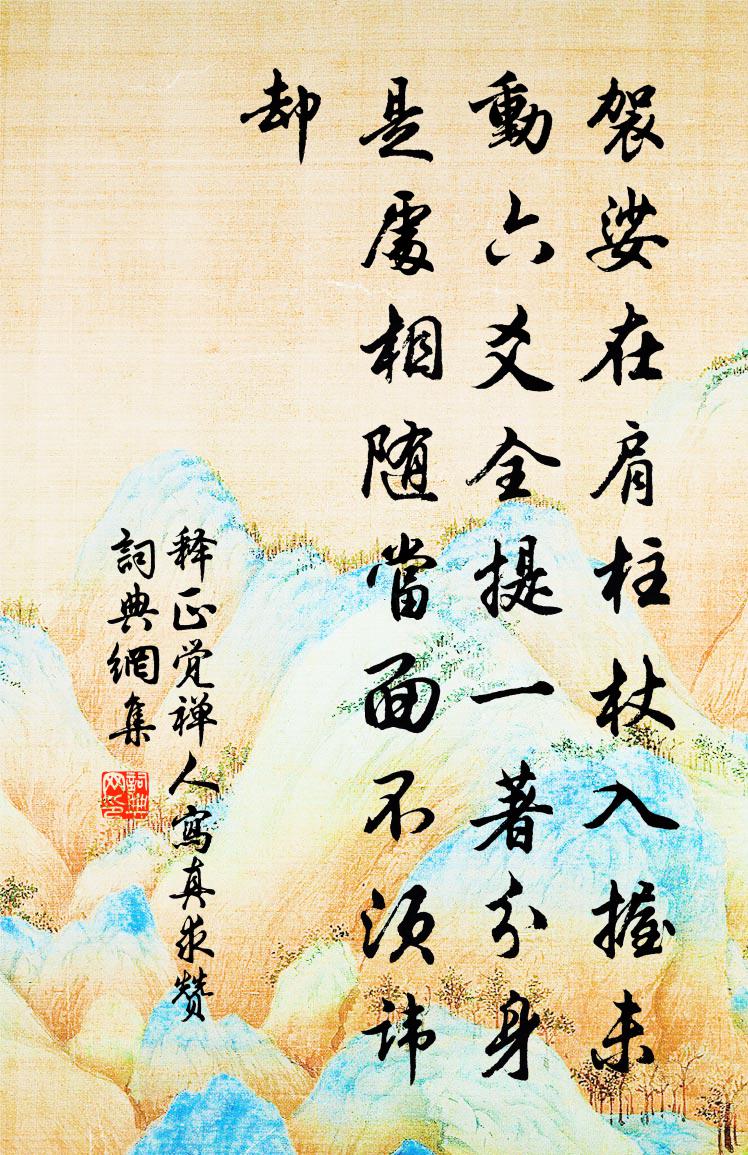 詩詞名句歷史字典書法欣賞書法字典國語詞典說文解字康熙字典古漢語字典標 題 作 者 詩 句 禪人寫真求贊作者:釋正覺 朝代:宋代禪人寫真求贊原文袈娑在肩,柱杖入握。未動六爻,全提一著。分身是處相隨,當面不須諱卻。詩詞問答問:禪人寫真求贊的作者是誰?答:釋正覺問:禪人寫真求贊寫於哪個朝代?答:宋代釋正覺禪人寫真求贊書法欣賞禪人寫真求贊書法作品詩詞推薦次韻安州冕行寄傳師秦觀〔宋代〕投暮安州北,蒼煙亂眼昏。茅茨人外路,砧杵月邊村。野水飛雲薄,空林噪雀繁。幾人堪此樂,逢客莫輕論。阻風寄刁安國梅堯臣〔宋代〕江風裂瓦鳴,浦口驚波作。君駕何不來,客心空寂寞。呈孫元素呂祖異〔宋代〕匹馬先來破曉雲,千章喬本翠繽紛。山圍道院窗窗見,泉出丹池處處分。酒好便能澆磈磊,飯香何必御羶葷。明朝國語引諺先秦無名〔先秦〕獸惡其綱。民惡其上。眾心成城。眾口鑠金。從善如登。從惡如崩。黍稷無成。不能為榮。黍不為黍。稷不為稷。頌古四十四首釋法泰〔宋代〕堂堂妙相絕錙銖,善惡都忘見也無。萬里雲收天界淨,海心無浪月輪孤。愁坐章甫〔宋代〕俗物滿前無好懷,可堪時序苦相催。飛蚊掃跡夜方靜,過雁傳聲寒已來。多病不勝杯瀲灩,遠遊只恐馬虺隤。書窗清平樂(己卯長至作)毛滂〔宋代〕流光電急。又過書雲日。舊是天津花下客。老對山青水碧。而今轉惜年華。遲陽為緩西斜。試問東君音信,曉寒猶送錢守歸朝除大農二首唐仲友〔宋代〕賤跡歸田裡,高懷不世情。細傾憂國酒,頻話及時耕。紫橐恩將近,茅茨計未成。攀轅無好語,所願達時英。答胡伯圓贈詩楊萬里〔宋代〕澹老郎君阿永賢,渥窪財駕折金鞭。只今兩子似連璧,一建雙旌開二天。白馬將軍震交址,青錢學士即甘泉。弟兄頌馬祖因僧問離四句絕百非釋文禮〔宋代〕喚起 * 處全曙,催歸日未西。無心花里鳥,更與盡情啼。題澄聖塔院上方方乾〔唐代〕地靈直是饒風雨,杉檜老於雲雨間。只訝窗中常見海,方知砌下更多山。遠泉勢曲猶須引,野果枝低可要攀。若把蘇幕遮 白告友人王哲〔元代〕正青春,紅貌聚。若肯回頭,這下分明覷。願得回頭心早悟。與道為鄰、也處逍遙所。善緣來,惡緣去。搜見真容臨平泊舟黃庚〔元代〕客舟系纜柳陰旁,湖影侵篷夜氣涼。 萬頃波光搖月碎,一天風露藕花香。觀三王吟邵雍〔宋代〕一片中原萬里餘,殆非孱德所宜居。夏商正朔猶能布,湯武干戈未便驅。澤火有名方受革,水天無應不成需。詳知蠹書魚邵雍〔宋代〕形狀類於魚,其心好蠹書。居常游篋笥,未始在江湖。為害千般有,言烹一物無。年年當盛夏,{左日右煞}了卻懷遠堂葉適〔宋代〕祖後昔尊御,忠邪初混茫。詖行揚於庭,直詞招自旁。盡鋤新法穢,遠拯疲民康。白頭失路者,冠服煇以煌。尤工玩花詞施肩吾〔唐代〕今朝造化使春風,開折西施面上紅。竟日眼前猶不足,數株舁入寸心中。酬厲侍御秋中思歸樹石所居見寄無可〔唐代〕三峰居接近,數里躡雲行。深去通仙境,思歸厭宦名。月從高掌出,泉向亂松鳴。坐石眠霞侶,秋來短褐成。滿江紅(登樓偶作)佚名〔宋代〕樓倚虛空,覺人世、不知何處。人縹緲、半檐星斗,一窗風露。潮退沙平鳧雁靜,夜深月黑魚龍怒。把清樽、獨自宴犒蕃軍有感高駢〔唐代〕蜀地恩留馬嵬哭,煙雨濛濛春草綠。滿眼由來是舊人,那堪更奏梁州曲。名句推薦黃金燃桂盡,壯志逐年衰。孟浩然《秦中感秋寄遠上人 / 秦中寄遠上人》 峨眉山月半輪秋,影入平羌江水流。李白《峨眉山月歌》 荊溪白石出,天寒紅葉稀。王維《山中》 寺憶曾游處,橋憐再渡時。杜甫《後游》 此情無計可消除,才下眉頭,卻上心頭。李清照《一剪梅·紅藕香殘玉簟秋》 還似舊時游上苑,車如流水馬如龍。李煜《憶江南·多少恨》 雖有其位,苟無其德,不敢作禮樂焉。雖有其德,苟無其位,亦不敢作禮樂焉。子思《中庸·第二十八章》 又爭知、一字相思,不到吟邊。王沂孫《高陽台·殘萼梅酸》 攜手藕花湖上路。一霎黃梅細雨。朱淑真《清平樂·夏日游湖》 四十三年,望中猶記,烽火揚州路。辛棄疾《永遇樂·京口北固亭懷古》