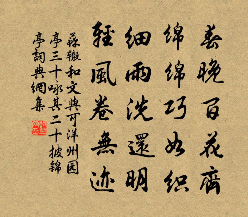 詩詞名句歷史字典書法欣賞書法字典國語詞典說文解字康熙字典古漢語字典標 題 作 者 詩 句 和文與可洋州園亭三十詠其二十披錦亭作者:蘇轍 朝代:宋代原文春晚百花齊,綿綿巧如織。細雨洗還明,輕風卷無跡。詩詞問答問:《和文與可洋州園亭三十詠其二十披錦亭》的作者是誰?答:蘇轍問:該詩寫於哪個朝代?答:宋代問:蘇轍的名句有哪些?答:蘇轍名句大全書法欣賞和文與可洋州園亭三十詠其二十披錦亭書法作品詩詞推薦頌古一百則釋正覺〔宋代〕不入世,未循緣,劫壺空處有家傳。白苹風細秋江暮,古岸船歸一帶煙。傷妓人董氏四首張說〔唐代〕董氏嬌嬈性,多為窈窕名。人隨秋月落,韻入搗衣聲。粉蕊粘妝簏,金花竭翠條。夜台無戲伴,魂影向誰嬌。舊亭清平樂(雨中春懷呈準軒)黎廷瑞〔宋代〕清明寒食。過了空相憶。千里音書無處覓。渺渺亂蕪搖碧。蒼天雨細風斜。小樓燕子誰家。只道春寒都盡,一分猶次雲見過留宿有詩因賡其韻二首黃公度〔宋代〕惜別情無賴,狂吟意有餘。琴尊閒院落,花柳暗村墟。行樂真聊爾,論交莫後予。裹糧山下約,來往未應疏。偈頌二百零五首釋正覺〔宋代〕直到劫空明自己,不無不墮超生死。夜船載月釣滄浪,清白傳家只如此。二風詩治風詩五篇至慈元結〔唐代〕至化之深兮,猗猗娭娭。如煦如吹,如負如持,而不知其慈。故莫周莫止,靜和而止。至化之極兮,瀛瀛溶溶。如點絳唇·高柳蟬嘶汪藻〔宋代〕高柳蟬嘶,采菱歌斷秋風起。晚雲如髻。湖上山橫翠。簾卷西樓,過雨涼生袂。天如水。畫樓十二。有個人同倚。中秋前一日諸生攜酒見過對月同賦呂江〔宋代〕半生道路鬢雙皤,又是中秋客里過。別業可憐荒杜曲,羈懷最怕聽商歌。不知明月幾時有,如此清風良夜何。勝概冬夕寄青龍寺源公郎士元〔唐代〕斂屨入寒竹,安禪過漏聲。高松殘子落,深井凍痕生。罷磬風枝動,懸燈雪屋明。何當招我宿,乘月上方行。送胡仲方二首項安世〔宋代〕交情久處臨分苦,別意深時著語難。志士自期須皓首,故人相勸只加餐。乾坤老大千年在,雲海扶搖一息看。防有頌古四十四首釋法泰〔宋代〕垂鉤四海釣獰龍,格外玄談知己從。相見披衫帶席帽,不妨把手上高峰。句釋遵式〔宋代〕真空是選場,大覺為官位。奉和魯望漁具十五詠釣車皮日休〔唐代〕得樂湖海志,不厭華輈小。月中拋一聲,驚起灘上鳥。心將潭底測,手把波文裊。何處覓奔車,平波今渺渺。春雪牟巘〔宋代〕一冬只辨作嚴寒,剪水飛花事竟難。閉戶不知春意動,撲窗忽覺雨聲乾。頗聞萬事正雲集,何處一蓑如畫看。但喜季夏雜興陸游〔宋代〕疏泉澆藥壟,枕石聽松風。此樂慚專享,無因與客同。聽唱秦少游溪路雨添花詞感舊作晁說之〔宋代〕秦郎不知我,我豈知秦郎。相逢每戲劇,此狷而彼狂。坐有今輔弼,正色屢低昂。逮今白髮垂,悔昔少年場。一聞乞米高登〔宋代〕臣飢欲死侏儒飽,方朔誰憐是歲星。館下諸生笑豐暖,江頭漁父誚清醒。魯公已作乞米帖,陶令旋尋儲粟瓶。親舊南至日隔仗望含元殿香爐(一作裴次元詩)郭遵〔唐代〕冕旒親負扆,卉服盡朝天。暘谷移初日,金爐出御煙。芬馨流遠近,散漫入貂蟬。霜仗凝逾白,朱欄映轉鮮。如看晚思楊冠卿〔宋代〕花意就銷歇,芳樹初陰陰。薄帷受清吹,鳥聲幽院深。感此時節改,素標不勝簪。取酒洗玉船,慰我懷古心。小醉毛詩緣衣陳普〔宋代〕正色吁為間色侵,淒風絺綌自悲吟。酌中循理聊區處,底事先賢共此心。人倫萬變若輪雲,一片天心久負人。但把名句推薦一場幽夢同誰近,千古情人獨我痴。曹雪芹《紅樓夢·第五回》 人主之患,在於信人,信人,則制於人。韓非及後人《韓非子·備內》 五月五日午,贈我一枝艾。文天祥《端午即事》 聖人之行不同也,或遠或近,或去或不去,歸潔其身而已矣。孟子《孟子·萬章章句上·第七節》 執古之道,以御今之有。老子《老子·道經·第十四章》 早須清黠虜,無事莫經秋岑參《送人赴安西》 深村時節好,應為去年豐。范成大《寒食郊行書事》 桃李春風一杯酒,江湖夜雨十年燈。黃庭堅《寄黃幾復》 遲日江山麗,春風花草香。杜甫《絕句二首》 唯明主為能愛其所愛,闇主則必危其所愛。荀子《荀子·君道》