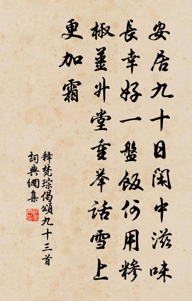 詩詞名句歷史字典書法欣賞書法字典國語詞典說文解字康熙字典古漢語字典標 題 作 者 詩 句 偈頌九十三首作者:釋梵琮 朝代:宋代偈頌九十三首原文安居九十日,閒中滋味長。幸好一盤飯,何用糝椒姜。升堂重舉話,雪上更加霜。詩詞問答問:偈頌九十三首的作者是誰?答:釋梵琮問:偈頌九十三首寫於哪個朝代?答:宋代釋梵琮偈頌九十三首書法欣賞偈頌九十三首書法作品詩詞推薦薦玄德公廟儲光羲〔唐代〕神道本無已,成化亦自然。君居寥天上,德在玉華泉。真游踐王豫,永日遲雲仙。表微在營道,明祀將祈年。靈山老人岩李惟德〔宋代〕絕巘稜層面勢尊,老人岩洞更連軒。何時鑿出 * ,盡日高開碧玉門。靜照井閭森寶秘,靈摩星鬥弄清溫。直須門有車馬客行陸機〔魏晉〕門有車馬客。駕言發故鄉。念君久不歸。濡跡涉江湘。投袂赴門塗。攬衣不及裳。拊膺攜客泣。掩淚敘溫涼。借問座上復借韻送岢嵐軍通判葉朝奉蘇軾〔宋代〕雲間踏白看纏旗,莫忘西湖把酒時。夢裡吳山連越嶠,樽前羌婦雜胡兒。夕烽過後人初醉,春雁來時雪未滋。為問晚秋有懷鄭中舊隱白居易〔唐代〕天高風裊裊,鄉思繞關河。寥落歸山夢,殷勤采蕨歌。病添心寂寞,愁人鬢蹉跎。晚樹蟬鳴少,秋階日上多。長閒楊柳枝侯善淵〔元代〕鶴性**望遠攀。過潼關。秋深雨霽乍衣單。水雲寒。爭忍昔年名利染,早回還。夕陽村落杏*間。望家山。清湖小酌得生字方回〔宋代〕泯默抑幽抱,低回挫高情。肥遁夙果決,羈旅猶牽縈。華摭有舊習,冷嗜無新營。醲鮮世所競,褒博日以輕。小人致政龍圖給事徐公輓詞二首韓元吉〔宋代〕磊落南州士,家聲二百年。失身幾利吻,得路已華顛。青瑣元虛位,黃扉久佇賢。九原寧可作,東望益潸然。抵袁陽施德〔宋代〕聲聲啼鳴叫鉤輈,山自巑岏水自流。西望長沙三百里,行人道是古袁州。曲磵縈紆樹密蒙,放船正值楝花風。王程驀山溪(與何遂夫為壽)盧炳〔宋代〕韶華七換,阻慶生申旦。今日向高堂,載卮酒、為君滿勸。繡簾低掛,瑞靄□香濃,倩雙娥,敲象板,緩緩歌珠貫夜來枕上得四絕句因視王性之謝其相訪也未專晁說之〔宋代〕三川皆震大災異,汴水絕流上帝仁。不使六龍遠巡幸,興王舊地福重新。續八詠薰風夏更宜唐仲友〔宋代〕夏更宜,更宜倚欄客。扇化養之清微,布豐美之澗澤。空翠幄之桑柘,漲黃雲之麰麥。掃園囿之落紅,溢畝澮之疎和顏長官百詠農桑朱繼芳〔宋代〕編茅為屋荻為簾,老小團欒苦樂兼。樂歲輸丁猶未了,飢年家口更堪添。題上封寺胡宏〔宋代〕百年身似客,浩蕩世間游。入望青山發,夢魂偏我留。我家巫山十二峰,浮江直過巴陵東。瀟湘水與蒼梧通,環繞四字令/醉太平李彭老〔宋代〕蘭湯晚涼。鸞釵半妝。紅巾膩雪初香。擘蓮房賭雙。羅紈素璫。冰壺露床。月移花影西廂。數流螢過牆。再次韻陳造〔宋代〕橫前整整萬全兵,自笑空弮借背城。更遣齊竽混東郭,坐令鵠卵化南榮。南陳得法仍宗派,甫白論情自弟兄。顧我句李遠〔唐代〕人事三杯酒,流年一局棋。青山不厭三杯酒,長日惟消一局棋。別後寄主簿虞儔〔宋代〕塵埃襞積顏如甲,丹墨紛綸眼有花。君去何人堪共語,秋來無夢不還家。飄零酒盞今真止,冷淡詩筒不復夸。莫使送李承知京兆司錄祖無擇〔宋代〕才從知已薦,又應辟書行。廷尉官聯重,軍謀職任清。會嚴東野秀,紫閣晚峰橫。儘是供吟處,歸應新築成。北山之英崔敦禮〔宋代〕強敵驕兮晉多壘,忽登山兮望廷尉。風霾兮殺氣昏,突槍櫑兮亂鉤陳。予君麾兮從君鉞,戰陵西兮捍溪柵。虹食壘名句推薦欲速則不達。孔子弟子《論語·子路篇》 離人心上秋。吳文英《唐多令·惜別》 漢帝重阿嬌,貯之黃金屋。李白《妾薄命》 欲覺聞晨鐘,令人發深省杜甫《游龍門奉先寺》 君子居易以俟命,小人行險以徼幸。子思《中庸·第十四章》 沉恨細思,不如桃杏,猶解嫁東風。張先《一叢花令·傷高懷遠幾時窮》 聖人見微以知萌,見端以知末,故見象箸而怖,知天下之不足也。韓非及後人《韓非子·說林上》 孤兔淒涼照水,曉風起、銀河西轉。吳文英《玉漏遲·瓜涇度中秋夕賦》 寒泉貯、紺壺漸暖,年事對、青燈驚換了。吳文英《花犯·謝黃復庵除夜寄古梅枝》 風日薄、度牆啼鳥聲亂。盧祖皋《宴清都·初春》