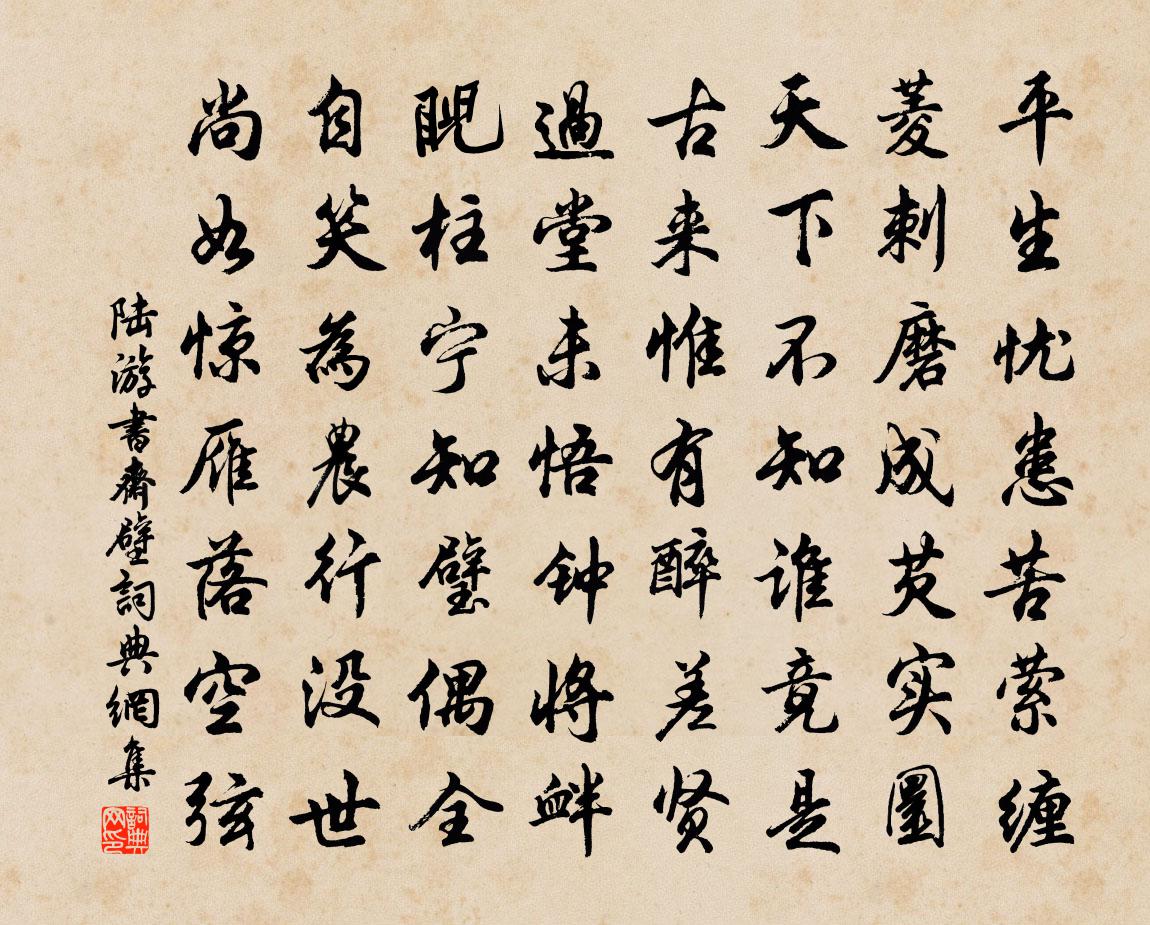 詩詞名句歷史字典書法欣賞書法字典國語詞典說文解字康熙字典古漢語字典標 題 作 者 詩 句 書齋壁作者:陸游 朝代:宋代書齋壁原文平生憂患苦縈纏,菱刺磨成芡實圜。天下不知誰竟是,古來惟有醉差賢。過堂未悟鍾將釁,睨柱寧知璧偶全?自笑為農行沒世,尚如驚雁落空弦。詩詞問答問:書齋壁的作者是誰?答:陸游問:書齋壁寫於哪個朝代?答:宋代問:陸游的名句有哪些?答:陸游名句大全陸游書齋壁書法欣賞書齋壁書法作品詩詞推薦瓠葉佚名〔先秦〕幡幡瓠葉,采之亨之。君子有酒,酌言嘗之。有兔斯首,炮之燔之。君子有酒,酌言獻之。有兔斯首,燔之炙之。訪劉漢英趙興緡〔宋代〕無情歲月迅飛梭,卻笑浮生慮更多。最羨君能尋舊業,半溪春雨一漁蓑。詩壁楊公遠〔宋代〕一方素壁龍蛇走,幾首新詩冰雪清。語好驚人看不足,教儂技癢動吟情。踏莎行何夢桂〔宋代〕夜月樓台,夕陽庭院。都將前事思量遍。當初識面待尋常,爭知識後情如線。只怕梅梢,參橫斗轉。催人歸去天涯古隍行朱南強〔宋代〕茂林修竹恆蒼蒼,畦蘭畹芷勝幽芳。在蔥佳氣藹禎祥,小小一村名古隍。屋西有山名虎耳,東流挹抱長溪水。三峰挽妹婿汪汻四首許月卿〔宋代〕奉禮徒員外,京師枉治中。二郎槐不做,四老橘成空。三鳳壁岩子,雙龍寶劍雄。萬人真莫贖,愁絕老坡翁。次韻制帥和王憲二首王之望〔宋代〕二麥初收堰水流,西園飛蓋使君游。羽旄每出邦人喜,壺矢閒同坐客投。膏雨應時和氣洽,豐年有兆頌聲酬。政成寒夜有懷晁無斁陳師道〔宋代〕同好共城郭,十日不一顧。人事雖好乖,吾生亦多忤。闔門對妻子,歲月不可度。閉目寧用遮,停杯仍下箸。獨無南康愛蓮即事陳宓〔宋代〕東君仙芳菲,首夏即酣寢。巧思蹶然興,老手更諳稔。殷紅間濃綠,濯此萬機錦。桃李謾成蹊,豈解香席枕。最是讀史七首於石〔宋代〕世以燔經咎李斯,斯文興喪豈關渠。楚人未烈鹹陽火,秦府猶存博士書。吾道不隨灰燼冷,殘煙空鎖帝王居。獨嗟頌十玄談一色釋印肅〔宋代〕行人到此盡蹉跎,一指頭端不奈何。毫髮有差千萬里,溈山撫掌笑呵呵。暮春寄元九白居易〔唐代〕梨花結成實,燕卵化為雛。時物又若此,道情復何如。但覺日月促,不嗟年歲徂。浮生都是夢,老小亦何殊。唯與六月初四日往雲際院,田間雨足,喜而賦之楊萬里〔宋代〕高下田疇水斗鳴,泥深路滑不堪行。請君聽取行人語,只個愁聲是喜聲。去年今日政迎神,禱雨朝朝禱得晴。今歲道中即事姚勉〔宋代〕我亦欲懷三赤珠,陸郎有母繄獨無。治生復人諫止,亦豈能有千頭奴。竹石園堂酒邊即事顧逢〔宋代〕到此須終日,相忘醉不成。一天惟有月,萬籟絕無聲。魚口萍吞吐,螢光草晦明。夜闌重秉燭,猶對石棋枰。贈台倅徐太博釋長吉〔宋代〕瓊樹從芳蕤,靈根植仙圃。懿哲蘊英才,妙幾沖雲路。曲台峻清秩,峨冠凜奇趣。霞城倅郡條,惠愛春榮布。心陂靈照女贊釋了惠〔宋代〕無底籃兒,無柄笊籬。閒家潑具,賣與阿誰。自對丹霞呈醜拙,至今羞澀畫蛾眉。懷雪蓬姚希聲使君戴復古〔宋代〕有感中來不自禁,短長亭下短長吟。梅花差可強人意,竹葉安能醉我心。世事無憑多改變,仕途相識半升沉。摩挲送朱先輩尉廬陵徐鉉〔唐代〕我重朱夫子,依然見古人。成名無愧色,得祿及慈親。莫嘆官資屈,寧論活計貧。平生心氣在,終任靜邊塵。岳陽樓·春色醉巴陵楊基〔明代〕春色醉巴陵,闌乾落洞庭。水吞三楚白,山接九疑青。空闊魚龍氣,嬋娟帝子靈。何人夜吹笛,風急雨冥冥。 名句推薦白髮悲花落,青雲羨鳥飛。岑參《寄左省杜拾遺》 有其言,無其行,君子恥之戴聖《禮記·雜記下》 山圍故國周遭在,潮打空城寂寞回。劉禹錫《金陵五題·石頭城》 閒坐悲君亦自悲,百年多是幾多時。元稹《遣悲懷三首·其三》 怕相思,已相思,輪到相思沒處辭,眉間露一絲。俞彥《長相思·折花枝》 千里之馬時一有,其利緩;駑馬日售,其利急。韓非及後人《韓非子·說林下》 意輕千金贈,顧向平原笑。李白《古風·齊有倜儻生》 西風稍急喧窗竹,停又續,膩臉懸雙玉。閻選《河傳·秋雨》 羈心積秋晨,晨積展游眺。謝靈運《七里瀨》 時來天地皆同力,運去英雄不自由。羅隱《籌筆驛》