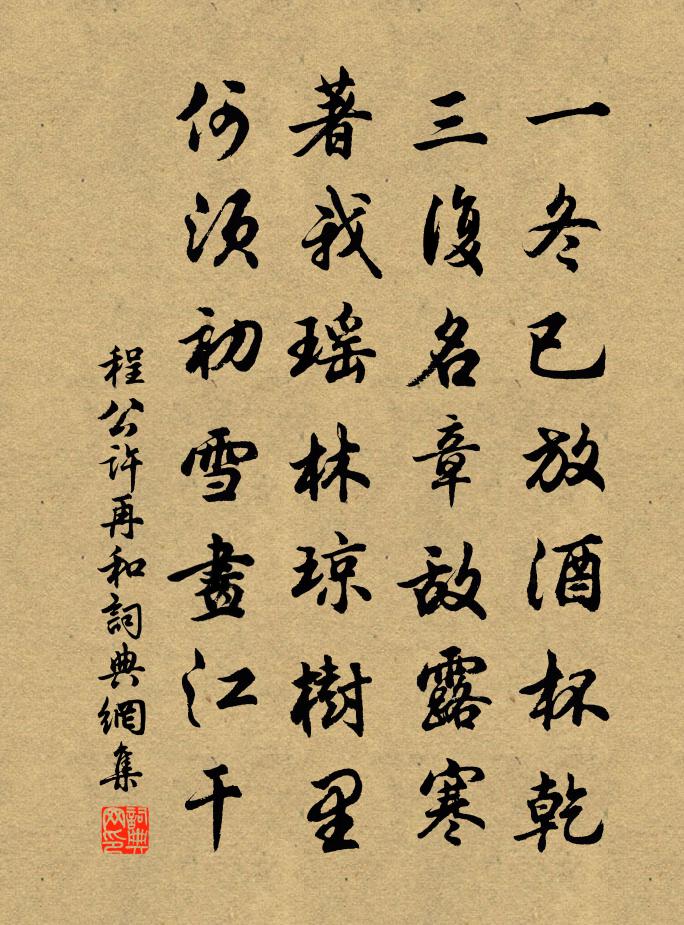 詩詞名句歷史字典書法欣賞書法字典國語詞典說文解字康熙字典古漢語字典標 題 作 者 詩 句 再和作者:程公許 朝代:宋代再和原文一冬已放酒杯乾,三復名章敵露寒。著我瑤林瓊樹里,何須初雪畫江乾。詩詞問答問:再和的作者是誰?答:程公許問:再和寫於哪個朝代?答:宋代程公許再和書法欣賞再和書法作品詩詞推薦數日不作詩陸游〔宋代〕吾詩郁不發,孤寂奈愁何!偶爾得一語,快如疏九河。黃流舞活盪,白雨助滂沱。門外無來客,花前自浩歌。次韻樂天村居臥病滕岑〔宋代〕瓦盞茅柴濁,磚爐榾柮紅。味如飲醽醁,暖勝燎蒿蓬。萬種皆幻事,一真惟太空。舊氈敷故絮,小合臣衰翁。洞仙歌佚名〔宋代〕六尺湘漪簟冷。用坡仙梅花十韻愬梅劉黻〔宋代〕清入肝脾冷入肌,天機忽露兩三枝。為渠瘦得身如鶴,詩病除非詩可醫。撫州上元陸游〔宋代〕江月微雲外,街泥小雨余。人如虛市散,燈似曉星疏。羈雁同身世,新霜上鬢須。明年更清絕,魚火對茅廬。醉落魄(夜靜聞琴)侯置〔宋代〕銅壺漏歇。紗窗倒掛梅梢月。玉人酒暈消香雪。促軫調弦,彈個古離別。雛鶯小鳳交飛說。嘈嘈軟語丁寧切。相如夜坐蔡權〔宋代〕露冷風高天氣清,中秋月色更發明。捫懷永夜心同照,抱膝孤燈興自傾。漏盡欣無塵客坐,鐘鳴恍有老仙迎。歸來初寒宴坐陸游〔宋代〕微火如螢度篆盤,明窗坐敗幾 * 。群兒誰信老懷嬾,萬事不禁醒眼看。道在簞瓢端自足,心閒天地本來寬。此生浙幕李端公泛建溪黃滔〔唐代〕越城吳國結良姻,交發芙蓉幕內賓。自顧幽沈槐省跡,得陪清顯諫垣臣。分題曉並蘭舟遠,對坐宵聽月狖頻。更愛掃地舞佚名〔宋代〕酥點萼。玉碾萼。點時碾時香雪薄。才折得。春方弱。半掩朱扉,垂繡幕。怕吹落。拈一餉。嗅一餉。拈時嗅時宿滿江紅許有壬〔元代〕徒倚危闌,愛四面、嵐光翠濕。回首見、疏雲黃葉,遠林平磧。老眼都迷秋遠近,壯遊已遍天南北。有一官、更比送姚侍御出使江東宋之問〔唐代〕帝憂河朔郡,南發海陵倉。坐嘆青春別,逶迤碧水長。飲冰朝受命,衣錦晝還鄉。為問東山桂,無人何自芳。照影曲溫庭筠〔唐代〕景陽妝罷瓊窗暖,欲照澄明香步懶。橋上衣多抱彩雲,金鱗不動春塘滿。黃印額山輕為塵,翠鱗紅稚俱含嚬。桃花重遊天台華頂峰釋文珦〔宋代〕天台三萬丈,華頂入穹蒼。片石群魔懾,千年古寺荒。樹枯頳菌出,僧老白眉長。極目滄溟際,煙波更渺茫。偈頌二十一首釋智愚〔宋代〕百丈清規,千古洪範。藏這則虛空絕跡。用之則綱令森嚴。朝中措(和孔倅·郡齋新栽竹)王之道〔宋代〕君心節直更心虛。移植並庭除。好在紅蕖相映,捲簾如見吳姝。清風明月,君無我棄,我不君疏。況有騷人墨客,送武進韋明府錢起〔唐代〕理邑想無事,鳴琴不下堂。井田通楚越,津市半漁商。盧橘垂殘雨,紅蓮拆早霜。送君催白首,臨水獨思鄉。元祐祀九宮貴神二首佚名〔宋代〕上天貴神,九宮設位,功徳及物。乃秩明祀。望拜紫壇,赫然靈氣。奠玉牙幣,歆之無愧。二月五日晚閒步於庭日且下有青雲如遠山狀望張嵲〔宋代〕亂後有誰三徑足,日長如我幾人閒。夕陽盡處春容好,更賴青雲作遠山。綠珠怨劉商〔唐代〕從來上台榭,不敢倚闌乾。零落知成血,高樓直下看。名句推薦獨在異鄉為異客,每逢佳節倍思親。王維《九月九日憶山東兄弟 / 九月九憶山東兄弟》 布衣之怒,亦免冠徒跣,以頭搶地爾。劉向《戰國策·魏四·秦王使人謂安陵君》 花褪殘紅青杏小。燕子飛時,綠水人家繞。蘇軾《蝶戀花·春景》 何須急管吹雲暝,高寒灩灩開金餅。高觀國《菩薩蠻·何須急管吹雲暝》 天山三丈雪,豈是遠行時。李白《獨不見》 終古閒情歸落照,一春幽夢逐遊絲。納蘭性德《浣溪沙·楊柳千條送馬蹄》 傷心橋下春波綠,曾是驚鴻照影來。陸游《沈園二首》 朝看水東流,暮看日西墜。錢福《明日歌》 洞庭葉未下,瀟湘秋欲生徐禎卿《在武昌作》 一葉葉,一聲聲,空階滴到明。溫庭筠《更漏子·玉爐香》