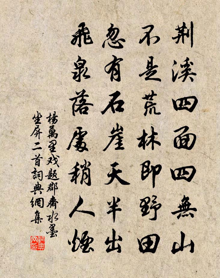 詩詞名句歷史字典書法欣賞書法字典國語詞典說文解字康熙字典古漢語字典標 題 作 者 詩 句 戲題郡齋水墨坐屏二首作者:楊萬里 朝代:宋代戲題郡齋水墨坐屏二首原文荊溪四面四無山,不是荒林即野田。忽有石崖天半出,飛泉落處稍人煙。詩詞問答問:戲題郡齋水墨坐屏二首的作者是誰?答:楊萬里問:戲題郡齋水墨坐屏二首寫於哪個朝代?答:宋代問:楊萬里的名句有哪些?答:楊萬里名句大全楊萬里戲題郡齋水墨坐屏二首書法欣賞戲題郡齋水墨坐屏二首書法作品詩詞推薦偶作楊簡〔宋代〕曩疑先聖嗇於言,可不明明細細傳。今醒從前都錯認,更加詳後即紛然。竇園醉中前後五絕句陳與義〔宋代〕不見海棠相似人,空題詩句滿花身。酒闌卻度荒陂去,驅使風光又一春。呈郫人李簽判周麟之〔宋代〕錦江煙水春茫茫,錦城游宴歌舞狂。酒酣緩轡踏花去,尚說當年先侍郎。後來遊宦家因徙,子孫不復歸桑梓。世居戲題稚春杜少陵詩集林亦之〔宋代〕十年蕭蕭去武林,橐中唯有謫仙吟。君今失意還山窟,少陵詩集如明月。自怪平生每相似,窮愁嗜好亦如許。飯顆至節矣猶未見梅頗形思渴書呈斯遠滕兄主簿前趙蕃〔宋代〕言歸雖故棲,雅志亦良友。奈何數詩筒,不得屢杯酒。縱雲三十里,每見莫能久。是以朝暮間,想思輒成又。去年憶登棲霞寺峰(效梁簡文)李紳〔唐代〕香印煙火息,法堂鐘磬餘。紗燈耿晨焰,釋子安禪居。林葉脫紅影,竹煙含綺疏。星珠錯落耀,月宇參差虛。顧眺秀實監丞時惠佳章逋債稍多今因休暇再報一章王洋〔宋代〕人生萍梗蹤,端若邂逅期。奈可人常言,會合信有時。鄙人初謁郡,故事科童兒。竹馬豈其情,歡笑亦強隨。豈緣清明黃庭堅〔宋代〕佳節清明桃李笑,野田荒冢只生愁。雷驚天地龍蛇蟄,雨足郊原草木柔。人乞祭余驕妾婦,士甘焚死不公候。賢愚酹江月 用子周僉司詠雪韻曹伯啟〔元代〕六花凌亂,算神工、不用并州刀剪。乍密還疏斜復整,眼底萬更千變。宿麥連雲,遺蝗入地,四海愁顏展。呼童洗大觀三年釋奠六首佚名〔宋代〕道德淵源,斯文之崇。功名糠秕,素王之風。碩兮斯牲,芬兮斯酒。綏我無疆,興天為久。喜晴虞儔〔宋代〕雨餘天宇十分清,到處官蛙噤不鳴。殘點喜聞檐溜斷,新涼更覺葛衣輕。飛揚楚觀人無夢,畜縮胥濤怒已平。滿眼過海豐陳藻〔宋代〕梅花結子已紅青,歸路猶愁一月程。忽聽兒音鄉語熟,不知方到海豐城。登城寄王秘書建張籍〔唐代〕聞君鶴嶺住,西望日依依。遠客偏相憶,登城獨不歸。十年為道侶,幾處共柴扉。今日煙霞外,人間得見稀。採菊亭朱豈〔宋代〕霜降草花落,林柯亦紛披。耿耿園中菊,煌煌發幽姿。良夜積華露,花葉繁以滋。風流賢史君,澹然與花期。黎旦次韻和岳醵飲西峰寺分韻成詩十四首見寄陳著〔宋代〕蕭蕭四壁住殘生,不學神仙不學僧。有酒未能忘北海,種瓜且自學東陵。和明上人見贈王銍〔宋代〕六見月華虧又盈,卻來松下笑相迎。事銷臘雪渾非舊,人似寒梅獨有情。香火舊緣生理足,煙霞新志著書成。明朝詠鸚鵡釋定諸〔宋代〕罩向金籠好羽儀,分明喉舌似君稀。不須一向隨人語,須信人心有是非。長相思(高調)周邦彥〔宋代〕夜色澄明。天街如水,風力微冷簾旌。幽期再偶,坐久相看才喜,欲嘆還驚。醉眼重醒。映雕闌修竹,共數流螢。山居雜詩九十首曹勛〔宋代〕素懷繞列岫,乃家台山麓。人境兩俱絕,事物濟所欲。芳醪澈琖白,茗飲瀹溪綠。對客調玉軫,清風入梧竹。早發潼關吳融〔唐代〕天邊月初落,馬上夢猶殘。關樹蒼蒼曉,玉階澹澹寒。宦遊終自苦,身世靜堪觀。爭似山中隱,和雲枕碧湍。名句推薦歷覽千載書,時時見遺烈。陶淵明《癸卯歲十二月中作與從弟敬遠》 村喜禾花實,峰看嶺岫重。趙汝愚《雨後送李將軍還祠偕同寅飲一杯亭》 功名萬里外,心事一杯中。高適《送李侍御赴安西》 登臨送目,正故國晚秋,天氣初肅。王安石《桂枝香·登臨送目》 行雲卻在行舟下,空水澄鮮,俯仰留連,疑是湖中別有天。歐陽修《採桑子·畫船載酒西湖好》 青天蜀道難,紅葉吳江冷。張可久《普天樂·秋懷》 留連戲蝶時時舞,自在嬌鶯恰恰啼。杜甫《江畔獨步尋花·其六》 使殺生之機,奪予之要在大臣,如是者侵。韓非及後人《韓非子·三守》 東風有信無人見,露微意、柳際花邊。蘇軾《一叢花·今年春淺侵年》 凡與敵戰,若敵人初來,陣勢未定,行陣未整,先以兵急擊之,則勝。佚名《百戰奇略·第四卷·先戰》