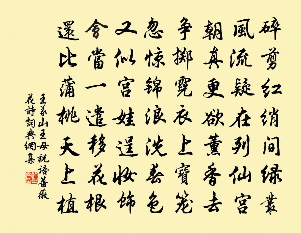 詩詞名句歷史字典書法欣賞書法字典國語詞典說文解字康熙字典古漢語字典標 題 作 者 詩 句 王母祝語薔薇花詩作者:王義山 朝代:宋代王母祝語薔薇花詩原文碎剪紅綃間綠叢,風流疑在列仙宮。朝真更欲薰香去,爭擲霓衣上寶籠。忽驚錦浪洗春色,又似宮娃逞妝飾。會當一遣移花根,還比蒲桃天上植。詩詞問答問:王母祝語薔薇花詩的作者是誰?答:王義山問:王母祝語薔薇花詩寫於哪個朝代?答:宋代王義山王母祝語薔薇花詩書法欣賞王母祝語薔薇花詩書法作品詩詞推薦丁酉道道暮春陳造〔宋代〕去家如昨日,節物轉頭非。風處綠自舞,雨餘紅頓稀。野橋平水過,村路躡花歸。趁得酴醾在,箏琶拂舊衣。雜詩李復〔宋代〕先王急民事,分吏察壠畝。田荒宅 * ,置法責粟布。壤壤一歲勤,暴暴三年聚。農政久不修,幾家有禾黍。解舟銅陵,望淮山白雲二首楊萬里〔宋代〕天惜淮山不惜銀,渾銀砌起一長城。淮山里在銀城裡,半山諸峰越樣青。奉使契丹二十八首其二十二學士院端午帖子二蘇轍〔宋代〕簾密風時度,宮深日倍長。紵羅隨節賜,黍麥趁新嘗。袷享八首真宗〔宋代〕[太簇徽]於昭孝治,通乎神明。寒暑不忒,熙事備成。牲牲孔碩,黍稷惟聲。以享以祀,來燕來寧。別張洗馬樞詩庾信〔南北朝〕別席慘無言。離悲兩相顧。君登蘇武橋。我見楊朱路。關山負雪行。河水乘冰渡。願子著朱鳶。知余在玄菟。十八日同少虞才夫子友子西泛舟李流謙〔宋代〕清江不知日夜長,前日平流吹作浪。得得來尋白鳥盟,仍喚津人操兩槳。殘紅漸稀綠漸多,苦留不住如春何。細看休洗紅李賀〔唐代〕休洗紅,洗多紅色淺。卿卿騁少年,昨日殷橋見。封侯早歸來,莫作弦上箭。淳熙乙未登科是夏再中教官得綠紹興府教授秋項安世〔宋代〕霜風策策鼓黃蘆,滿眼吳江舊去途。夢到月明天闊處,夜深泥宿故城湖。暮春山行陳紀〔宋代〕不具看花眼,蕭然綠暗邨。貧來疑筆硯,老去信乾坤。日澹樹無影,潮回草有痕。詩成鷗沒處,鴉外又黃昏。念奴嬌(席上賦林檎花)曾覿〔宋代〕群花漸老,向曉來微雨,芳心初拆。拂掠嬌紅香旖旎,渾欲不勝春色。淡月梨花,新晴繁杏,裝點成標格。風光都題林彥潛詩編馬廷鸞〔宋代〕快讀詩人七鉅編,前身端合是逋仙。村翁溪老開吟社,愧我猶撐上水船。和壽州宋待制九題其七齊雲亭梅堯臣〔宋代〕城隅結危棟,仿佛凌煙霓。平觀飛雨來,俯窺巢禽棲。浩蕩孤思發,冪歷蔓草齊。長安去不遠,何言西北迷。秋日程顥〔宋代〕閒來無事不從容,睡覺東窗日已紅。萬物靜觀皆自得,四時佳興與人同。道通天地有形外,思入風雲變態中。富貴賈節庵冒夏暑越修塗過我苕霅情誼甚厚令聞古牟巘五〔宋代〕事故不可料,柯爛棋局更。兩家骨肉內,往往隔死生。幽居記今昔事十首以詩書從宿好林園無俗情為陸游〔宋代〕我昔揮短楫,終年釣吳松;遺嘗攜長鑱,採藥玉霄峰。為計晚大繆,朝路偶見容;晨趨大明班,夜聽長樂鍾。白髮吳小村文天祥〔宋代〕萬里飄零命羽輕,歸來喜有故人迎。雷潛九地聲元在,月暗千山魄再明。疑是倉公回已死,恍如羊祜說前生。夜闌定夸浦趙蕃〔宋代〕棹掠湖邊浦,帆收柳外橋。蒲深映鳧沒,浪靜覺魚跳。紗帢因眠側,霜豪倚醉搖。春風空浩蕩,客思只蕭條。賀新郎(壽右史·正月初七)王邁〔宋代〕曾侍螭頭立。吐危言、嬰鱗編虎,扶持鰲極。誰煉精金鑄剛卯,氣節毅然鎮國。肯顧戀、眼前官職。碧水丹山持翠倚樓戴復古〔宋代〕賢愚不同道,用舍要知機。涉世有臧否,倚樓無是非。鴉分枯樹立,雁逐斷雲飛。朝暮尋常事,何須嘆落暉。名句推薦元方難為兄,季方難為弟。劉義慶《世說新語·德行》 清明又近也,卻天涯為客。曹組《憶少年·年時酒伴》 前不見古人,後不見來者。陳子昂《登幽州台歌》 半竿落日,兩行新雁,一葉扁舟。賀鑄《眼兒媚·蕭蕭江上荻花秋》 夜合花開香滿庭,夜深微雨醉初醒。竇叔向《夏夜宿表兄話舊》 為善則流芳百世,為惡則遺臭萬年。程登吉《幼學瓊林·卷三·人事》 昭昭若日月之明,離離如星辰之行劉勰《文心雕龍·宗經》 天無二日,人無二理。吳承恩《西遊記·第七十八回》 別後不知君遠近。觸目淒涼多少悶。歐陽修《玉樓春·別後不知君遠近》 淺把涓涓酒,深憑送此生。杜甫《水檻遣心二首》