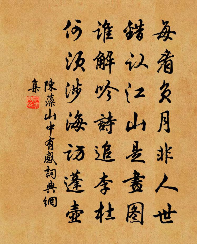 詩詞名句歷史字典書法欣賞書法字典國語詞典說文解字康熙字典古漢語字典標 題 作 者 詩 句 山中有感作者:陳藻 朝代:宋代山中有感原文每看負月非人世,錯認江山是畫圖。誰解吟詩追李杜,何須涉海訪蓬壺。詩詞問答問:山中有感的作者是誰?答:陳藻問:山中有感寫於哪個朝代?答:宋代陳藻山中有感書法欣賞山中有感書法作品詩詞推薦送陳新恩赴殿試姚勉〔宋代〕桂花香滿月輪秋,穩送鵬程萬里游。身近清光瞻帝座,手攜多士上瀛洲。戊申奏對規模闊,庚戌掄魁氣數周。陳亮句崔鶠〔宋代〕老去未覺躋攀難,一表獨立青冥里。送春強至〔宋代〕年年不會春來處,疑自深紅嫩白間。今日卻從何處去,明年依舊待君還。不堪眼見鶯花老,安得心同木石頑。身外花鴨杜甫〔唐代〕花鴨無泥滓,階前每緩行。羽毛知獨立,黑白太分明。不覺群心妒,休牽眾眼驚。稻粱沾汝在,作意莫先鳴。句釋曉瑩〔宋代〕放懷便所便。臥輿陸游〔宋代〕白首躬耕已有期,鳳城歸路卻遲遲。臥輿擁被聽秋雨,占盡人間好睡時。偈六十三首釋道寧〔宋代〕門外春將暮,園林華木殘。靈雲訊息在,遊子莫{滿氵換頁}頇。雲舒四野,雨瀉長空。花落花開,春來春去。往樂天見示傷微之敦詩晦叔三君子皆有深分因成是詩以寄劉禹錫〔唐代〕吟君嘆逝雙絕句,使我傷懷奏短歌。世上空驚故人少,集中惟覺祭文多。芳林新葉催陳葉,流水前波讓後波。萬古北邙行釋法泉〔宋代〕前山後山高峨峨,喪車轔轔日日過。哀歌幽怨滿岩谷,聞者潛悲薤露歌。哀歌一聲千載別,孝子順孫徒泣血。世間甲子晴陸游〔宋代〕今日甲子晴,秋稼始可言。老農喜相覓,隨事具雞豚。掃地設菅席,酌酒老瓦盆。耳熱仰視天,何異傾金尊。牛羊冬景感懷曾豐〔宋代〕草曾為底惡,霜乃得能嗔。罷曳木無守,虔劉風不仁。楓衰山反本,石出水藏神。浩嘆吾其老,猶為逆旅人。寒瀑陳栩〔宋代〕玄冥布令雨雪,白瀑傾崖玉作花。坐愛奔聲空谷窅,幽深方覺是仙家。暮上瞿唐峽項斯〔唐代〕自古艱難地,孤舟旦暮程。獨愁空託命,省已是輕生。有樹皆相倚,無岩不倒傾。蛟螭波數怒,鬼怪火潛明。履道白雲先生王迥見訪孟浩然〔唐代〕閒歸日無事,雲臥晝不起。有客款柴扉,自雲巢居子。居閒好芝朮,採藥來城市。家在鹿門山,常游澗澤水。手持十分吟邵雍〔宋代〕所謂十分人,須有十分真。非為能寫字,非謂能為文。非謂眉目秀,非謂衣服新。欲行人世上,直須先了身。贈淳于公歸養柴成務〔宋代〕九霄析命降絲綸,榮列青宮聽侍親。著□顯通天上籍,循陔重看每邊春。入為鴛鷺行中客,歸作煙霞象外人。一自火後借居君子亭書事四絕呈粹翁陳與義〔宋代〕天公惡劇逐番新,賴是今年有主人。君子亭中眠白晝,燕公樓上步青春。送夏中丞赴寧國任李端〔唐代〕楚縣入青楓,長江一派通。板橋尋謝客,古邑事陶公。片雨收山外,連雲上漢東。陸機猶滯洛,念子望南鴻。菩薩蠻(秋老江行)趙長卿〔宋代〕炊煙一點孤村迥。嬌雲斂盡天容淨。雁字忽橫秋。秋江瀉客愁。銀鉤空寄恨。恨滿憑誰問。袖手立西風。舟行秋色減字木蘭花(章甥築地相望作)葛立方〔宋代〕張南周北。謾說清漳搖紺碧。何似幽棲。甥舅相望共一溪。璇題沙版。不用買鄰糜百萬。余戶增輝。庭列芝蘭戶戟名句推薦辭柯霜葉,飛來就我題紅。朱庭玉《天淨沙·秋》 黃鸝驚夢破,青鳥喚春還。張弘范《臨江仙·憶舊》 明犯強漢者,雖遠必誅。班固《漢書·傳·傅常鄭甘陳段傳》 戰戰慄栗,日慎一日,苟慎其道,天下可有。韓非及後人《韓非子·初見秦》 回樂烽前沙似雪,受降城外月如霜。李益《夜上受降城聞笛》 先淡後濃,先疏後親,先遠後近,交友道也。陳繼儒《小窗幽記·集醒篇》 正其末者端其本,善其後者慎其先。房玄齡《晉書·列傳·第二十五章》 君歌楊叛兒,妾勸新豐酒。李白《楊叛兒》 星漢燦爛,若出其里。曹操《觀滄海 / 碣石篇》 秋色雁聲愁幾許,都在斜陽。吳文英《浪淘沙·九日從吳見山覓酒》