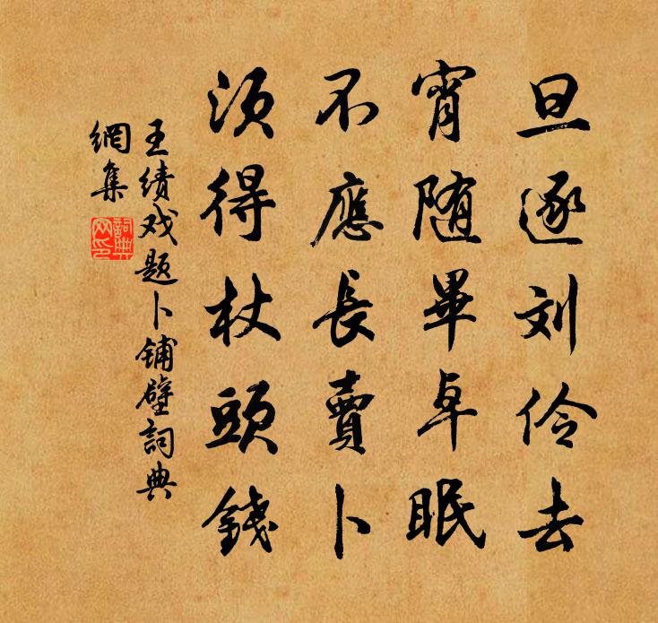 詩詞名句歷史字典書法欣賞書法字典國語詞典說文解字康熙字典古漢語字典標 題 作 者 詩 句 戲題卜鋪壁作者:王績 朝代:唐代戲題卜鋪壁原文旦逐劉伶去,宵隨畢卓眠。不應長賣卜,須得杖頭錢。詩詞問答問:戲題卜鋪壁的作者是誰?答:王績問:戲題卜鋪壁寫於哪個朝代?答:唐代問:戲題卜鋪壁是什麼體裁?答:五絕問:王績的名句有哪些?答:王績名句大全王績戲題卜鋪壁書法欣賞戲題卜鋪壁書法作品注釋全唐詩:卷37_29詩詞推薦舟到梅雨暴漲朱繼芳〔宋代〕夜月離於畢,篙師可奈何。帆穿風減半,並闊雨添多。側岸無牽路,中流有旋渦。平生柂樓底,得在柳梢過。次韻伯瑞見示並懷叔驥和叔趙蕃〔宋代〕世情易作風沙散,我輩端知雪柏堅。不以翱翔鴻鵠與,遂忘寂寞鷺鷗邊。往來苕霅渾疑夢,邂逅瀟湘重足憐。何日次韻二首葉茵〔宋代〕過牆新竹粉痕黏,蛙鬧池塘燕掠檐。自喜江鄉成懶散,從教世界要莊嚴。稻秧井井畦千緯,荷葉田田水一奩。心事過登源英濟廟祈雨虞儔〔宋代〕古廟出靈響,吾儕非過求。山田雖欠雨,陂水尚通溝。出郭漸無日,祈年望有秋。豚蹄真狹甚,明信或堪羞。明發陳公徑過摩舍那灘石峰下十首楊萬里〔宋代〕澄潭涌暗暈,不風自成花。回流如倦客,出門復還家。江晴已數日,新漲沒舊沙。知是前溪雨,濕雲尚橫斜。已未年春與伯時較試南宮同年被命者六人今茲鄧忠臣〔宋代〕十載京師五校文,並游多已據通津。再來更鎖城西館,檢點同年只一人。次韻邑宰徐何慊出示所作五首陳著〔宋代〕錦制丈高底怕傷,手揮煩勢坐清涼。豁聞心上平明鏡,看破人間戲散場。縣裡方將客醉白,台端只怕趣催黃。梅花送楊尚書赴東川姚合〔唐代〕卻縠詩書將,銜恩赴梓州。繞身垂印綬,護馬執戈矛。劍閣和銘峭,巴江帶字流。從來皆惜別,此別復何愁。六祖贊釋道沖〔宋代〕菱花撲碎已誵訛,夜半傳衣事轉多。從此曹溪玄路絕,無風夜起拍天波。聰老劉克莊〔宋代〕聰老才堪將,髠緇意未平。僧中能結客,禪外又談兵。喜聽詩家話,多知虜地情。何當長鬚髮,遣戌國西營。次韻謝洞霄俞仲囦方回〔宋代〕卷舒來卷徹初終,物象惟君指呼中。夜鶴一聲醒閴寂,晚霞千變繪虛空。市朝往事驚陽焰,林壑幽居勝閬風。如許和王朝議韻吳芾〔宋代〕晚日蓋轉雲頭,蓋長空收雨蓋腳。稍覺暑氣清,獨坐傾桑落。興來或醉吟,接?還倒著。胸中了無憂,事事俱脫略喜張十八博士除水部員外郎白居易〔唐代〕老何歿後吟聲絕,雖有郎官不愛詩。無復篇章傳道路,空留風月在曹司。長嗟博士官猶屈,亦恐騷人道漸衰。今日本善上人釋祖欽〔宋代〕本來面日,善自參詳。六般神用,晝夜放光。不須擬議,切忌承當。風前一陣木犀香,金粟花黃。偶成宋祁〔宋代〕不用真如鼠,胡瞻亦有鶉。田園未歸客,天地一畸人。京邑風霜苦,江鄉薇蕨春。可能迷鬼笑,長送左朱輪。贈了上人抄化黃庚〔宋代〕破衲卷秋雲,入山深更深。近聞營梵剎,應不累禪心。寒瀑瀉蒼壁,晚花生古林。遙思明月夜,誰聽穎師琴。雲山歌徐僑〔宋代〕雲山窈兮風微,山徑繚兮雲依。蘭馨兮晨晞,松樛兮夕暉。有禽消搖其間兮不去,飛俛啄兮蔌薇。昂吟兮綠筠枝,次韻宋尚書山居十五詠臥雲庵方岳〔宋代〕半塢雲侵蘚石床,向來憂樂已俱忘。牆西有竹曾留鶴,夢亦相攜入帝鄉。病中偶書二首蔡襄〔宋代〕已感節候變,物態舒陽春。那復壯年意,如今多病身。淨室焚香久,烘爐煮藥頻。神歡百慮解,銷盡眼前塵。害別袁和叔孫應時〔宋代〕風帆曉影動行裝,月淡芙蕖浦漵香。正想雙親開色笑,不須千里嘆淒涼。隨行書卷生涯在,省事官曹氣味長。便為名句推薦總為浮雲能蔽日,長安不見使人愁。李白《登金陵鳳凰台》 戍鼓斷人行,邊秋一雁聲。杜甫《月夜憶舍弟》 清水出芙蓉,天然去雕飾。李白《經亂離後天恩流夜郎憶舊遊書懷贈江夏韋太守良宰》 斜陽外,寒鴉萬點,流水繞孤村。秦觀《滿庭芳·山抹微雲》 誰言千里自今夕,離夢杳如關塞長。薛濤《送友人》 貧無可奈惟求儉,拙亦何妨只要勤。王永彬《圍爐夜話·第三則》 何處合成愁。吳文英《唐多令·惜別》 關河底事空留客?歲月無情不貸人。于謙《立春日感懷》 江南自是離愁苦,況游驄古道,歸雁平沙。王沂孫《高陽台·和周草窗寄越中諸友韻》 如何肯到清秋日,已帶斜陽又帶蟬。李商隱《柳》