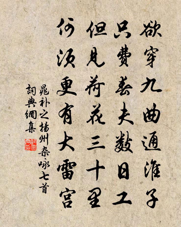 詩詞名句歷史字典書法欣賞書法字典國語詞典說文解字康熙字典古漢語字典標 題 作 者 詩 句 揚州雜詠七首作者:晁補之 朝代:宋代揚州雜詠七首原文欲穿九曲通淮子,只費春夫數日工。但見荷花三十里,何須更有大雷宮。詩詞問答問:揚州雜詠七首的作者是誰?答:晁補之問:揚州雜詠七首寫於哪個朝代?答:宋代問:晁補之的名句有哪些?答:晁補之名句大全晁補之揚州雜詠七首書法欣賞揚州雜詠七首書法作品詩詞推薦紹興祀岳鎮海瀆四十三首佚名〔宋代〕澒洞鴻濛,天興無極。尋納江漢,節宣南北。順助其功,善下惟德。我祀孔時,以介景福。題寄傲軒陳杰〔宋代〕富貴驕人擁廬兒,寒士不遜原壤夷。傲稱凶德無逢宜,長者寄爾渠得知。使襪聊為廷尉重,命履乃有帝師用,苟非卜運算元陳瓘〔宋代〕夢裡不知眠,覺後眠何在。試問眠身與夢身,那個能祗對。醉後有人醒,醒了無人醉。要識三千與大千,不在微塵月石陸九韶〔宋代〕玉兔愛佳泉,飲泉化為石。規圓立山趾,萬古終不息。應厭舊星躔,盈稀多缺夕。自從寄茲蹤,表表無晦蝕。光彩故人亭項安世〔宋代〕翠壁丹崖雲氣浮,故人亭下駐行舟。瀟湘東去連滄海,桂嶺西來接永州。浦樹生煙攢舴艋,岩花覆水叫{左車右勾早離永明晚抵江華道中江朝議〔宋代〕舍車跨馬喜新晴,倍風旌旗照眼明。顧我未能流美化,邦人何事喜相迎。題秋風紈扇圖唐寅〔明代〕秋來紈扇合收藏,何事佳人重感情?請把世情詳細看,大都誰不逐炎涼!海棠次蘇子瞻韻趙汃夫〔宋代〕海棠別得一風光,恨不生香轉曲廊。春睡太真困未足,胭脂露冷濕紅妝。晴望楊萬里〔宋代〕愁於望處一時銷,山亦霜前分外高。枸杞一叢渾落盡,只殘紅乳似櫻桃。和胡戢七首晁補之〔宋代〕時平未用入山深,歲晚何妨木秀林。聞說熊羆參後乘,可容牛下有哀吟。丙子歲三月十有二日游嵩山宿峻極中院時天氣李廌〔宋代〕穿雲上虛無,彷佛凌倒景。微茫鴻鵠背,指點眾山頂。出日上扶桑,徘徊萬林影。漁家傲楊無咎〔宋代〕菊暗枯秋已滿。棖黃橘綠冬初暖。草草杯盤成小宴。殷勤勸。尊前莫遣霞觴淺。兩鬢從教霜點半。人生最要長為伴浩西堂見和因再用韻釋紹嵩〔宋代〕沙邊鷗鷺日相親,老去光陰非我春。百巧從來知是妄,獨援詩筆得天真。哭韋大夫之晉杜甫〔唐代〕悽愴郇瑕色,差池弱冠年。丈人叨禮數,文律早周旋。台閣黃圖裡,簪裾紫蓋邊。尊榮真不忝,端雅獨翛然。貢喜應天長許棐〔宋代〕濺紫飄紅風又雨。一刻韶芳留不住。燕吞聲,鶯誶語。待得晴來人已去。怯新歌,憐舊舞。冷落艷腔芳譜。要識此贈明道者陳允平〔宋代〕三衣終日護,白社踵東林。淨業心無住,清齋力不禁。蓮香秋觀靜,松吹石橋陰。見說溪南虎,時來聽梵音。菩薩蠻陳義〔宋代〕天生體態腰肢細。新詞唱徹歌聲利。出口便清奇。揚塵簌簌飛。主人恩義重。宴出紅妝寵。便要賞新荷。時光也不次韻酬陳傳道秦觀〔宋代〕白髮三冬學,青衫八尺身。誰知人上傑,聊作吏中循。揮翰通元氣,開編友古人。寄聲張氏子,曲逆豈長貧。再次韻四首陳造〔宋代〕新釀開缸淥蟻浮,舊辭仍缺唾壺謳。宦塗要處難插手,詩社叢中常引頭。倒載肯陪山簡醉,反關莫厭孟公留。秋田秋望陸游〔宋代〕千里郊原俯莽蒼,三江煙水接微茫。橫林蟲鏤無全葉,新雁風驚有斷行。神禹祠庭遺劍佩,先秦金石古文章。一尊名句推薦秋氣堪悲未必然,輕寒正是可人天。楊萬里《秋涼晚步》 春風又綠江南岸,明月何時照我還?王安石《泊船瓜洲》 枝上柳綿吹又少。天涯何處無芳草。蘇軾《蝶戀花·春景》 百囀無人能解,因風飛過薔薇。黃庭堅《清平樂·春歸何處》 孤雁不飲啄,飛鳴聲念群。杜甫《孤雁 / 後飛雁》 壯年何事憔悴,華發改朱顏。蘇舜欽《水調歌頭·滄浪亭》 萬里橋西一草堂,百花潭水即滄浪。杜甫《狂夫》 人生得意須盡歡,莫使金樽空對月。李白《將進酒》 素富貴,行乎富貴;素貧賤,行乎貧賤;素夷狄,行乎夷狄;素患難,行乎患難。君子無入而不自得焉。子思《中庸·第十四章》 寒雪梅中盡,春風柳上歸。李白《宮中行樂詞八首》
