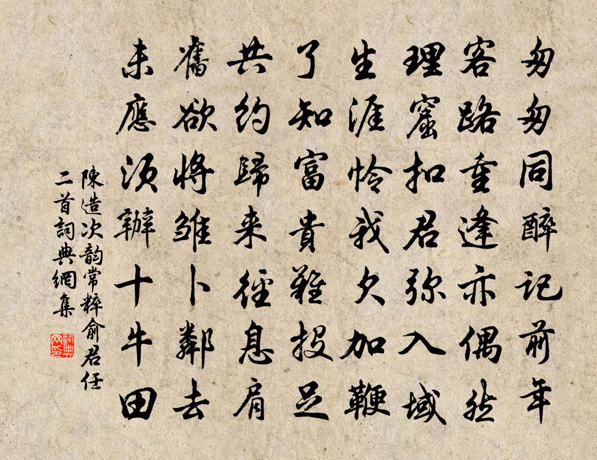 詩詞名句歷史字典書法欣賞書法字典國語詞典說文解字康熙字典古漢語字典標 題 作 者 詩 句 次韻常粹俞君任二首作者:陳造 朝代:宋代次韻常粹俞君任二首原文匆匆同醉記前年,客路重逢亦偶然。理窟扣君彌入域,生涯憐我欠加鞭。了知富貴難投足,共約歸來徑息肩。舊欲將雛卜鄰去,未應須辦十牛田。詩詞問答問:次韻常粹俞君任二首的作者是誰?答:陳造問:次韻常粹俞君任二首寫於哪個朝代?答:宋代陳造次韻常粹俞君任二首書法欣賞次韻常粹俞君任二首書法作品詩詞推薦勸學孟郊〔唐代〕擊石乃有火,不擊元無煙。人學始知道,不學非自然。萬事須己運,他得非我賢。青春須早為,豈能長少年。頌古釋慧空〔宋代〕我手何似佛手,拈起扇子擗口。打落帝釋花冠,卻是寒山掃箒。送王亞之曾幾〔宋代〕執手河梁有贈言,檣烏端為小留連。無風浪起勤看客,不盡江來穩放船。煙雨樓台空夢到,雲天鴻雁只書傳。不須六州歌頭(寄孫竹湖)劉過〔宋代〕問訊竹湖,竹如之何,如何未歸。道吳山越水,無非佳處,來無定止,去亦何之。莫是秋來,未能忘耳,心與孤雲露成彥雄〔唐代〕銀河昨夜降醍醐,灑遍坤維萬象蘇。疑是鮫人曾泣處,滿池荷葉捧真珠。晝月韓愈〔唐代〕玉碗不磨著泥土,青天孔出白石補。兔入臼藏蛙縮肚,桂樹枯株女閉戶。陰為陽羞固自古,嗟汝下民或敢侮,戲嘲蒙齋趙蕃〔宋代〕嶄岩鬱郁勢參天,下有幽幽百尺泉。淺汲寧容長蛙鮒,旱年端可洗蚳蝝。若人懷寶故如此,笑彼發蒙真易然。不但許敬之用余言作松山草堂然游山之意猶未已也葉適〔宋代〕許子家住松山邊,門開路闢登山巔。千年茂樹不改葉,百尺甘井常流泉。堂中悄然人境絕,時有剝啄延臞仙。天下答陳五進士遺山水枕屏梅堯臣〔宋代〕妙畫能成趣,溪山迥得君。漁舟長映浦,岩樹半藏雲。征雁無時沒,橫橋有處分。數峰來枕席,曾不愧移文。詠霜二首蘇轍〔宋代〕清霜欺客病,乖夜逼窗扉。坐睡依爐暖,細聲聞葉飛。蕉絺空滿篋,砧杵旋催衣。起看庭前草,松筠未覺非。靜林精舍靈一〔唐代〕靜林溪路遠,蕭帝有遺蹤。水擊羅浮磬,山鳴于闐鍾。燈傳三世火,樹老萬株松。無數煙霞色,空聞昔臥龍。秋晚陸游〔宋代〕雞聲喔喔頻催曉,木葉颼颼已變秋。憂患縱多終強項,饑寒未至且優遊。老罷尚欲身當道,乳虎何疑氣食牛。但有漁家傲杜安世〔宋代〕疏雨才收淡濘天。微雲綻處月嬋娟。寒雁一聲人正遠。添幽怨。那堪往事思量遍。誰道綢繆兩意堅。水萍風絮不相時人號李知遠語佚名〔唐代〕李下無蹊。無題陳棣〔宋代〕斥鷃蒿蓬足,鯤鵬謾北溟。餘生薰白業,內景練黃庭。大白蟻浮綠,短檠燈閃青。欲知陶令趣,應向醉中醒。送陳養晦教論之象山戴表元〔宋代〕聞說橫經處,潭潭坐翠微。開窗見日出,指席有雲飛。藥市山山古,魚餐水水肥。新篇應爛熳,休遣遞筒稀。巴江秋夕釋保暹〔宋代〕巴水寒聲去渺茫,半空雲樹落秋光。離人此夜和愁宿,不聽啼猿亦斷腸。途中寄劉沆(一作寄朱特)方乾〔唐代〕登車誤相遠,談笑亦何因。路入瀟湘樹,書隨巴蜀人。斂衣寒犯雪,傾篋病看春。莫負髫年志,清朝作獻臣。留別龔處士李白〔唐代〕龔子棲閒地,都無人世喧。柳深陶令宅,竹暗辟疆園。我去黃牛峽,遙愁白帝猿。贈君卷葹草,心斷竟何言。摸魚兒(玉林君為遺蛻山中桃花賦也。花與主人,何幸如之,用韻和謝)馮取洽〔宋代〕嘆劉郎、那回輕別,霏霏三落紅雨。玄都觀里應遺恨,一抹斷煙殘縷。愁望處。想霧暗雲深,忘卻來時路。新花舊名句推薦江上春山遠,山下暮雲長。葛長庚《水調歌頭·江上春山遠》 浩蕩離愁白日斜,吟鞭東指即天涯。龔自珍《己亥雜詩·其五》 人過留名,雁過留聲。佚名《增廣賢文·下集》 四月清和雨乍晴,南山當戶轉分明。司馬光《客中初夏》 惡人自有惡人磨。施耐庵《水滸傳·第三十回》 雪中何以贈君別,惟有青青松樹枝。岑參《天山雪歌送蕭治歸京》 與朋友論學,須委曲謙下,寬以居之。王陽明《傳習錄·卷下·門人陳九川錄》 劃然長嘯,草木震動,山鳴谷應,風起水涌蘇軾《後赤壁賦》 弱冠弄柔翰,卓犖觀群書。左思《詠史八首·其一》 能近取譬,可謂仁之方也已。孔子弟子《論語·雍也篇》
