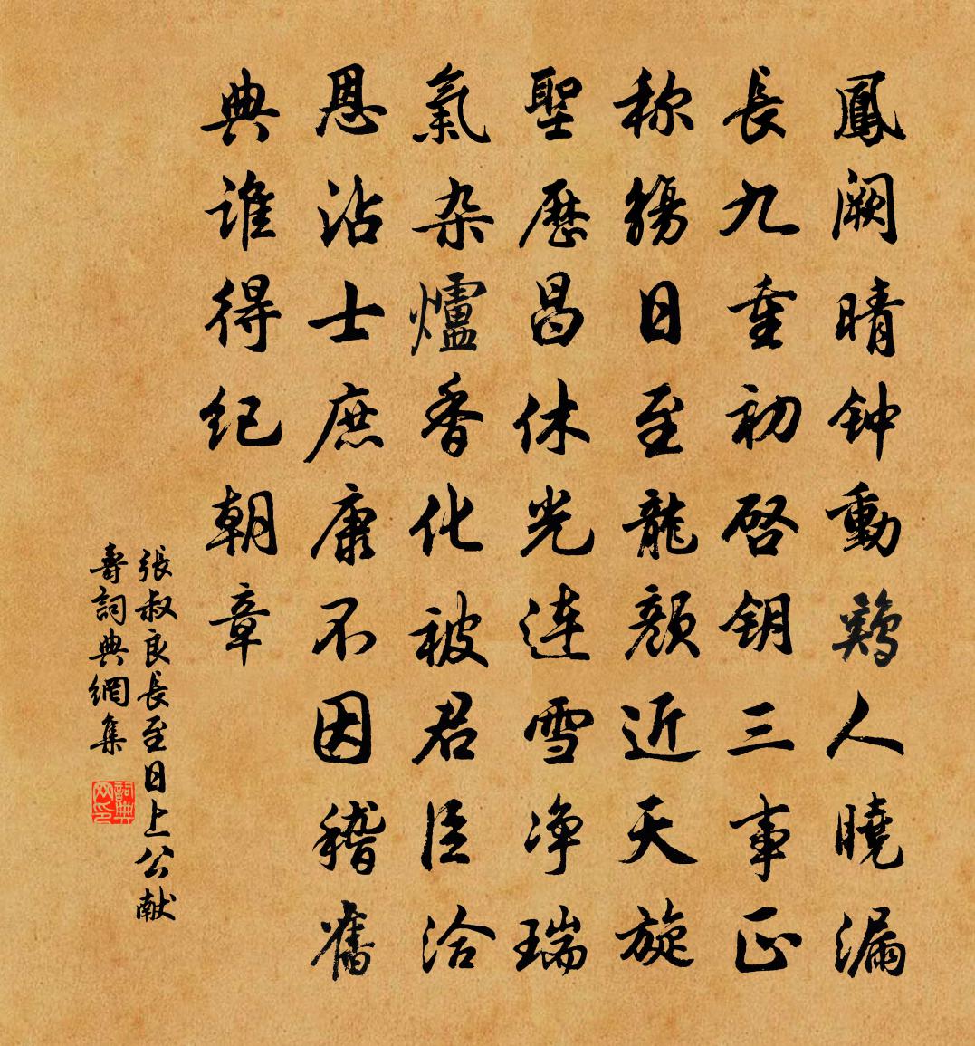 詩詞名句歷史字典書法欣賞書法字典國語詞典說文解字康熙字典古漢語字典標 題 作 者 詩 句 長至日上公獻壽作者:張叔良 朝代:唐代長至日上公獻壽原文鳳闕晴鍾動,雞人曉漏長。九重初啟鑰,三事正稱觴。日至龍顏近,天旋聖歷昌。休光連雪淨,瑞氣雜爐香。化被君臣洽,恩沾士庶康。不因稽舊典,誰得紀朝章。詩詞問答問:長至日上公獻壽的作者是誰?答:張叔良問:長至日上公獻壽寫於哪個朝代?答:唐代問:長至日上公獻壽是什麼體裁?答:五排張叔良長至日上公獻壽書法欣賞長至日上公獻壽書法作品注釋全唐詩:卷272_4詩詞推薦過竹村張鎡〔宋代〕再宿離城邑,全無世俗氣。僧包輕濺水,漁灶冷炊雲。酒好休教盡,詩慳卻自欣。晝閒貪睡穩,獨被不須重。館娃宮一首王阮〔宋代〕釋越來妖艷,窮吳事儁游。笑談遺廟社,繪罽及山丘。鵷宿離宮瓦,龍移別浦舟。楯陳金制巧,床瑩玉光浮。破雨晚秋郊居八首趙蕃〔宋代〕九日黃花信昔談,是身何自見江南。故今開晚方為貴,失所胡為浪不堪。逢王建有贈張籍〔唐代〕年狀皆齊初有髭,鵲山漳水每追隨。使君座下朝聽易,處士庭中夜會詩。新作句成相借問,閒求義盡共尋思。經今浣溪沙張弘范〔元代〕山掩人家水繞坡。野猿岩鳥太平歌。黃雞白酒興偏多。幸自琴書消日月,盡教名利走風波。釣台麟閣竟如何。麥熟有感石介〔宋代〕去年經春頻肆赦,拜赦人忙走如馬。五月不雨麥苗死,赦頻不能活窮寡。今年經春無赦書,十月一雨及時下。五月山雪張耒〔宋代〕空中莽落索,曉雪遍平郊。霰急松鳴葉,聲繁竹戰梢。暮鳶飢啄屋,寒雉濕依茅。誰上樑王賦,淹留感鬢毛。聞八弟朝議二十一弟朝奉二十弟迪功與安郎倉晁說之〔宋代〕葆真宮是何年有,遊子相將便得真。聞道流霞醒不醉,只應人世恨還新。廟下候風呈同行孔武仲〔宋代〕楚水千百源,洞庭為壯觀。勢居七澤右,地裂荊吳半。而我泛扁舟,飄然一歸雁。來之豈為益,去赤未足算。胡不送從叔重赴海南從事馬戴〔唐代〕又從連帥請,還作嶺南行。窮海何時到,孤帆累月程。亂蟬吟暮色,哀狖落秋聲。晚路潮波起,寒葭霧雨聲。沙埋初黃綬赴藍田縣作錢起〔唐代〕蟠木無匠伯,終年棄山樊。苦心非良知,安得入君門。忽忝英達顧,寧窺造化恩。螢光起腐草,雲翼騰沉鯤。片石海上人知浴求頌釋正覺〔宋代〕溫溫氣象半篙津,匏杓調和冷暖勻。直得通身渾是水,端知赤肉了無塵。風埃面目揩磨淨,丘壑形骸洗濯春。妙觸正月九日上之游楊季穆以酬唱見寄走筆次韻魏了翁〔宋代〕雨中未放笑眉開,獨守空齋著玉杯。觀水功夫隨處見,逝川意思即心來。喜雨上文相公黃庶〔宋代〕火神侵官弄胸臆,青帝欲滿勾芒慵。驕陽暴苗不得秀,風俗相顧無顏容。我公裨補造化手,乞許暫息平奸驄。西湖狂醉元稹〔唐代〕一自柏台為御史,二年辜負兩京春。峴亭今日顛狂醉,舞引紅娘亂打人。逆境風返順和東翔侄韻陽枋〔宋代〕觀國丹心切,橫舟綠水遲。東君如有意,風返曉江吹。偈劉克莊〔宋代〕遠希大慧無,近笑孤峰絮。多少初地人,爭問末後句。上丹霄 次重陽韻馬鈺〔元代〕遇風仙,心開悟,騁顛狂。黜妻屏子便迎祥。逍遙坦蕩,恣情吟詠謾成章。就中行化覓知友,同共聞香。烹丹鼎,春水喻良能〔宋代〕磬湖春水夜來生,曉起雷聲逗雨聲。去馬來牛心莫辨,鸕鶿鸂鶒眼俱明。飄零花片有底急,搖曳柳絲如許輕。旬月贈無咎張耒〔宋代〕快哉亭下水連城,落日斷霜相映明。人在捲簾尊俎里,詩從揮麈笑談生。揚州何遜風流在,江夏黃香句法清。□□名句推薦焉有君子而可以貨取乎?孟子《孟子·公孫丑章句下·第三節》 秋色雁聲愁幾許,都在斜陽。吳文英《浪淘沙·九日從吳見山覓酒》 君獨不見長城下,死人骸骨相撐拄。陳琳《飲馬長城窟行》 棘枝風哭酸,桐葉霜顏高。孟郊《秋懷十五首》 春還草閣梅先動,月滿虛庭雪未消。王守仁《元夕二首》 人怕三見面,樹怕一墨線。佚名《增廣賢文·下集》 奇外無奇更出奇,一波才動萬波隨。元好問《論詩三十首·二十二》 文章已滿行人耳,一度思卿一愴然。李忱《吊白居易》 燕子不知人去也,飛認闌乾。韓疁《浪淘沙·莫上玉樓看》 應是夜寒凝。惱得梅花睡不成。黃升《南鄉子·冬夜》