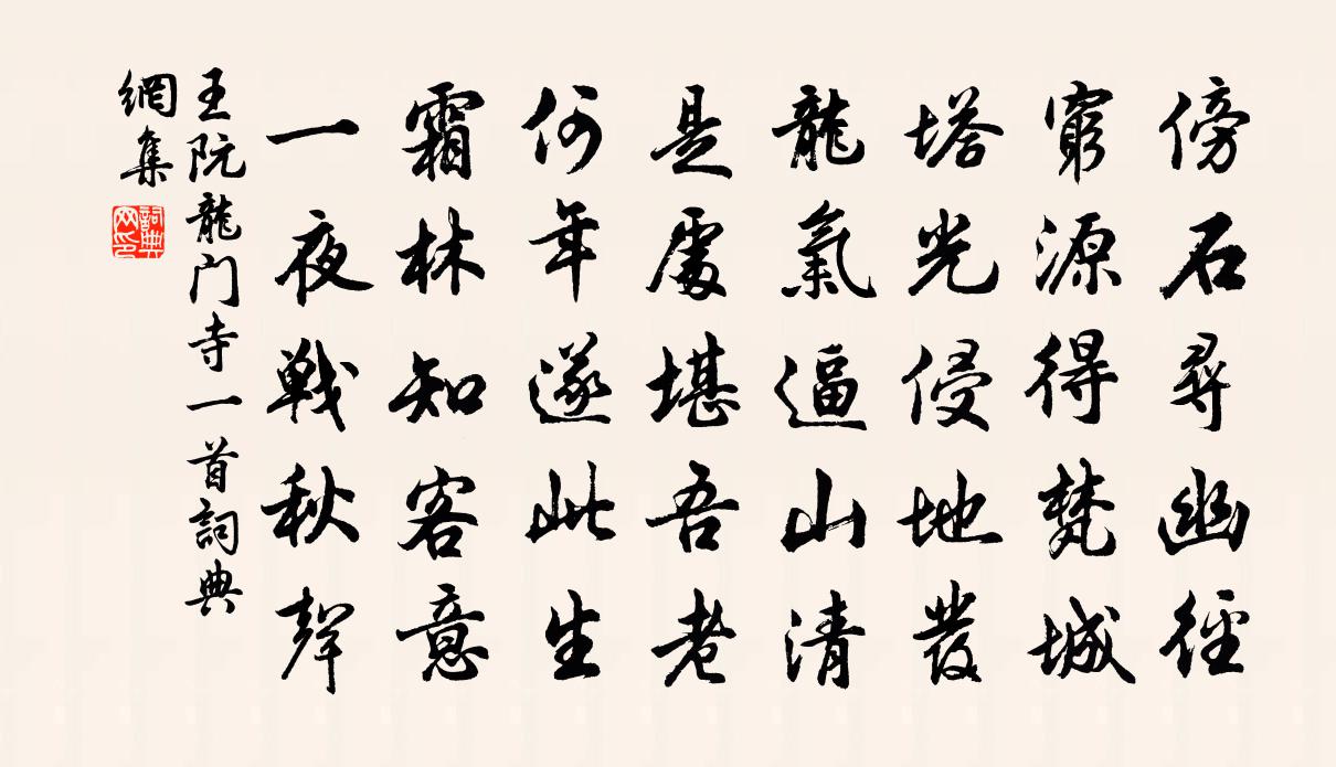 詩詞名句歷史字典書法欣賞書法字典國語詞典說文解字康熙字典古漢語字典標 題 作 者 詩 句 龍門寺一首作者:王阮 朝代:宋代龍門寺一首原文傍石尋幽徑,窮源得梵城。塔光侵地發,龍氣逼山清。是處堪吾老,何年遂此生。霜林知客意,一夜戰秋聲。詩詞問答問:龍門寺一首的作者是誰?答:王阮問:龍門寺一首寫於哪個朝代?答:宋代王阮龍門寺一首書法欣賞龍門寺一首書法作品詩詞推薦古風其三十七李白〔唐代〕燕臣昔慟哭。五月飛秋霜。庶女號蒼天。震風擊齊堂。精誠有所感。造化為悲傷。而我竟何辜。遠身金殿旁。( 過蒼梧陶弼〔宋代〕近海江聲急,孤舟下杳冥。峽泉飛暴雨,灘石走群星。水有瀟湘色,猿同巴蜀聽。令人思舜德,一望九嶷青。和趙簿題席麻林居士小隱四韻五邁〔宋代〕笙簧豈不韻,雅景受風松。紈綺可為裳,靈均采芙蓉。古來曠達士,世膩亦太慵。可望不可押,人如雲外峰。以端谿硯酬張員外水精珠兼和來篇徐鉉〔唐代〕靖以端谿潤,酬君水玉明。方圓雖異器,功用信俱呈。自得山川秀,能分日月精。巾箱各珍重,所貴在交情。登石頭山項安世〔宋代〕山腰萬竹閟清寒,上徹山頭望始寬。州渚東西分線路,台城表里見毫端。青開淮甸天空闊,紫覆鐘山氣鬱盤。城下熙寧望祭岳鎮海瀆十七首佚名〔宋代〕帝德乘坎,時御閉藏。爰潔牲楝,兆茲北方。海山攸宅,神施無疆。具享蠲吉,降福也穰。浣溪沙·半踏長裾宛約行孫光憲〔唐代〕半踏長裾宛約行,晚簾疏處見分明,此時堪恨昧平生。早是銷魂殘燭影,更愁聞著品弦聲,杳無訊息若為情。白蟮穴陳岩〔宋代〕炊沙自昔終難飽,坎土於今乃可餐。翻笑青泥變青石,嵇康無分啜仙丹。燒藥不成命酒獨醉白居易〔唐代〕白髮逢秋王,丹砂見火空。不能留奼女,爭免作衰翁。賴有杯中綠,能為面上紅。少年心不遠,只在半酣中。冬至雪蘇轍〔宋代〕旱久魃不死,連陰未成雪。微陽九地來,顛風三日發。父老竊相語,號令風為節。講武罷冬夫,畿甸休保甲。纍囚巫山一段雲 漁村落照李齊賢〔元代〕雨霽長江碧,雲歸遠岫青。一邊殘照在林*。綠網曬苔扃。波影明重綺,沙痕射遠星。鱸魚白酒醉還醒。身世任浮克信弟坐上賦梅花二首楊萬里〔宋代〕對酒初驚發半華,折梅還覺興殊佳。如何屋角西南月,只照梢頭一兩花。自是向來香寂寞,不須更道影橫斜。北枝游東湖黃處士園林劉威〔唐代〕偶向東湖更向東,數聲雞犬翠微中。遙知楊柳是門處,似隔芙蓉無路通。樵客出來山帶雨,漁舟過去水生風。物情新秋藥名兩首洪咨夔〔宋代〕兩眼旋花雪點須,鑽頭故紙枉工夫。倦懷懶附子公櫝,閒性熟諳摩詰圖。枝拂雲香行到桂,葉隨風舞又催梧。乘槎風入松(癸卯至石塘追和十五年前韻)劉克莊〔宋代〕殘更難睚抵年長。曉月淒涼。芙蓉院落深深閉,嘆芳卿、今在今亡。絕筆無求凰曲,痴心有返魂香。起來休鑷鬢邊【不知宮調】甜水令佚名〔元代〕麻絛草履風袍袖,名利不剛求。蓑笠綸竿釣魚鉤,綠水東流。 爐中煉出靈丹藥,雷震採茶苗。明月清風杖頭挑次韻張元方春雪陳與義〔宋代〕雲黃天為低,窗白雪初作。幽人睡方覺,簾外舞萬鶴。斜斜既可人,整整亦不惡。不知來何暮,遂失梅花約。東風放言王禹偁〔宋代〕賢人雖學心無悶,君子須知道自消。德似仲尼悲鳳鳥,聖如姬旦賦鴟鴞。看松好待嚴霜降,試玉宜將烈火燒。青女偈六十九首釋道寧〔宋代〕毗慮影里,般若光中。互為主伴,法界融能。白雲片片,帝網重重。形分萬派,月印寒空。道人活計,古佛家風。和梁宏父二首王之道〔宋代〕時來談笑取侯封,清曠寧容雅志從。上聖急賢齊舜禹,群公引類邁夔龍。非材似我十圍櫟,有用如君千丈松。邂逅名句推薦解鞍欹枕綠楊橋,杜宇一聲春曉。蘇軾《西江月·頃在黃州》 秋江上,看驚弦雁避,駭浪船回。辛棄疾《沁園春·帶湖新居將成》 白雲初下天山外,浮雲直向五原間。盧思道《從軍行》 三人行,則損一人;一人行,則得其友。姬昌《周易·損卦》 花光濃爛柳輕明,酌酒花前送我行。歐陽修《別滁》 丞相祠堂何處尋,錦官城外柏森森。杜甫《蜀相》 老翁逾牆走,老婦出門看。杜甫《石壕吏》 家有千口,主事一人。佚名《增廣賢文·下集》 相呼相應湘江闊,苦竹叢深日向西。鄭谷《鷓鴣》 枯枝無醜葉,涸水吐清泉李白《長歌行》