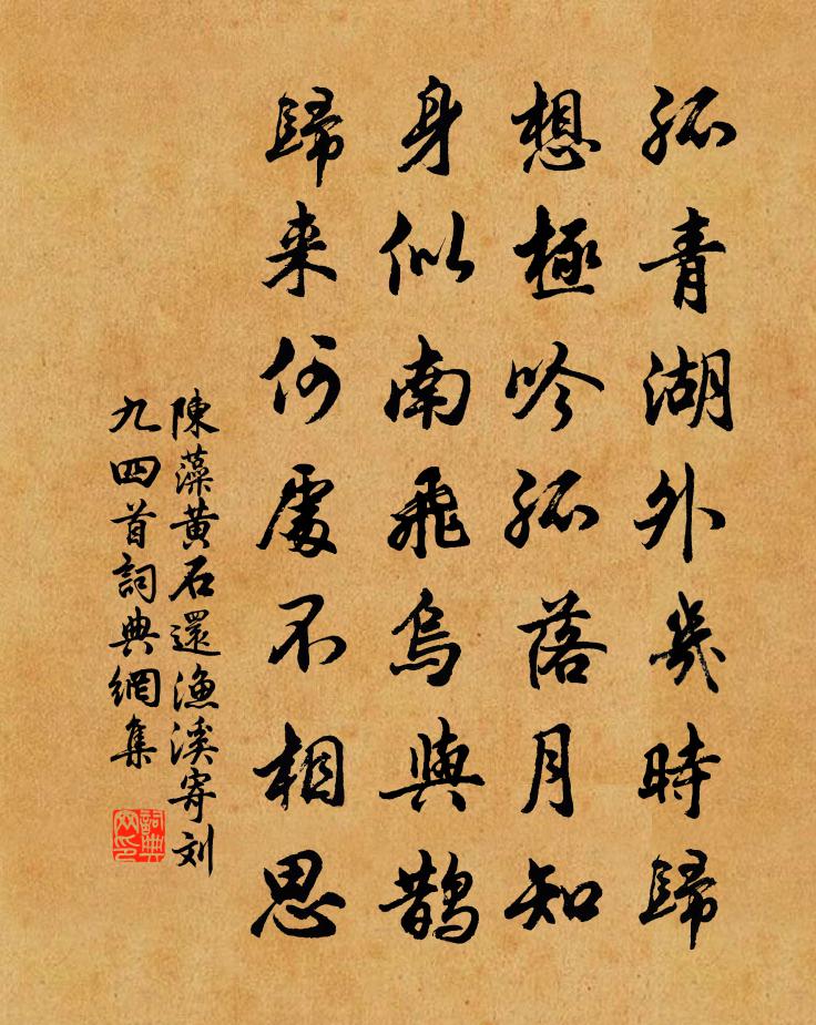 詩詞名句歷史字典書法欣賞書法字典國語詞典說文解字康熙字典古漢語字典標 題 作 者 詩 句 黃石還漁溪寄劉九四首作者:陳藻 朝代:宋代黃石還漁溪寄劉九四首原文孤青湖外幾時歸,想極吟孤落月知。身似南飛烏與鵲,歸來何處不相思。詩詞問答問:黃石還漁溪寄劉九四首的作者是誰?答:陳藻問:黃石還漁溪寄劉九四首寫於哪個朝代?答:宋代陳藻黃石還漁溪寄劉九四首書法欣賞黃石還漁溪寄劉九四首書法作品詩詞推薦蟬許渾〔唐代〕噪柳鳴槐晚未休,不知何事愛悲秋。朱門大有長吟處,剛傍愁人又送愁。隴西都尉禪會圖宋祁〔宋代〕宴場禪集盛,霜幅繪毫工。竺社同開葉,嵇姿宛送鴻。法身寧滯相,世眼願瞻風。廚鑰方傳寶,非專岩壑中。偈六十三首釋道寧〔宋代〕滂沱天際雨,嘹亮寺亭鍾。耳目不到處,翻憐面壁翁。次韻秦少章和錢蒙仲蘇軾〔宋代〕碧畦黃隴稻如京,歲美人和易得情。鑒里移舟天外思,地中鳴角古來聲。山圍故國城空在,潮打西陵意未平。二子宮詞張公庠〔宋代〕六宮稱賀各依班,慶誕遙瞻紫氣間。中貴推排龍喜晏,大臣分奏兩郊壇。題自然足軒劉過〔宋代〕有竹蕪生不費鋤,亭亭楚玉影癯癯。風師自是識人意,何用縱橫十萬夫。鵲橋仙朱敦儒〔宋代〕姮娥怕鬧,銀蟾傳令,且與遮鸞翳鳳。直須人睡俗塵清,放雲漢、冰輪徐動。山翁散發,披衣松下,琴奏瑤池三弄句厲文翁〔宋代〕蒼蕪萬頃渺無邊,鞭石飛梁接市廛。南歌子蔡伸〔宋代〕蕭寺疏鍾斷,虛堂夜氣清。涼蟾偏向小明窗。露井碧梧寒葉、顫秋聲。幽恨人誰問,孤衾淚獨橫。此時風月此時情出郭陳造〔宋代〕對花不領幾柳下,以詩自苦如東野。今年陡覺負芳時,狎興蕭條殊曩者。西湖南園怳入夢,漫道尻輪神作馬。可堪偈傾一百六十九首釋智朋〔宋代〕此大樓閣,無住無去。此樓閣門,無開無閉。作者同歸,中勞彈指。不雨張耒〔宋代〕齊安一郡雨不足,稻畦土堅不入谷。城中赤日風吹沙,老鴉銜火燒竹屋。百尺長繩抽井底,井中泥滓多於水。潭邊八月十五夜看月姚合〔唐代〕亭亭千萬里,三五復秋中。此夕光應絕,常時思不同。九霄微有露,四海靜無風。惆悵逡巡別,誰能看碧空。嘉州張俞〔宋代〕城分二江急,樹入九峰開。地隔犍牂繞,人從楚蜀來。游武昌張耒〔宋代〕一葉橫江凌浩渺,李君見我迎門笑。鵝黃初熟醅旋壓,書室焚香地新掃。淋漓歌笑不知夜,竹榻枕藉眠諸少。老人泗上早發許棠〔唐代〕獨起無人見,長河夜泛時。平蕪疑自動,落月似相隨。楚外離空早,關西去已遲。漁歌聞不絕,卻軫洞庭思。舟宿南尉岸下夜夕不寐思丁老小山戲成長韻王洋〔宋代〕積少自成多,一元陶萬類。破大可作小,壺中有天地。果謂真無窮,百慮同一致。若曰一毫芒,萬 * 垂翅。變化聞徐師川自京師還豫章林之奇〔宋代〕九衢塵裹無停舟,君居陋巷不出遊。滿城惡少弋鳧雁,對面故人風馬牛。別後天寒燈火夜,歸來眠冷江湖秋。馮歡和秋澗惠蘭韻王柏〔宋代〕竹蘭臭味古來同,同處元非造化工。墨竹方生秋澗上,紫蘭已到魯齋中。築台移玉尊清惠,運筆揮金尚古風。卻似贈楚雲上人溫庭筠〔唐代〕松根滿苔石,盡日閉禪關。有伴年年月,無家處處山。煙波五湖遠,瓶屨一身閒。岳寺蕙蘭晚,幾時幽鳥還。名句推薦撥雲尋古道,倚石聽流泉。李白《尋雍尊師隱居》 半死梧桐老病身,重泉一念一傷神。白居易《為薛台悼亡》 瀚海百重波,陰山千里雪。李世民《飲馬長城窟行》 思君如滿月,夜夜減清輝。張九齡《賦得自君之出矣》 何當共剪西窗燭,卻話巴山夜雨時。李商隱《夜雨寄北》 行路難!行路難!多歧路,今安在?李白《行路難三首》 春去秋來也,愁心似醉醺。歐陽炯《巫山一段雲·春去秋來也》 未知生,焉知死?孔子弟子《論語·先進篇》 使君宏放,談笑洗盡古今愁。陸游《水調歌頭·多景樓》 惜別傷離方寸亂。忘了臨行,酒盞深和淺。李清照《蝶戀花·淚濕羅衣脂粉滿》
