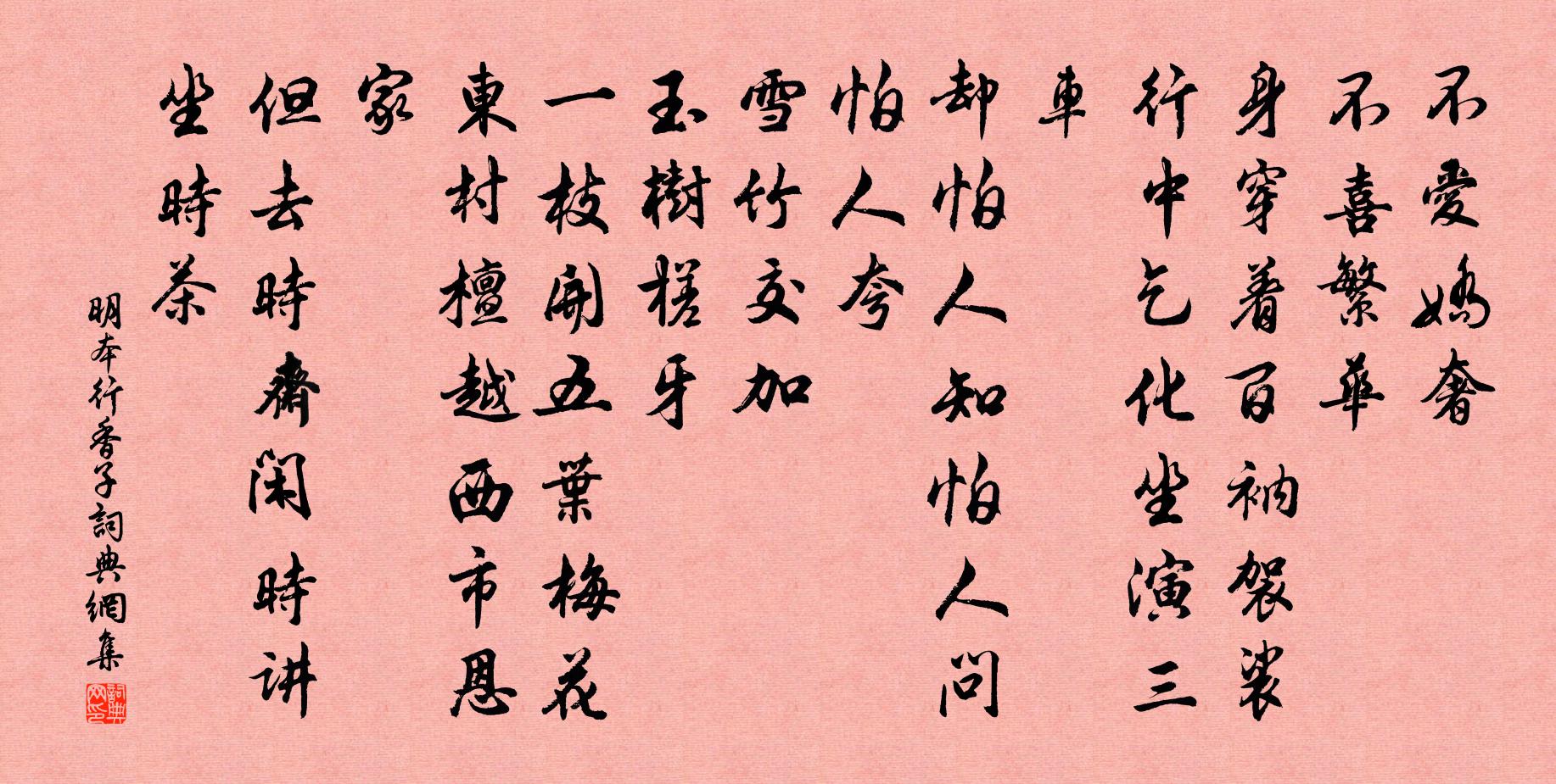 詩詞名句歷史字典書法欣賞書法字典國語詞典說文解字康熙字典古漢語字典標 題 作 者 詩 句 行香子作者:明本 朝代:元代行香子原文不愛嬌奢。不喜繁華。身穿著、百衲袈裟。行中乞化,坐演三車。卻怕人知,怕人問,怕人夸。雪竹交加。玉樹槎牙。一枝開、五葉梅花。東村檀越,西市恩家。但去時齋,閒時講,坐時茶。詩詞問答問:行香子的作者是誰?答:明本問:行香子寫於哪個朝代?答:元代問:行香子是什麼體裁?答:詞明本行香子書法欣賞行香子書法作品詩詞推薦台城路(歸杭)張炎〔宋代〕當年不信江湖老,如今歲華驚晚。路改家迷,花空陰落,誰識重來劉阮。殊鄉頓遠。甚猶帶羈懷,雁淒蛩怨。夢裡和山居趙希逢〔宋代〕峨雲羞殺鵕{儀去亻加鳥}冠,半掩山扉日不關。林下一般安分好,人生萬事轉頭間。忘機禽鳥傍人語,入暮牛羊鳴禽陸游〔宋代〕小徑霜泥結凍時,幽人十日廢筇枝。新晴池館春來早,簾外鳴禽聖得知。得所親廣州書陸游〔宋代〕音信連年恨不聞,書來細讀卻消魂。人稀野店山魈語,路僻 * 荔子繁。毒草自搖春寂寂,瘴雲不動晝昏昏。此生虎頭岩方信孺〔宋代〕絕壁空岩踞虎頭,鳥飛不渡野猿愁。人間有此真奇境,便好乘風訪十洲。用明發不寐有懷二人為韻寄李秉彝德叟黃庭堅〔宋代〕在昔授子書,髧彼垂兩發。乖離今十年,樹立映先達。青燈喔妙句,如酌春酒滑。把書念攜手,惆悵至明發。金剛隨機無盡頌福智無比分第二十四釋印肅〔宋代〕未抵如來智,通明成大慧。用處不換機,隱顯頭頭是。寄林竹豀釋文珦〔宋代〕四海寥寥孰可宗,唯知豀上有豀翁,乾坤盡入文心裡,今古同歸醉眼中。梅子熟時明祖意,竹君多處振清風。野人別曹教授三首裘萬頃〔宋代〕從渠柳色自青青,莫為行人賦渭城。只恐南牆舊時竹,誤隨風雨作離聲。寄賀田侍中東平功成王建〔唐代〕使回高品滿城傳,親見沂公在陣前。百里旗幡沖即斷,兩重衣甲射皆穿。探知點檢兵應怯,算得新移柵未堅。營被失調名佚名〔宋代〕一寸柔腸,如絲千結,不奈愁如鐵。岳陽樓·春色醉巴陵楊基〔明代〕春色醉巴陵,闌乾落洞庭。水吞三楚白,山接九疑青。空闊魚龍氣,嬋娟帝子靈。何人夜吹笛,風急雨冥冥。 寄漫客汪子美兼簡竹牖東美吳錫疇〔宋代〕雁斷無書到筆峰,暮雲空自滿江東。漫郎一片襟期杳,子美三生習氣同。身外有貲惟老硯,竹邊無價是清風。何時且坐令韓玉〔宋代〕閒院落。誤了清明約。杏花雨過胭脂綽。緊了鞦韆索。鬥草人歸,朱門悄掩,梨花寂寞。書萬紙、恨憑誰托。才封語兒見新月徐凝〔唐代〕幾處天邊見新月,經過草市憶西施。娟娟水宿初三夜,曾伴愁蛾到語兒。晨起陸游〔宋代〕衰老少睡眠,睡晚覺常早;五更攬衣起,漏鼓猶考考。青燈耿孤影,不睡坐亦好。讀盡一編書,南窗朝日杲。與毛茶乾趙司法游東湖四首任希夷〔宋代〕野迥塵襟豁,湖平望眼寬。山蹊新雪澗,木葉半霜乾。歲晚成三友,清游集四難。樂哉忘爾汝,臭味本芝蘭。送傳一新西上王邁〔宋代〕此去蘭宮好策勛,子行真足張吾軍。大鵬怒奮溟南翼,駿馬鳴驚冀並群。直要安排醫國策,不徒戲作送窮文。逢人資聖寺樓鑰〔宋代〕野溪清淺度危橋,徑策枯筇上紫霄。曉霧暗蒸山寺雨,松風深隱海門潮。浮杯水漲人何在,洗缽池清意已消。又上讀書陸游〔宋代〕束 * 交一世豪,暮年憔悴困蓬蒿。文辭博士書驢券,職事參軍判馬曹。病里猶須看周易,醉中亦復讀離騷。若為名句推薦城小賊不屠,人貧傷可憐元結《賊退示官吏》 日暮詩成天又雪,與梅並作十分春。盧梅坡《雪梅·其二》 雁起青天,數行書似舊藏處。吳文英《齊天樂·與馮深居登禹陵》 劉郎已恨蓬山遠,更隔蓬山一萬重!李商隱《無題·來是空言去絕蹤》 精誠由中,故其文語感動人深。王充《論衡·卷十三·超奇篇》 洛陽城東西,長作經時別。范雲《別詩》 丹灶初開火,仙桃正落花。孟浩然《清明日宴梅道士房 / 宴梅道士山房》 清明過了,不堪回首,雲鎖朱樓。朱淑真《眼兒媚·風日遲遲弄輕柔》 務本節用財無極。荀子《荀子·成相》 青女素娥俱耐冷,月中霜里斗嬋娟。李商隱《霜月》