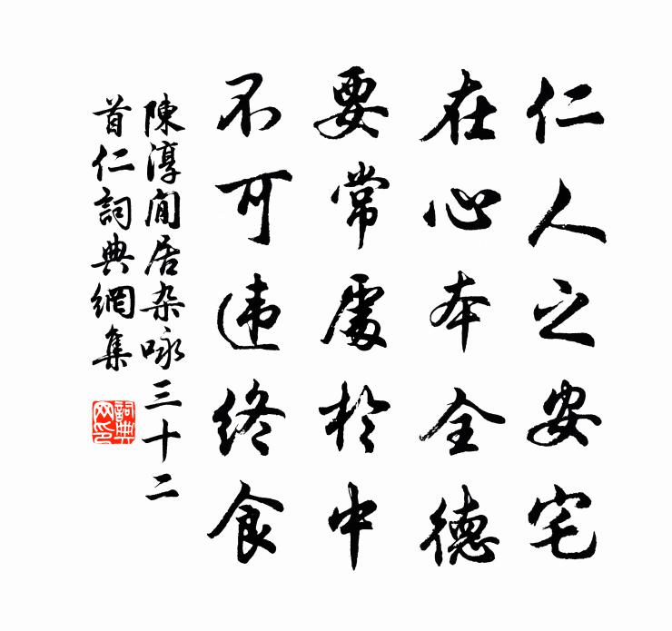 詩詞名句歷史字典書法欣賞書法字典國語詞典說文解字康熙字典古漢語字典標 題 作 者 詩 句 閒居雜詠三十二首仁作者:陳淳 朝代:宋代閒居雜詠三十二首仁原文仁人之安宅,在心本全德。要常處於中,不可違終食。詩詞問答問:閒居雜詠三十二首仁的作者是誰?答:陳淳問:閒居雜詠三十二首仁寫於哪個朝代?答:宋代陳淳閒居雜詠三十二首仁書法欣賞閒居雜詠三十二首仁書法作品詩詞推薦梅花喜神譜爛熳二十八枝宋伯仁〔宋代〕秀鐵壓肩寒,中原思未報。何日報邊塵,別裹朝天帽。登城周霆震〔元代〕世祖艱難德澤深,風悲城郭怕登臨。九朝天下俄川決,七載江南竟陸沉。馬骨空傳當日價,雞聲不到暮年心。雨余偈頌一百三十六首釋惟一〔宋代〕我與黃面老漢,有千古不忘之恨,甚欲爛槌一頓。今日因甚放過,老不以筋力為能。偈頌一百零二首釋紹曇〔宋代〕西子湖邊泛渺茫,一堤寒綠看垂楊。誰知業債難逃避,開眼堂堂入鑊湯。又布袋贊釋道璨〔宋代〕明皎皎,暗昏昏,未曾舉首,爍破面門。若更停機停思,苦哉彌勒世尊。漁家傲引洪适〔宋代〕長浮家而醉月,更輟棹以吟風。樂哉生涯,翻在樂府。相煩女伴,漁父分行。正月東風初解凍。漁人撒網波紋動。臨川投贈黃彥平〔宋代〕發策魁丹陛,摛文重禁林。麒麟鞭縷玉,菡萏燭搖金。事與京塵改,愁將瘴發侵。東還應晚合,未用歡升沉。題報恩方丈宋子展所作墨竹馮時行〔宋代〕叢筠抱清節,茂若含幽翠。孤樹老風霜,空枝少春意。其中有磐石,人莫知其器。堅頑如我心,脫盡榮枯累。畫不潁川賞花二首陳襄〔宋代〕間入郊園駐隼旟,百花紅紫萬千株。如何春意多風雨,不惜漫天錦繡鋪。梅陽郡齋鐵庵梅花五首蒲壽宬〔宋代〕廣平一寸鐵,不信句煉柔。猶疑雪月競,韜玉無處求。神人藐姑射,夜趁嫦娥游。縹緲不可見,天風想琳璆。郡齋移杉韋應物〔唐代〕擢乾方數尺,幽姿已蒼然。結根西山寺,來植郡齋前。新含野露氣,稍靜高窗眠。雖為賞心遇,豈有岩中緣。多麗張孝祥〔宋代〕景蕭疏,楚江那更高秋。遠連天,茫茫都是,敗蘆枯蓼汀洲。認炊煙,幾家蝸舍,映夕照,一簇漁舟。去國雖遙,東門行張詠〔宋代〕茫茫六合生萬靈,周公孔子留賢名。伊余志尚未著調,秋風拔劍東門行。金龜典酒知是誰,逢君使我抬雙眉。眼前宿竇使君莊水亭白居易〔唐代〕使君何在在江東,池柳初黃杏欲紅。有興即來閒便宿,不知誰是主人翁。甯橋小渡楊萬里〔宋代〕橋壞仍泥滑,舟橫隔水呼。岸頭危徑窄,轎子莫人扶。午漏相將里,秋陽未肯無。明知近前店,暗覺展修途。趙延俊毀淫祠詩以美之丘葵〔宋代〕風霆妙流行,日月互出沒。鬼神本良能,一氣自伸屈。南方有妖魂,緇衣而血食。因訟默祈呼,桎梏脫頃刻。逆迪一字至十字成章二首詠石文同〔宋代〕石,石,陰黑,陽白。岸胚胎,山骨骼。天地鎔鑄,鬼神刻畫。鯤鯢張怒眼,虎兕交斗額。敲如溫玉聲清,洗似精歷陽壯士勤將軍名思齊歌李白〔唐代〕歷陽壯士勤將軍,神力出於百夫,則天太后召見,奇之,授游擊將軍,賜錦袍玉帶,朝野榮之。後拜橫南將軍。大平江道中王炎〔宋代〕筍輿踏瘦石,揮汗日亭午。山斷忽眼明,人家住溪滸。解衣近綠陰,隔枝鳥相語。好風送涼來,坐久失畏暑。潭潭句劉倓〔宋代〕江南春晚經行地,賸有唐昌玉蕊花。露綺煙絺無限態,冰清玉潤自成葩。名句推薦武公不但歌淇澳,賢女猶能唁衛侯。姜塘《摘星樓九日登臨》 小扇引微涼,悠悠夏日長。顧太清《菩薩蠻·端午日詠盆中菊》 性靜情逸,心動神疲。周興嗣《千字文·全文》 三代之得天下也以仁,其失天下也以不仁。孟子《孟子·離婁章句上·第三節》 夫孝者,善繼人之志,善述人之事者也。子思《中庸·第十九章》 易得凋零,更多少無情風雨趙佶《宴山亭·北行見杏花》 匝路亭亭艷,非時裛裛香。李商隱《十一月中旬至扶風界見梅花》 朱門酒肉臭,路有凍死骨。杜甫《自京赴奉先縣詠懷五百字 / 自京赴奉先詠懷五百字》 七國三邊未到憂,十三身襲富平侯李商隱《富平少侯》 乃知兵者是兇器,聖人不得已而用之。李白《戰城南》
