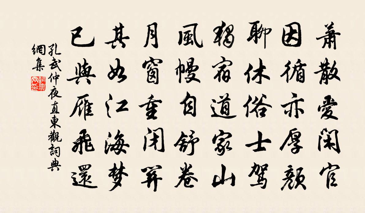 詩詞名句歷史字典書法欣賞書法字典國語詞典說文解字康熙字典古漢語字典標 題 作 者 詩 句 夜直東觀作者:孔武仲 朝代:宋代夜直東觀原文蕭散愛閒官,因循亦厚顏。聊休俗士駕,獨宿道家山。風幔自舒捲,月窗重閉關。其如江海夢,已與雁飛還。詩詞問答問:夜直東觀的作者是誰?答:孔武仲問:夜直東觀寫於哪個朝代?答:宋代孔武仲夜直東觀書法欣賞夜直東觀書法作品詩詞推薦永嘉鹿鳴宴吳泳〔宋代〕人間富貴易浮沈,只有斯文無古今。義理工夫元坦易,聖賢言語不艱深。莫隨近世諸儒轍,要識開山一祖心。待得挽鄭瑞州劉克莊〔宋代〕召來未得久居中,麾去安知尚不容。虹臥雪濤懷舊惠,馬跑白日掩新封。村邊宅昔鄰王翰,冢上碑今愧蔡邕。綠樹讀通鑑雜興孫應時〔宋代〕建安社稷看文舉,正始風流倚太初。天地一身無處著,諸人休苦恨狂疏。古梅蕭德藻〔宋代〕湘妃危立凍蛟背,海月冷掛珊瑚枝。醜怪驚人能嫵媚,斷魂只有曉寒知。寄故人(一作杜羔妻詩)張窈窕〔唐代〕淡淡春風花落時,不堪愁望更相思。無金可買長門賦,有恨空吟團扇詩。直台元稹〔唐代〕麋入神羊隊,鳥驚海鷺眠。仍教百餘日,迎送直廳前。上南行十二首方回〔宋代〕君子貴淡交,不在杯炙間。主人苦留客,因辭乃得還。中道逢故舊,酒肉又如山。半醉可以去,豈不知時艱。和桃花因戲如晦陳襄〔宋代〕顏色已饒丹杏蕊,馨香不減雪梅疏。自從移入青陽觀,前度劉郎記得無。感秋五首楊萬里〔宋代〕平生畏長夏,一念願清秋。如何遇秋至,不喜卻成愁。書冊秋可讀,詩句秋可搜。永夜宜痛飲,曠野宜遠遊。江南浣溪沙 臨川別席張翥〔元代〕昨夜花前送玉鍾。綠鬟歌罷落梅風。不知離思為誰濃。醉語低回銀燭背,夢雲重疊繡幃中。只愁歸路見芙蓉。別離情所鍾十二章章四句送定叟弟之官嚴陵張栻〔宋代〕藐茲遺體重,相對子與予。祝子以自愛,念不忝厥初。臨江仙(約同官出郊)侯置〔宋代〕一抹煙林屏樣展,輕花岸柳無邊。連朝春雨漲平川。冬冬迎社鼓,渺渺下陂船。同事多才饒我懶,乘閒縱飲郊園。銅雀台劉庭琦〔唐代〕銅台宮觀委灰塵,魏主園林漳水濱。即今西望猶堪思,況復當時歌舞人。訴衷情張元乾〔宋代〕兒時初未識方紅。學語問西東。對客呼為紅蕊,此興已偏濃。嗟白首,抗塵容。費牢籠。星球何在,鶴頂長丹,誰亦好園菊花盛開為賦二絕喻良能〔宋代〕窮秋籬落日蕭蕭,淺笑臨風畫亦勞。徹骨清寒香未了,落英猶更入離騷。次韻春日即事李彌遜〔宋代〕小雨絲絲欲網春,落花狼藉近黃昏。車塵不到張羅地,宿鳥聲中自掩門。題尤溪趙氏連桂堂劉克莊〔宋代〕一從五竇聯芳後,直至君家四桂堂。莫是燕山傳下本,又疑蟾窟摘來香。即今錄續題千佛,伊昔栽培記十郎。卻笑偈頌二十九首釋雲〔宋代〕參禪人,莫造作。擬心即差,動念即錯。大乘小乘,錢貫井索。前三後三,佛手驢腳。開眼也著,合眼也著。擬向依韻和吳相公南效春晴題齋宮壁王珪〔唐代〕玉津馳馬柳風斜,雨急金鱗走御沙。南畝農民望新霽,不勞雲意苦相遮。勸夢得酒白居易〔唐代〕誰人功畫麒麟閣?何客新投魑魅鄉?兩處榮枯君莫問,殘春更醉兩三場。名句推薦晴煙漠漠柳毿毿,不那離情酒半酣。韋莊《古離別》 不患人之不己知,患不知人也。孔子弟子《論語·學而篇》 荷葉五寸荷花嬌,貼波不礙畫船搖;石濤《荷花》 竹樹帶飛嵐,荇藻俱明麗。劉道著《湘江秋曉》 離多最是,東西流水,終解兩相逢。晏幾道《少年游·離多最是》 曉雞驚樹雪,寒鶩守冰池。李商隱《幽居冬暮》 晴風初破凍,柳眼梅腮,已覺春心動。李清照《蝶戀花·暖雨晴風初破凍》 白鳥明邊帆影直。隔江聞夜笛。周密《聞鵲喜·吳山觀濤》 水是眼波橫,山是眉峰聚王觀《卜運算元·送鮑浩然之浙東》 澹月梨花,借夢來、花邊廊廡。史達祖《解佩令·人行花塢》