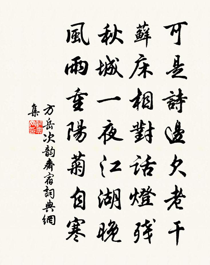 詩詞名句歷史字典書法欣賞書法字典國語詞典說文解字康熙字典古漢語字典標 題 作 者 詩 句 次韻齋宿作者:方岳 朝代:宋代次韻齋宿原文可是詩邊欠老乾,蘚床相對話燈殘。秋城一夜江湖晚,風雨重陽菊自寒。詩詞問答問:次韻齋宿的作者是誰?答:方岳問:次韻齋宿寫於哪個朝代?答:宋代方岳次韻齋宿書法欣賞次韻齋宿書法作品詩詞推薦泝江濡滯胡寅〔宋代〕何處難忘酒,舟行不進時。漫流迷縴道,數日誚篙師。近樹久猶見,遠山都未移。此時無一盞,吾意亦紓遲。哭盧仝賈島〔唐代〕賢人無官死,不親者亦悲。空令古鬼哭,更得新鄰比。平生四十年,惟著白布衣。天子未辟召,地府誰來追。長安歲杪送同官趨朝周南〔宋代〕異縣飄零興已闌,更來樓上說加餐。不知壯日消磨已,也似中年賦別難。酒盡沙頭悲夜水,書來日腳是春殘。人生與羅隱互謔顧雲〔唐代〕青蠅被扇扇離席, ——顧雲白澤遭釘釘在門。 ——羅隱送張及三人赴舉張詠〔宋代〕才雄揚子云,古稱蜀川秀。千載遺英聲,三賢繼其後。文章積學成,孝友亦天授。遠郡得充庭,期將免固陋。秋雨初霽試筆陸游〔宋代〕墨入紅絲點漆濃,閒將倦筆寫秋容。雨聲已斷時聞滴,雲氣將歸別起峰。斜日半穿臨水竹,好風遙送隔城鍾。遠遊生日王諶〔宋代〕又是逢初度,紅稀綠暗時。自斟生日酒,閒理去年詩。活計惟書在,衰容只鏡知。人情與天道,翻覆似枯棋。西江月姚述堯〔宋代〕嫩綠煙籠碎玉,繁紅日護香綃。故人去後恨迢迢。獨倚危樓情悄。脈脈望窮雲杪,看看月上花梢。嫩添金鴨任煙消題澹山岩蔣緯〔宋代〕風生崖木響,靄散洞門寬。幽徑盤危入,青天一面看。三冬僧定煖,五月客游寒。縱有通神筆,亦應圖出難。謝趙使君豁租劉宰〔宋代〕長榜朱書又墨書,使君頒令豁逃租。一千里內歡聲滿,十數年來此事無。次韻邑宰徐何慊出示所作五首陳著〔宋代〕笠戰西風馬噴沙,帆檣迎浪舞神鴉。調舟欲助江流柿,入海非求棗似瓜。歸客迂尋桑社景,吟鞭香帶木犀花。行邊飲後夜醒白居易〔唐代〕黃昏飲散歸來臥,夜半人扶強起行。枕上酒容和睡醒,樓前海月伴潮生。將歸粱燕還重宿,欲滅窗燈卻復明。直至五湖汪遵〔唐代〕已立平吳霸越功,片帆高揚五湖風。不知戰國官榮者,誰似陶朱得始終。巾子峰楊蟠〔宋代〕首出群山內,晴窗幾處看。不因風雨折,開檻滿溪寒。池亭待月二首李彌遜〔宋代〕不寐池塘夜,蕭蕭夏木重。亭虛風趁客,水淨月隨儂。蛙喜鳴如吹,蟬飢語似蛩。一區真自足,何地肯相容。辟戴帥初食長菜陳著〔宋代〕漂泊無家杜少陵,兵閒奔走如蓬萍。碧澗香芹因可嗜,膾鯉豈厭銀絲精。百謫九死蘇玉局,到處為鄉心自足。有時我歸遭雨曾豐〔宋代〕莫予我衣,衣於公府。我歸遭雨,我不以為苦也。和尉遲侍郎夏杪聞蟬戴叔倫〔唐代〕楚人方苦熱,柱史獨聞蟬。晴日暮江上,驚風一葉前。盪搖清管雜,幽咽野風傳。旅舍聞君聽,無由更晝眠。幽居書事陸游〔宋代〕莫嘆人間苦不諧,清時有味是歸來。已因積毀成高臥,更借陽狂護散才。正欲清言聞客至,偶思小飲報花開。紛紛丞相王公輓詞喻良能〔宋代〕疇昔翹材館,疏庸獲屢游。袞衣無傲色,吐握有勤求。輔弼十年久,雍容片善收。至今天下士,語及淚交流。名句推薦水天清話,院靜人銷夏。項鴻祚《清平樂·池上納涼》 可憐九月初三夜,露似真珠月似弓。白居易《暮江吟》 待到山花爛漫時,她在叢中笑。 * 《卜運算元·詠梅》 一枕新愁,殘夜花香月滿樓。項鴻祚《減字木蘭花·春夜聞隔牆歌吹聲》 爐火照天地,紅星亂紫煙。李白《秋浦歌十七首》 無可奈何花落去,似曾相識燕歸來。晏殊《浣溪沙·一曲新詞酒一杯》 倉稟無宿儲,徭役猶未已。韋應物《觀田家》 立身成敗,在於所染吳兢《貞觀政要·卷十·論慎終》 存亡在虛實,不在於眾寡。韓非及後人《韓非子·安危》 何日平胡虜,良人罷遠征。李白《子夜吳歌·秋歌》
