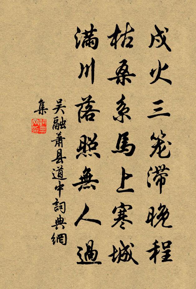 詩詞名句歷史字典書法欣賞書法字典國語詞典說文解字康熙字典古漢語字典標 題 作 者 詩 句 蕭縣道中作者:吳融 朝代:唐代蕭縣道中原文戍火三籠滯晚程,枯桑系馬上寒城。滿川落照無人過,詩詞問答問:蕭縣道中的作者是誰?答:吳融問:蕭縣道中寫於哪個朝代?答:唐代問:蕭縣道中是什麼體裁?答:七律吳融蕭縣道中書法欣賞蕭縣道中書法作品注釋全唐詩:卷686-62詩詞推薦和吳夢授韻王炎〔宋代〕卷舒有道在隨時,隱約何須感慨為。末路老夫甘退縮,華途吾友尚驅馳。準繩行義當趨正,淘練文章自出奇。舉世頌古十七首釋師觀〔宋代〕臘月火燒山,毫髮不相瞞。佛手遮不得,人心似等閒。和道溪君別業(一作和友人溪居別業)溫庭筠〔唐代〕積潤初銷碧草新,鳳陽晴日帶雕輪。風飄弱柳平橋晚,雪點寒梅小苑春。屏上樓台陳後主,鏡中金翠李夫人。花房書懷寄劉五楊億〔宋代〕風波名路壯心殘,三徑荒涼未得還。病起東陽衣帶緩,愁多騎省髩毛斑。五年書命塵西閣,千古移文愧北山。獨憶梅釋行海〔宋代〕占斷江南第一春,偏同雪月斗精神。東君曾許殘花片,妝點壽陽宮裡人。醉落魄/一斛珠黃庭堅〔宋代〕陶陶兀兀。尊前是我華胥國。爭名爭利休休莫。雪月風花,不醉怎生得。邯鄲一枕誰憂樂。新詩新事因閒適。東山尹洛日作呂蒙正〔宋代〕昔作儒生謁貢闈,今提相印出黃扉。九重鵷鷺醉中別,萬里煙霄達了歸。鄰叟盡垂新鶴髮,故人猶著舊 * 。洛陽偈頌七十二首釋祖欽〔宋代〕一杯晴雪早茶香,午睡方醒春晝長。拶著通身俱是眼,半窗疏影轉斜陽。出典宣城三首李含章〔宋代〕蘆花未白蓼初紅,綠水澄藍是處通。景色不須今日別,煙光仍與昔時同。馬嘶曉月思閒廄,帆掛秋光足便風。寄語句張林〔兩漢〕菱葉乍翻人采後,芰荷初沒舸行時。睡陸游〔宋代〕紙帳青氈暖有餘,昏昏信腳到華胥。凍醪有力勤推挽,春茗無端苦破除。半熟擁衾聞急雨,乍回推枕覓殘書。箇中春寒六首陳造〔宋代〕清明寒食經旬是,笑問風寒更幾餘。小杏惜香春恰恰,新楊弄影午疏疏。自庫八鎮十二里皆山徑刑侯以馬相招道間口占朱南傑〔宋代〕蹇驢突兀萬山間,欲雨還晴雪又慳。一路梅花尋不見,多應開向小溪灣。小說引子羅燁〔宋代〕破盡詩書泣鬼神,發揚義士顯忠臣。試開戛玉敲金口,說與東西南北人。送僧釋智圓〔宋代〕秋風吹行衣,舊山逍遙歸。齋盂滌空潭,古磬敲殘暉。須知高靜懷,杳與塵俗違。和孫端叟寺丞農具十五首其九台笠梅堯臣〔宋代〕力田冒風雨,緝籜為台笠。寒蓑相與用,陰野低迷入。足屨固易濡,鬢葆何嘗濕。斯須未可去,赫日資乃急。春暮寄友人俞桂〔宋代〕日暖梨花雪,風吹楊柳綿。春逾三月半,夢憶十年前。詩借鶯聲和,書無雁字傳。東君還似舊,吾鬢嘆皤然。游陽明洞天陳允平〔宋代〕萬木陰沉鎖石門,煙霞深處近崑崙。洞簫聲接玉台磬,寶蓋影搖金殿旛。湘浦有龍雲氣濕,越山無鶴露華昏。靈芝人月圓佚名〔宋代〕園林已有春訊息,尋待嶺頭梅。一枝清淡,疏疏帶雪,昨夜初開。芳心幾點,東風多少,先為傳來。不隨紅紫,紛大雲池泛舟李群玉〔唐代〕九月蓮花死,萍枯霜水清。船浮天光遠,棹拂翠瀾輕。古木□□□,了無煙靄生。游鱗泳皎潔,洞見逍遙情。漁父名句推薦登鸞車,侍軒轅,遨遊青天中,其樂不可言。李白《飛龍引二首·其一》 掛席幾千里,名山都未逢。孟浩然《晚泊潯陽望廬山》 愁與西風應有約,年年同赴清秋。史達祖《臨江仙·閨思》 恩疏寵不及,桃李傷春風。李白《上之回》 似花還似非花,也無人惜從教墜。蘇軾《水龍吟·次韻章質夫楊花詞》 辛勤三十日,母瘦雛漸肥。白居易《燕詩示劉叟》 黃昏院落,淒悽惶惶,酒醒時往事愁腸。李清照《行香子·天與秋光》 燕子飛時,綠水人家繞。枝上柳綿吹又少。蘇軾《蝶戀花·春景》 短夢依然江表,老淚灑西州。張炎《八聲甘州·記玉關踏雪事清游》 烏啼鵲噪昏喬木,清明寒食誰家哭。白居易《寒食野望吟》