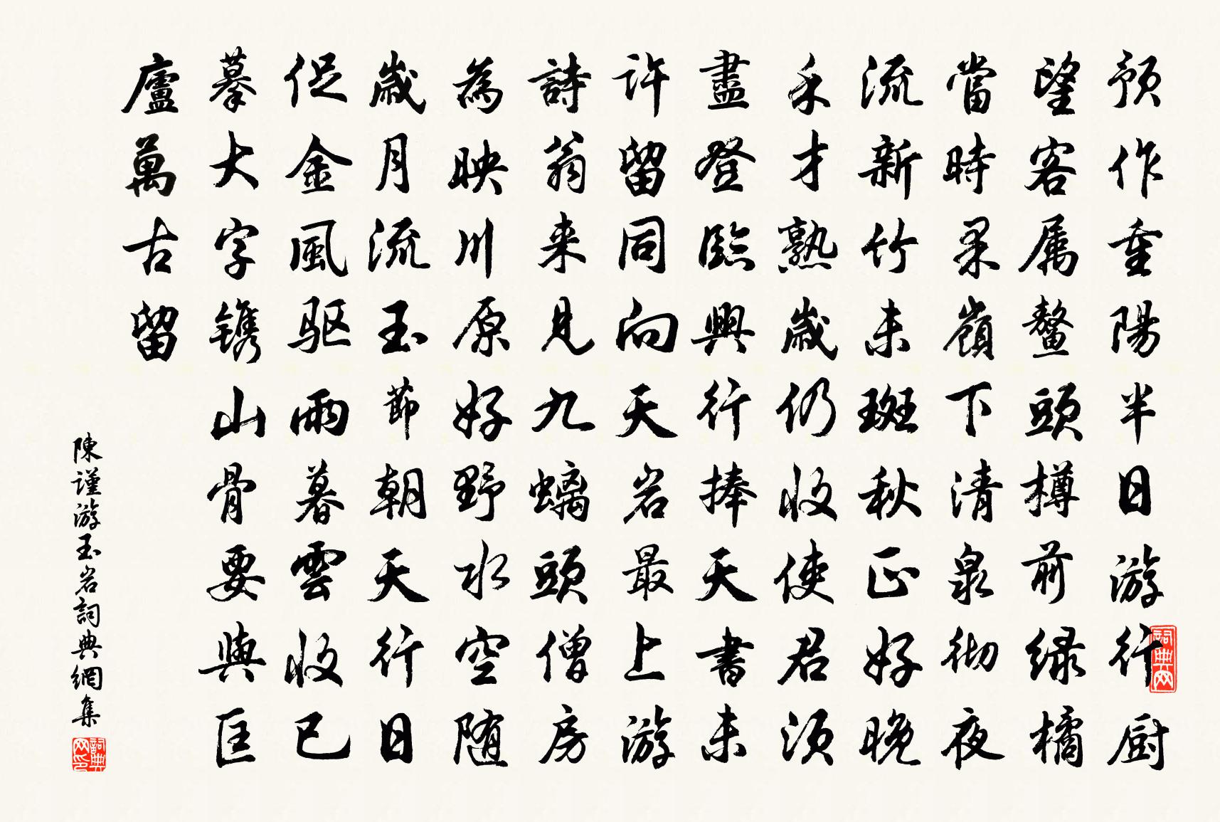 詩詞名句歷史字典書法欣賞書法字典國語詞典說文解字康熙字典古漢語字典標 題 作 者 詩 句 游玉岩作者:陳謹 朝代:宋代游玉岩原文預作重陽半日游,行廚望客屬鰲頭。樽前綠橘當時果,嶺下清泉徹夜流。新竹未斑秋正好,晚禾才熟歲仍收。使君須盡登臨興,行捧天書未許留。同向天岩最上游,詩翁來見九螭頭。僧房為映川原好,野水空隨歲月流。玉節朝天行日促,金風驅雨暮雲收。已摹大字鐫山骨,要與匡廬萬古留。詩詞問答問:游玉岩的作者是誰?答:陳謹問:游玉岩寫於哪個朝代?答:宋代陳謹游玉岩書法欣賞游玉岩書法作品詩詞推薦沁園春 寄劉光裔都事張之翰〔元代〕有手拿雲,有背摩空,相期昔年。記南方初下,送君硬語,東曹未滿,寄我奇篇。二十年間,數千里外,底事曾無故福建提刑鍾編修挽章二首曹彥約〔宋代〕江漢迎歸客,瀟湘問故人。錦衣新炫書,繡使近行春。坐對長沙酒,空傷夜雨神。南樓風月下,霏屑易成塵。上樞密生辰仲並〔宋代〕兒童猶解仰芬芳,合綴韓門弟子行。久矣飄蓬疏望履,幸哉擁篲即升堂。夔龍會合時千載,鷗鷺留連天一方。遙願德壽宮慶壽口號十篇楊萬里〔宋代〕清曉鞭聲出禁中,驚開剩雨及殘風。金鴉銜取紅鸞扇,飛上玻璃碧海東。展江亭海棠四首韓維〔宋代〕紅糝妝條嫋嫋長,人間不合有天香。千觴未足酬佳麗,回首東風更斷腸。濟錢清江高似孫〔宋代〕潮分殘力引船飛,一道浮暉入杳微。可惜梅皆容易落,相將雁又接連歸。依前清洛情猶在,覺道離騷事已非。倚枕村居二首陳造〔宋代〕卷書揩目小披襟,睡起初便茗碗深。一縷碧檀無與語,坐窗閒看竹移陰。春日病起釋文珦〔宋代〕暮景交朋盡,何人問死生。臥於蝸室底,看得鵲巢成。緣絕門常靜,心空疾漸平。又思扶杖出,溪上聽泉聲。上洪帥李伯紀丞相胡銓〔宋代〕相印橫拖御案前,聖恩暫許帥藩宣。舉幡北闕危三刖,抗疏南床忽十年。往事淒涼人墮甑,此身空潔鷺棲煙。當時偈頌一百零二首釋慧遠〔宋代〕一是二,二是三,咬定牙關徹底參。鬧浩浩時雙手擲,赤條條處兩肩擔。文殊老,強指南,□門三頓實難甘。五峰醉桃源 本名阮郎歸 釣烏林答二郎君王丹桂〔元代〕今生豪貴宿生緣。分明說與賢。回頭早早悟根原。休教俗境牽。搜秘密,訪幽玄。爐中鍊汞鉛。真功真行滿三千。疑山石泉魏野〔宋代〕閒翫正嚴凝,神和澹鏡澄。至清無隱物,微暖不生冰。派想河難雜,源疑濟是朋。窺魚光照鶴,洗缽影搖僧。逗石上蕭家峽黃庭堅〔宋代〕玉笥峰前幾百家,山明松雪水明沙。趁虛人集春蔬好,桑菌竹萌煙蕨芽。十六日出迓客趙蕃〔宋代〕逢迎非我事,且逐眾人行。粗識郊原趣,因茲詩句成。黃華菜誰主,自喚鳥何名。忽憶來時路,還思去日程。杏花天李萊老〔宋代〕年時中酒風流病。正雨暗、蘼蕪深徑。人家寒食煙初禁。狼藉梨花雪影。西湖夢、紅沈翠冷。記舞板、歌裙廝趁。寄天台守能上人釋智圓〔宋代〕台嶺林泉勝十洲,忘機長往更無愁。考槃高趣何人識,招隱新題幾處留。深夜定回華頂月,經年書斷海門秋。誰知次韻孫古岩冬景陳著〔宋代〕臘天風景最無常,兒造顛狂亦有方。將放雪飛連夜雨,欲留晴往一朝霜。城頭柳色吟邊動,山曲梅花夢裡香。身在霅溪夜宴詩(諸神命麗玉唱公無渡河歌)水神〔唐代〕濁波揚揚兮凝曉霧,公無渡河兮公竟渡。風號水激兮呼不聞,提衣看入兮中流去。浪排衣兮隨步沒,沈屍深入兮蛟黃刑部之陝西轉運楊億〔宋代〕百二秦川四塞寬,甘泉烽火報平安。泥書雙筆遷郎署,粒食千金仰縣官。江海斗生拋別墅,關山何日解征鞍。定將題吳仲微常齋李呂〔宋代〕達石情忘倦,移山志必通。朝朝勤甓運,井井策新功。名句推薦最無端處,總把良宵,只恁孤眠卻。柳永《尾犯·夜雨滴空階》 當家才知鹽米貴,養子方知父母恩。佚名《增廣賢文·上集》 馬者,所以命形也;白者,所以命色也。公孫龍《公孫龍子·白馬論》 得眾而不得其心,則與獨行者同實。管仲《管子·參患》 白馬黃金塞,雲砂繞夢思。李白《塞下曲六首》 上馬擊狂胡,下馬草軍書。陸游《觀大散關圖有感》 梅定妒,菊應羞。畫闌開處冠中秋。李清照《鷓鴣天·桂花》 醉臥沙場君莫笑,古來征戰幾人回?王翰《涼州詞二首·其一》 爭奈愁來,一日卻為長賀鑄《行路難·縛虎手》 江心雲帶蒲帆重,樓上風吹粉淚香。嚴仁《鷓鴣天·惜別》