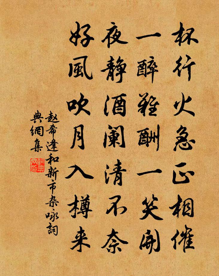 詩詞名句歷史字典書法欣賞書法字典國語詞典說文解字康熙字典古漢語字典標 題 作 者 詩 句 和新市雜詠作者:趙希逢 朝代:宋代和新市雜詠原文杯行火急正相催,一醉難酬一笑開。夜靜酒闌清不奈,好風吹月入樽來。詩詞問答問:和新市雜詠的作者是誰?答:趙希逢問:和新市雜詠寫於哪個朝代?答:宋代趙希逢和新市雜詠書法欣賞和新市雜詠書法作品詩詞推薦贈從弟弘元謝靈運〔南北朝〕視聽易狎。沖用難本。違真一差。順性誰卷。顏子悔傷。蘧生化善。心愧雖厚。行迷未遠。平生結誠。久要罔轉。頌古三首釋道行〔宋代〕不於三界現身意,誰謂維摩談不二。山空晝永鳥無聲,春光不在千花里。句熊蕃〔宋代〕禹鑿隋穿今古利,吳檣楚楫去來空。清平樂(次韻王武子寄遠)向滈〔宋代〕離愁萬斛。春思難拘束。瘦盡玉肌清徹骨。蹙損兩眉秀綠。畫屏羅幌輸君。文鱗錦翼尤勤。長記酒醒香冷,笑將髻郊廟歌辭。武后大享拜洛樂章。鹹和武則天〔唐代〕坎澤祠容備舉,坤壇祭典爰申。靈眷遙行秘躅,嘉貺薦委殊珍。肅禮恭禋載展,翹襟邈志逾殷。方期交際懸應,(秋懷十首汪莘〔宋代〕自分為人類魯皋,幾將心事泛吳舠。手搏日月供宸筆,揀盡金雞玉兔毫。舟中夕望陸游〔宋代〕船掠湖堤不入城,葛巾羽扇試春行。女牆迤邐橫輕靄,佛閣崢嶸倚晚晴。樹冒藤花堆故繡,風吹鶯語送新聲。細思句孫山〔宋代〕上州渾如枉死市,岢嵐彷佛似陽間。州廳設醮即事仇遠〔宋代〕去歲今朝六月六,暮雨傾盆風拔木。今歲公宇醮祈晴,晝日當空生暑溽。羽士宣詞官吏拜,燈燭熒煌香馥郁。須臾送胡伯逢之官金陵張栻〔宋代〕相望數舍已雲疎,遠別何因執子祛。漫仕想應同捧檄,舊聞當不廢觀書。月明淮水空陳跡,山繞新亭有故墟。暇日屈原宋庠〔宋代〕司命湘君各有情,九歌愁苦薦新聲。如何不救沈江禍,枉解堂中許目成。送林子方直閣秘書將漕閩部三首楊萬里〔宋代〕梅花國里荔枝村,頗記張燈作上元。一別頻蒙訪生死,七年再見劣寒溫。屬當閔雨祈群望,不得臨風共一尊。誰為落梅馮時行〔宋代〕不禁清瘦怯風霜,遠信先憑驛使將。樓上笛聲吹舊曲,鑒中人面學新姜。飄零院宇仍多思,點綴簾櫳亦自香。留與寄題程氏菊莊馬廷鸞〔宋代〕一觴浥露餐英美,八表同昏履運艱。芳節不隨籬下老,悠悠嘉氣眼中山。巫峽楊炯〔唐代〕三峽七百里,惟言巫峽長。重岩窅不極,疊嶂凌蒼蒼。絕壁橫天險,莓苔爛錦章。入夜分明見,無風波浪狂。忠信酹江月/念奴嬌周紫芝〔宋代〕冰輪飛上,正金波翻動,玉壺新綠。風帽還猗清露滴,凜凜微生寒粟。白玉樓高,水精簾卷,十里堆瓊屋。千山人睢陽五老會詩馮平〔宋代〕詔恩分務許優閒,肯借留都猙豸冠。名宦儻來空擾攘,丘園歸去好盤桓。醉遊春圃煙霞暖,吟聽秋潭水石寒。退傅橫吹曲辭雍台歌溫庭筠〔唐代〕太子池南樓百尺,八窗新樹疏簾隔。黃金鋪首畫鉤陳,羽葆亭童拂交戟。盤紆闌楯臨高台,帳殿臨流鸞扇開。早雁過商山齊己〔唐代〕疊疊疊嵐寒,紅塵翠里盤。前程有名利,此路莫艱難。雲水侵天老,輪蹄到月殘。何能尋四皓,過盡見長安。白苧歌釋居簡〔宋代〕經紗才上機,梭飛玉攕攕。怕君尋春遲,落機寬裁衫。春心亂如蓬,冉冉隨春霏。芳逕曉沾露,軟塵紅上衣。歸來名句推薦漫江碧透,百舸爭流。 * 《沁園春·長沙》 相呼相應湘江闊,苦竹叢深日向西。鄭谷《鷓鴣》 蟬鳴空桑林,八月蕭關道。王昌齡《塞下曲四首》 一日官軍收海服,驅牛駕車食牛肉,歸來攸得牛兩角。元稹《田家詞 / 田家行》 青苔滿階砌,白鳥故遲留。杜牧《題揚州禪智寺》 牽牛織女遙相望,爾獨何辜限河梁。曹丕《燕歌行二首·其一》 沉憂能傷人,綠鬢成霜蓬。李白《怨歌行》 為善則流芳百世,為惡則遺臭萬年。程登吉《幼學瓊林·卷三·人事》 是以動則必陷,為則必辱,是偏傷之患也。荀子《荀子·不苟》 渡頭楊柳青青。枝枝葉葉離情。晏幾道《清平樂·留人不住》