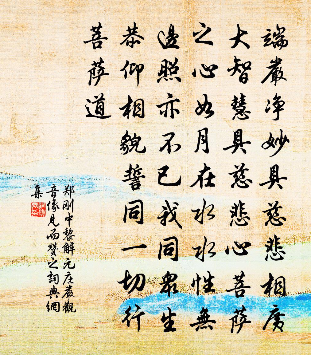 詩詞名句歷史字典書法欣賞書法字典國語詞典說文解字康熙字典古漢語字典標 題 作 者 詩 句 黎解元莊嚴觀音像見而贊之作者:鄭剛中 朝代:宋代黎解元莊嚴觀音像見而贊之原文端嚴淨妙,具慈悲相。廣大智慧,具慈悲心。菩薩之心,如月在水。水性無邊,照亦不已。我同眾生,恭仰相貌。誓同一切,行菩薩道。詩詞問答問:黎解元莊嚴觀音像見而贊之的作者是誰?答:鄭剛中問:黎解元莊嚴觀音像見而贊之寫於哪個朝代?答:宋代鄭剛中黎解元莊嚴觀音像見而贊之書法欣賞黎解元莊嚴觀音像見而贊之書法作品詩詞推薦金陵懷古唐彥謙〔唐代〕碧樹涼生宿雨收,荷花荷葉滿汀洲。登高有酒渾忘醉,慨古無言獨倚樓。宮殿六朝遺古蹟,衣冠千古漫荒丘。太平謁南嶽劉克莊〔宋代〕中原昔分裂,五嶽僅存一。嗟餘生東南,有眼乃未覿。清晨犯寒慄,馬上青歷歷。怪云何處來,對面失崷崒。午投醉歌行杜甫〔唐代〕陸機二十作文賦,汝更小年能綴文。總角草書又神速,世上兒子徒紛紛。驊騮作駒已汗血,鷙鳥舉翮連青雲。詞源游虎丘曾幾〔宋代〕誰能竟日把書看,盪槳扶筇十裡間。未辦深藏豹林谷,不妨時到虎丘山。秋來千頃境絕麗,老矣北窗人極閒。忽見賞春二首周文璞〔宋代〕賞春社裡鼓逢逢,尚恨聲同調不同。我亦明朝苦無事,更來吹笛亂山中。憶紫芝蘇泂〔宋代〕清才漫仕橐長空,末後翻身尚客中。便死托生都是妄,直疑君去作秋風。寄丁執中王洋〔宋代〕米監煎蹙意何如,盡日逍遙不費書。債作拘留身莫贖,詩成困痼力難除。事錢不謹兄移愛,與世留心客有餘。幸各銓瑣方岳〔宋代〕綠漬苔痕蝕斷碑,摩挲名字笑衰遲。雲寒昨夜人何似,雨鎖重門春不知。莫倚離騷堪仆命,從來造物亦兒痴。轉頭寄周韶州牟融〔唐代〕十年學道困窮廬,空有長才重老儒。功業要當垂永久,利名那得在須臾。山中荊璞誰知玉,海底驪龍不見珠。寄語山居詩釋延壽〔宋代〕退跡何人繼昔賢,凡途終是事謀先。只知競逐浮雲富,誰解驚嗟逝水年。寒影半疏霜後樹,秋聲千點雨中禪。千般搗練子馬鈺〔元代〕靈壽杖,獻夫人。撥開世綱易開塵。助行步,出愛津。打有著,拄為親。敲昏琢暗求清神。挑明月,顯至真。元獻晏公輓辭三首王安石〔宋代〕終賈年方妙,蕭曹地已親。優遊太平日,密勿老成人。抗論辭多秘,賡歌跡已陳。功名千載下,不負漢庭臣。惜分飛袁去華〔宋代〕雨過殘陽明遠樹。樹底鳴蟬無數。臨水人家住。靠西便入江南路。曲徑通幽深幾許。翠竹短窗無暑。小立憑肩語。雜賦陸游〔宋代〕中年畏病杯行淺,晚歲修真食禁多。謝客杜門殊省事,一盂香飯養天和。盧誼伯宜之見過要斯遠同賦以贈二首趙蕃〔宋代〕近別溪山郡,忽過風雨村。濁醪成共把,佳句得深論。舊價真齊駱,新題復到元。從今得還往,寧只問寒暄。周彥廣待制輓詞韓元吉〔宋代〕淮海歡騰五袴歌,政聲京光益中和。鄴侯井在功堪紀,鄭國渠成利更多。紫禁遄躋知異眷,珍台歸臥本微疴。功名張守送羊羔酒將以三絕次韻答之陳造〔宋代〕小槽清凝帶羶香,釀法知非羸角羊。拜賜未辭乾講舌,呼兒留得薦蒸嘗。衛公堂二首曾協〔宋代〕衛公精爽故依然,陳跡淒涼不記年。亭遠謾傳曾起草,樓高無復見籌邊。新銘初勒風煙上,舊觀都忘歲月遷。從此水調歌頭(送王景文)李處全〔宋代〕上馬趣攜酒,送客古朱方。秋風斜日山際,低草見牛羊。酩酊不知更漏,但見橫江白露,清映月如霜。平睨廣寒殿和王右司游南嶽三絕王炎〔宋代〕喬嶽雄於楚粵間,眾丘迤邐釀高寒。青藜拄到雲霄上,見得心如眼界寬。名句推薦積土成山,風雨興焉;積水成淵,蛟龍生焉;荀子《勸學》 及茲春未深,數畝猶足佃。王守仁《謫居糧絕請學於農將田南山詠言寄懷》 枕上潛垂淚,花間暗斷腸。魚玄機《贈鄰女 / 寄李億員外》 塞上秋風鼓角,城頭落日旌旗。元好問《江月晃重山·初到嵩山時作》 山重水複疑無路,柳暗花明又一村。陸游《游山西村》 綠葉紫裹,丹莖白蒂。宋玉《高唐賦》 一年將盡夜,萬里未歸人。戴叔倫《除夜宿石頭驛》 落花狼藉酒闌珊,笙歌醉夢間。李煜《阮郎歸·呈鄭王十二弟》 花謝花飛花滿天,紅消香斷有誰憐。曹雪芹《紅樓夢·第二十七回》 眼覷著災傷教我沒是處,只落得雪滿頭顱。張養浩《一枝花·詠喜雨》