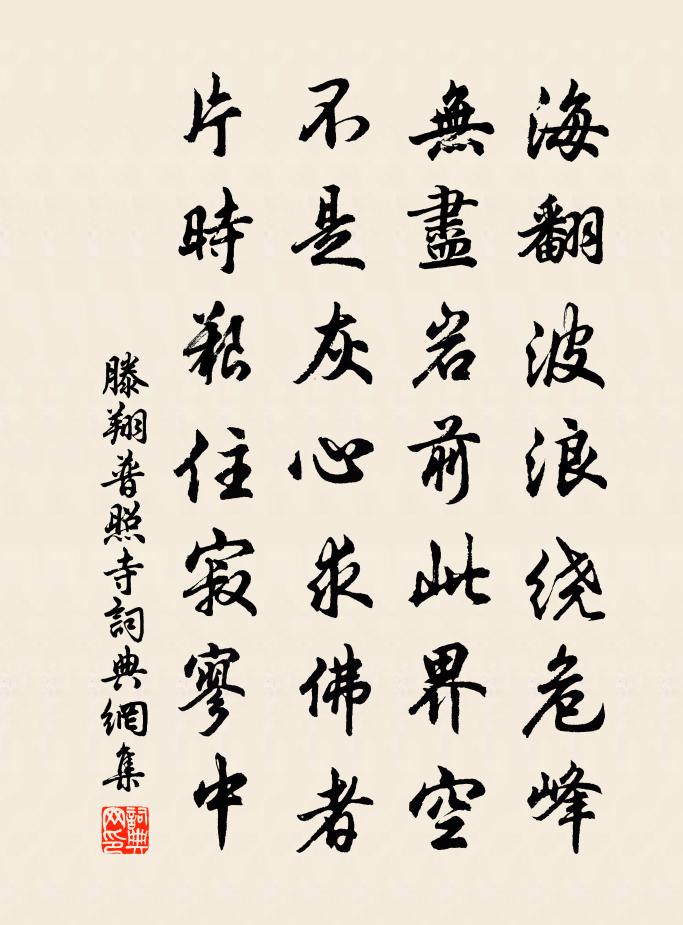 詩詞名句歷史字典書法欣賞書法字典國語詞典說文解字康熙字典古漢語字典標 題 作 者 詩 句 普照寺作者:滕翔 朝代:宋代普照寺原文海翻波浪繞危峰,無盡岩前此界空。不是灰心求佛者,片時艱住寂寥中。詩詞問答問:普照寺的作者是誰?答:滕翔問:普照寺寫於哪個朝代?答:宋代滕翔普照寺書法欣賞普照寺書法作品詩詞推薦鄭寺正輓辭王柏〔宋代〕北山崚嶒兮配井絡之勛名,子孫繩繩兮聿彰厥聲。一麾不顧兮番禺君,甘領祠官兮掛長纓。操存益固兮涵養益深,【雙調】賣花聲喬吉〔元代〕悟世肝腸百鍊爐間鐵,富貴三更枕上蝶,功名兩字酒中蛇。尖風薄雪,殘杯冷炙,掩清燈竹籬茅舍。太平吳氏樓會瀨上貞女祠周文璞〔宋代〕估客征夫上野橋,錦縭玉瑱亦蕭條。人間多少乘除事,到了英雄恨不消。清平樂劉敏中〔元代〕繁華敢望。自喜清貧狀。老屋三間空蕩蕩。幾冊閒書架上。客來或問中庵。平生虎穴曾探。隱几悠然不答,窗間笑田家作貫休〔唐代〕田家老翁無可作,晝甑蒸梨香漠漠。只向階前曝背眠,赤桑大葉時時落。古氵塹侵門桃竹密,倉囤峨峨欲遮日。自慈雲嶺韓元吉〔宋代〕極目慈雲路,看山立少時。湖光經雨闊,柳色泥煙垂。琢石觀蹲獸,鐫崖讀斷碑。西關知底險,撫掌笑兒嬉。雨中四首趙蕃〔宋代〕稍稍風頭變,侵侵雨腳來。峰巒忽成暗,雲霧亦旋開。謾易炎涼候,無矜狡獪才。天高獨鳥度,林合亂蟬哀。鷓鴣天(別許侍郎奕即席賦)魏了翁〔宋代〕公在春官我已歸。公來東蜀我居西。及公自遂移潼日,正我由潼使遂時。如有礙,巧相違。人生禁得幾分飛。只祈郴州送許叔獻員外赴道州張舜民〔宋代〕嶺下為遷客,人中得老成。傳經漢丞相,授講魯諸生。五斗青衫色,三湘白髮莖。話言猶未盡,要作道州行。七女峰白玉蟾〔宋代〕宋時松竹晉時苔,路轉山回洞戶開。流水也知塵世雜,依然流向此山來。和吳沖卿雪霽紫宸朝王安石〔宋代〕虎士開閶闔,雞人唱九霄。雲移銀闕角,日轉玉廊腰。箒動川收潦,靴鳴海上潮。舞袍沾宿潤,拜笏擁殘飄。賜飲答河南李士巽題香山寺韋應物〔唐代〕洛都遊宦日,少年攜手行。投杯起芳席,總轡振華纓。關塞有佳氣,岩開伊水清。攀林憩佛寺,登高望都城。蹉跎和張憲登烏尤山吳泳〔宋代〕世塗偪仄動逢尤,山似高人色頗驕。寸碧亭亭還綠繞,知音不待爨桐焦。送紹興葉帥改當塗徐元傑〔宋代〕人言禹會即當塗,上曰蕪湖抵鑑湖。姑少副公求去爾,匪伊有詔盍歸乎。知心霜月渾無滓,回首春風定與俱。慙愧送圓載上人歸日本國皮日休〔唐代〕講殿談余著賜衣,椰帆卻返舊禪扉。貝多紙上經文動,如意瓶中佛爪飛。颶母影邊持戒宿,波神宮裡受齋歸。家山贊胡家宋真宗〔宋代〕一門三刺史,四代五尚書。他族未聞有,朕今止見胡。禪人並化主寫真求贊釋正覺〔宋代〕教示無轍跡,贊之絕涯岸。才發名言,便成形段。月蘆混處鳴鷗,天水連時沒雁。而今對現十成,向道只得一半。再用韻鄧深〔宋代〕葛巾藜杖款重關,不獨風流識謝安。蘭玉滿庭驚醉眼,雲煙落紙照衰顏。也知鴻雁行應起,莫管鳧鷗盟漸寒。自笑直瀆楊修〔宋代〕晝役人功夜鬼功,陽開陰闔幾時終。不聞擲土江中語,爭得盈流一水通。上張丞相十首張元乾〔宋代〕百六古今有,兩宮開闢無。興師誠刷恥,奮袂競捐軀。必挾三靈助,能令萬國孚。九宮驅六甲,何患五單于。名句推薦隔岸荒雲遠斷,繞磯小樹微明。歸莊《錦堂春·半壁橫江矗起》 與人善言,暖於布帛;傷人之言,深於矛戟。荀子《荀子·榮辱》 死去元知萬事空,但悲不見九州同。陸游《示兒》 開到荼蘼花事了。曹雪芹《紅樓夢·第六十三回》 雨打梨花深閉門,忘了青春,誤了青春。唐寅《一剪梅·雨打梨花深閉門》 被酒莫驚春睡重,賭書消得潑茶香,當時只道是尋常。納蘭性德《浣溪沙·誰念西風獨自涼》 草色全經細雨濕,花枝欲動春風寒。王維《酌酒與裴迪》 雨歇梧桐淚乍收,遣懷翻自憶從頭。納蘭性德《浣溪沙·雨歇梧桐淚乍收》 黃衫飛白馬,日日青樓下。陳克《菩薩蠻·赤闌橋盡香街直》 意少一字則義闕,句長一言則辭妨劉勰《文心雕龍·書記》